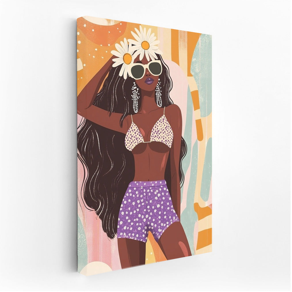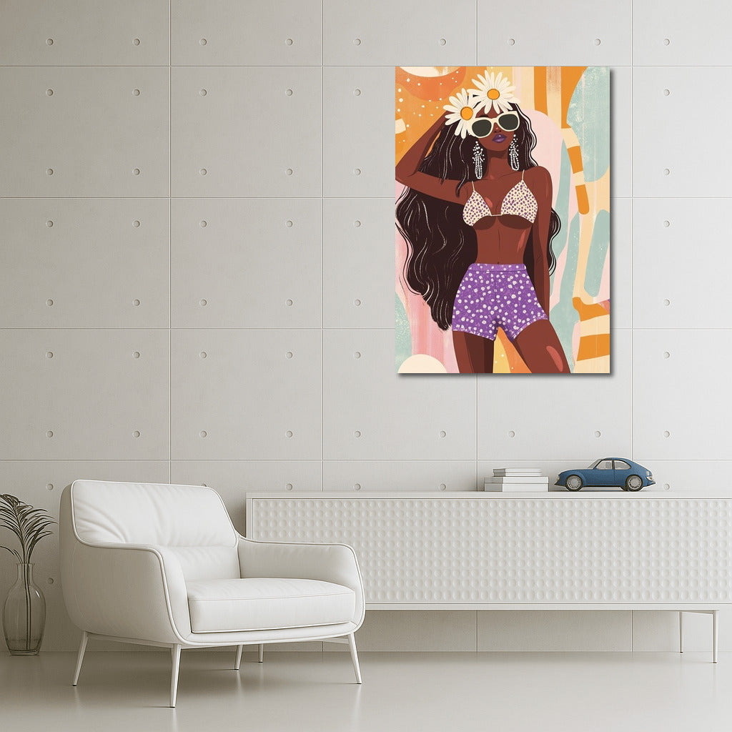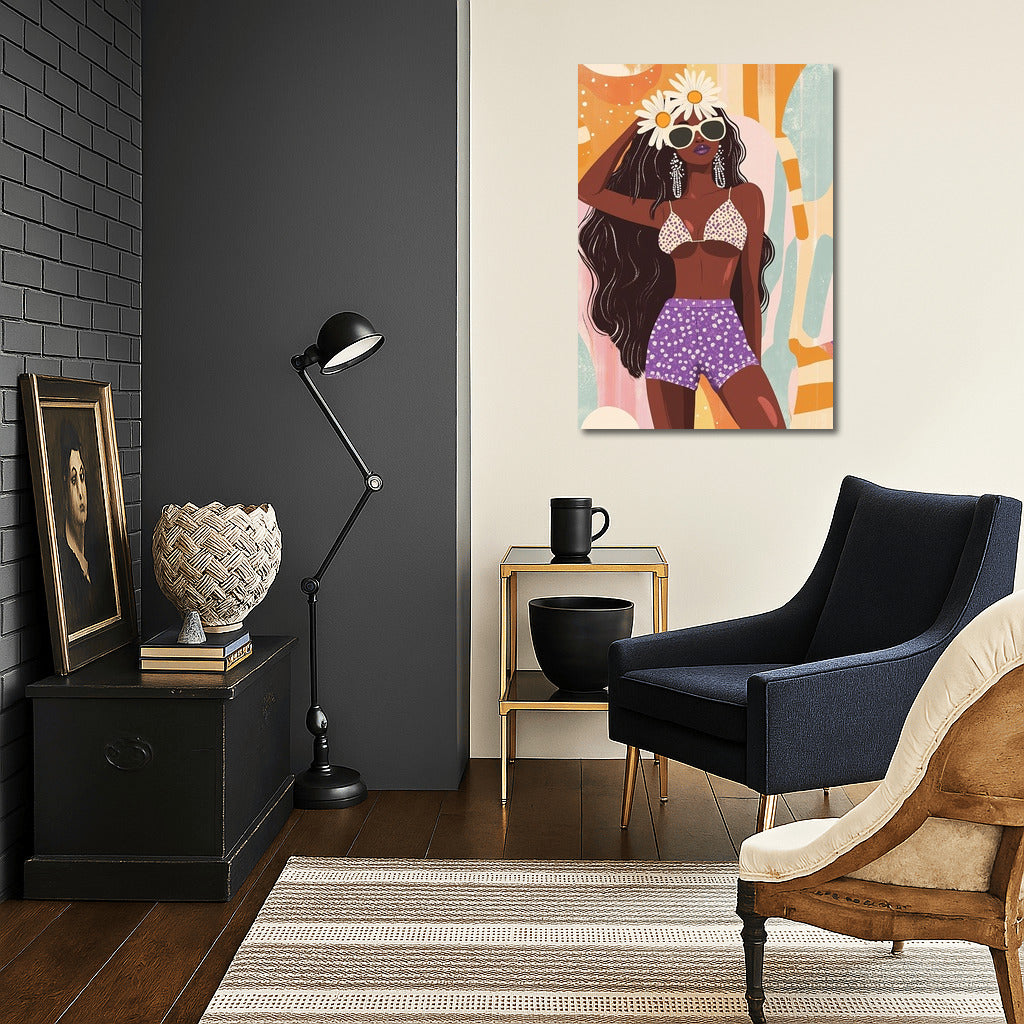 A bright painting with a fantasy character: glasses, daisies and a sea of summer mood. A poster for stylish wall art. See more from the collection: Mixed Wall Art