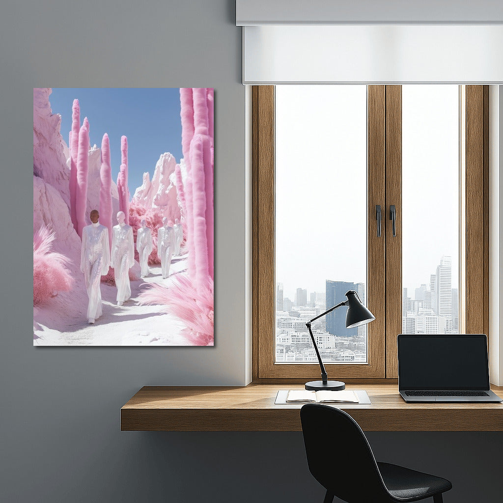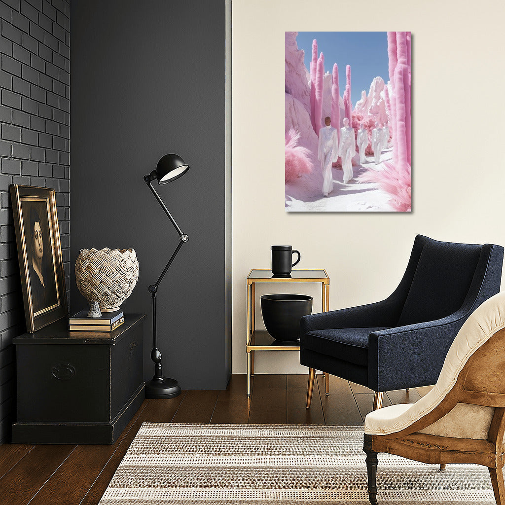 Dive into a world of fantasy with this poster: mysterious figures walk among pink landscapes, bringing life to your interior. See more from the collection: Mixed Wall Art