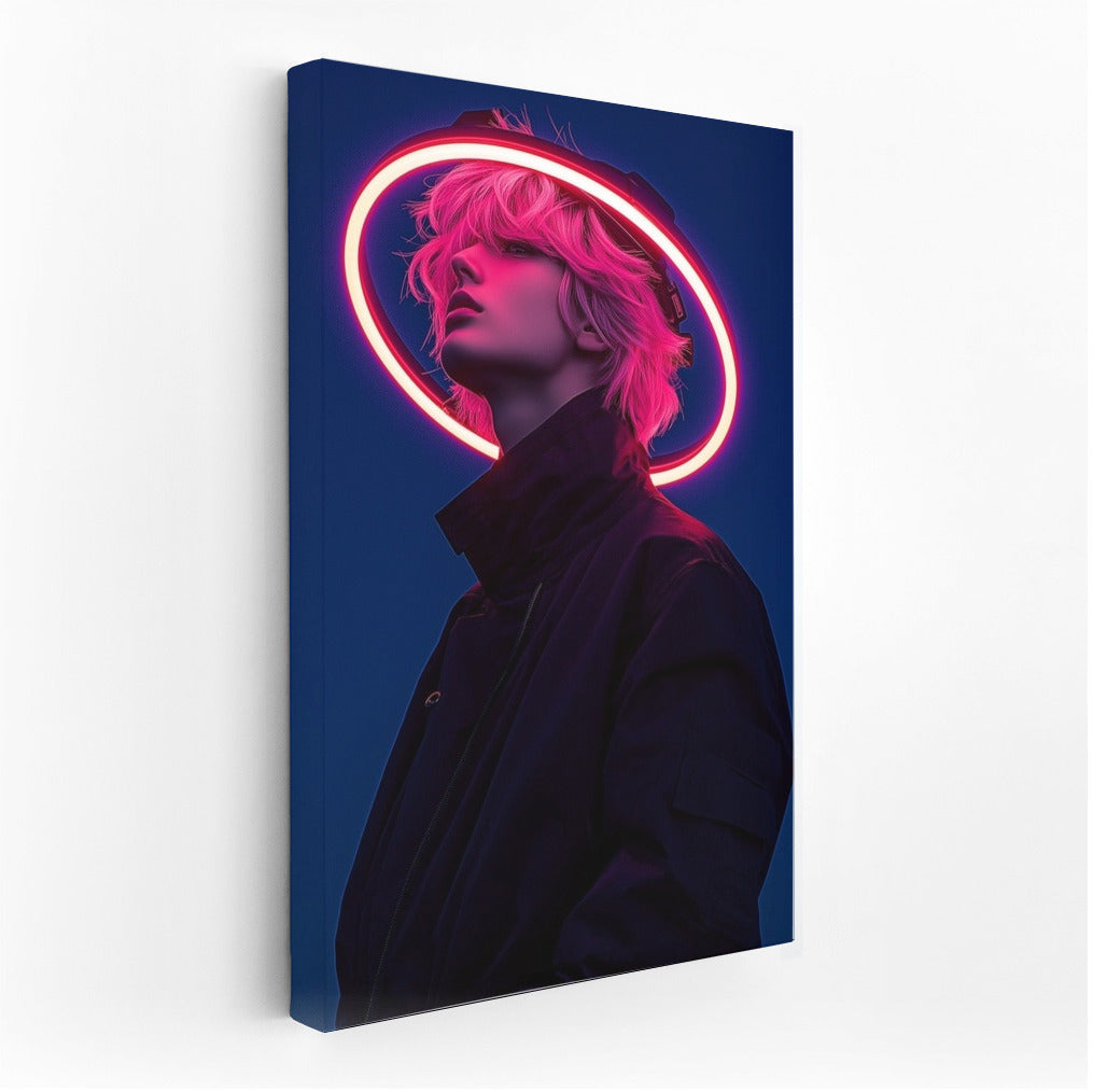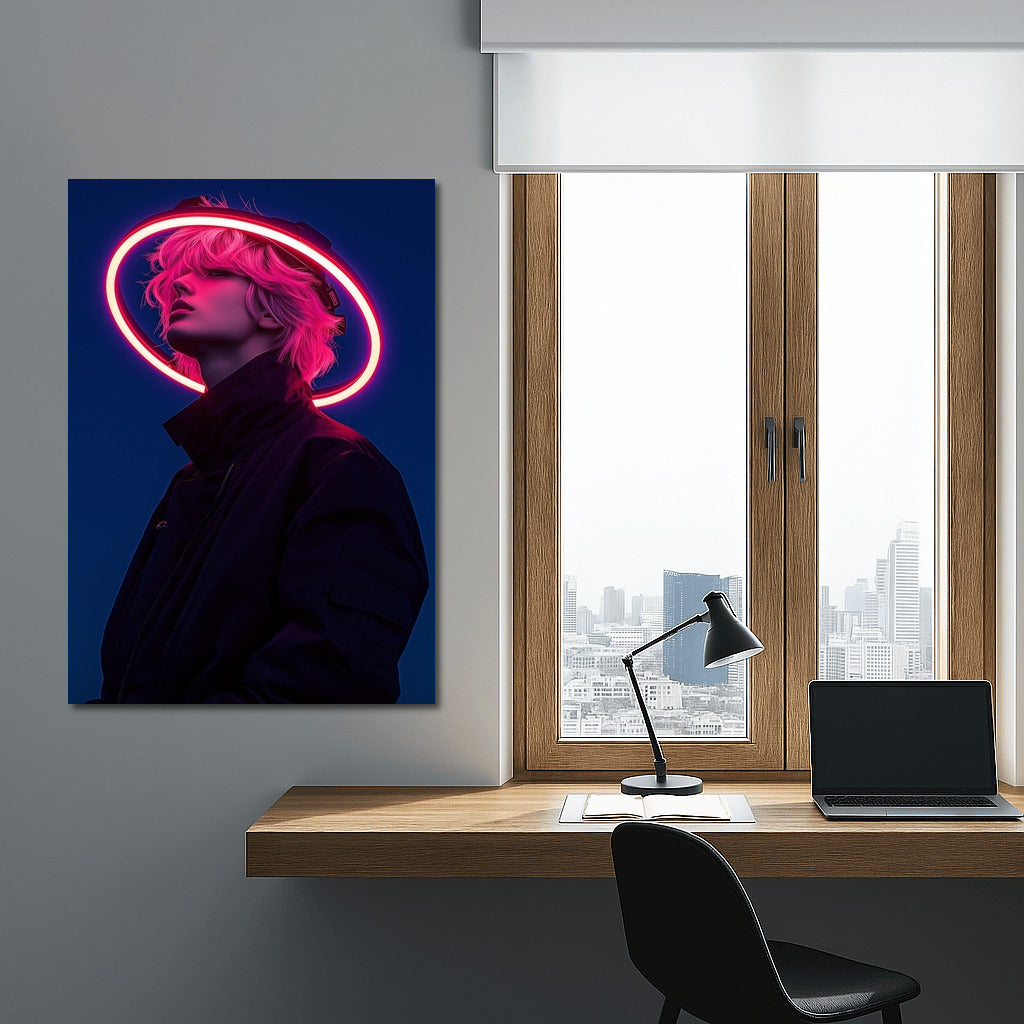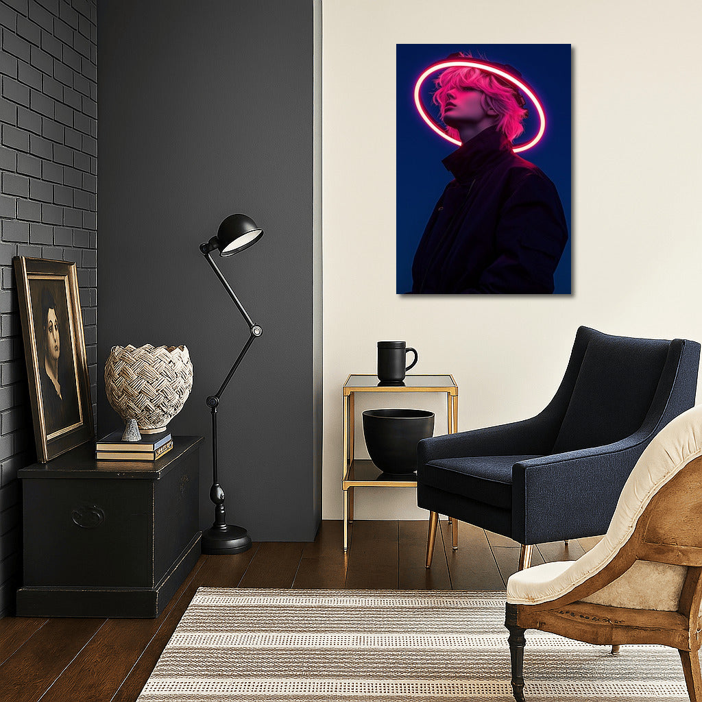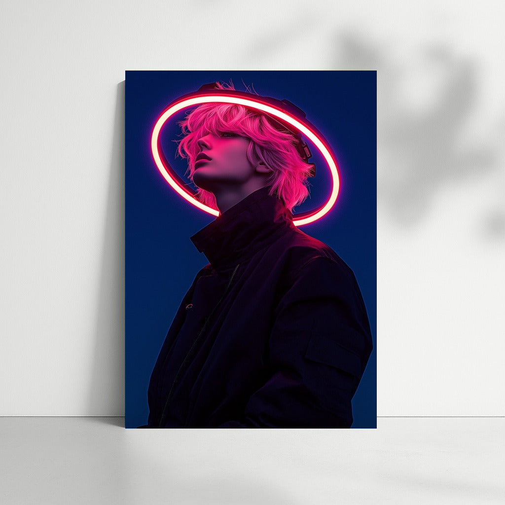 A fresh take on neon: a poster with a mysterious figure in the glow of a pink ring. Contemporary wall art. See more from the collection: Neon Art