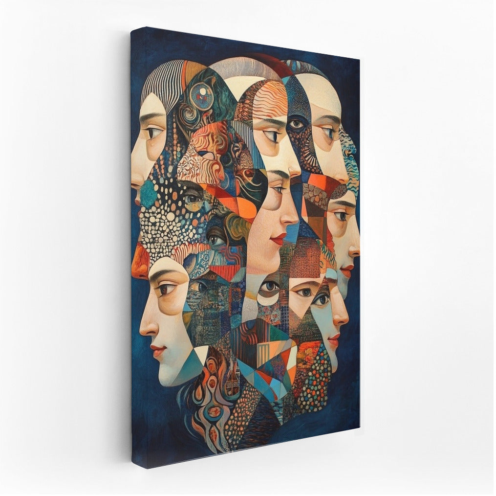 Immerse yourself in a world of illusion and harmony with this unique poster: here faces weave patterns and colors of wall art. See more from the collection: Mixed Wall Art