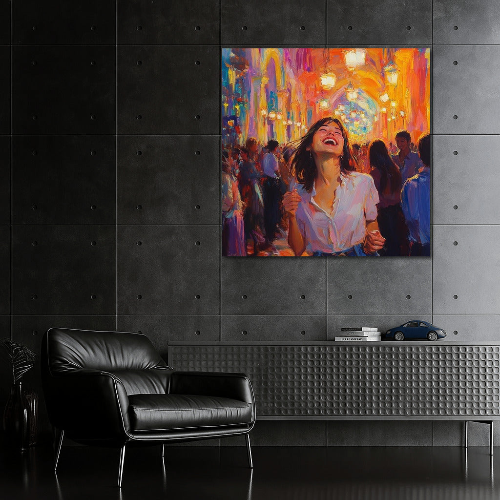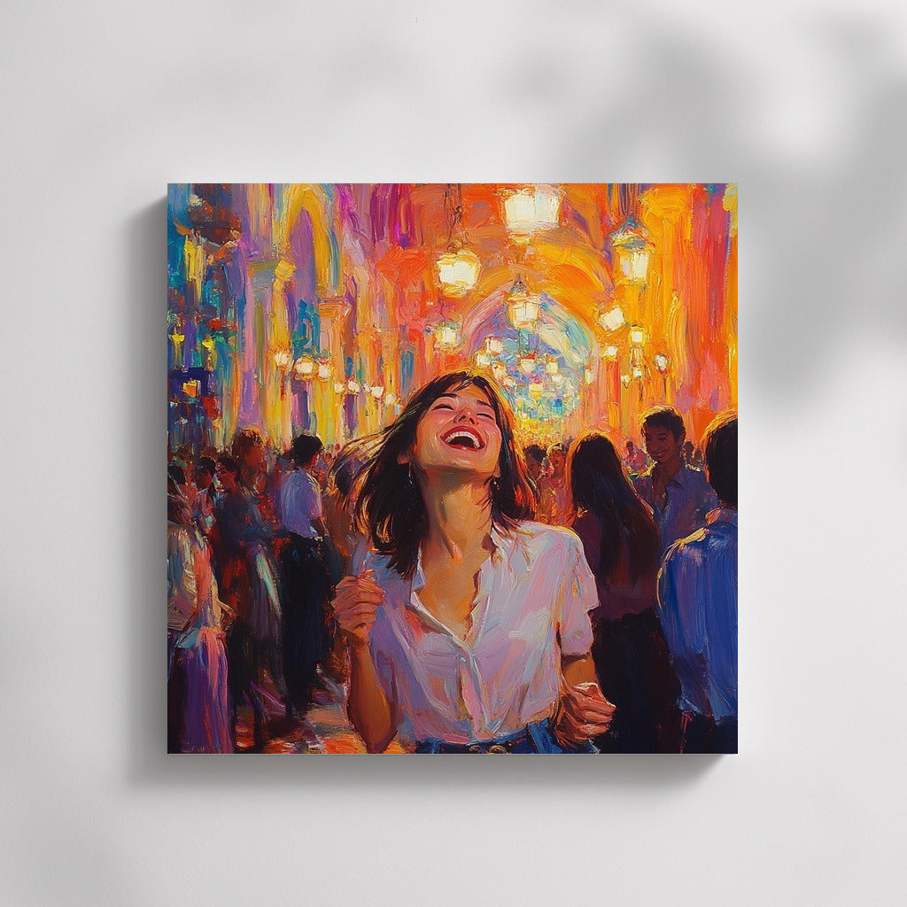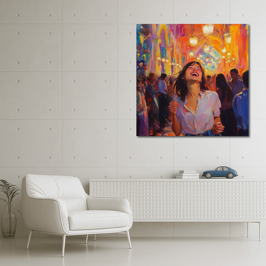 paintingsque poster: a girl in a white shirt dances among bright lights and a crowd, conveying an atmosphere of joy and freedom. See more from the collection: Wall Art with Women