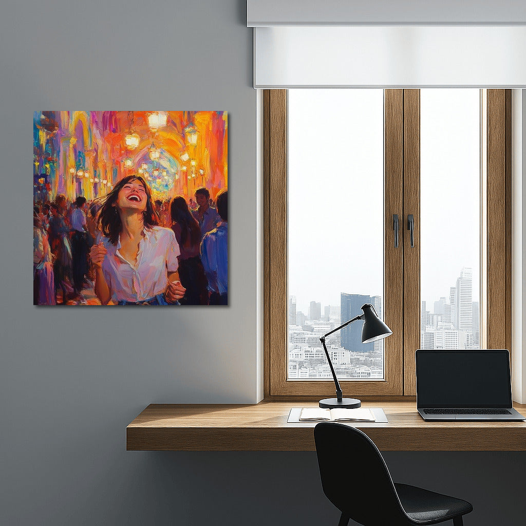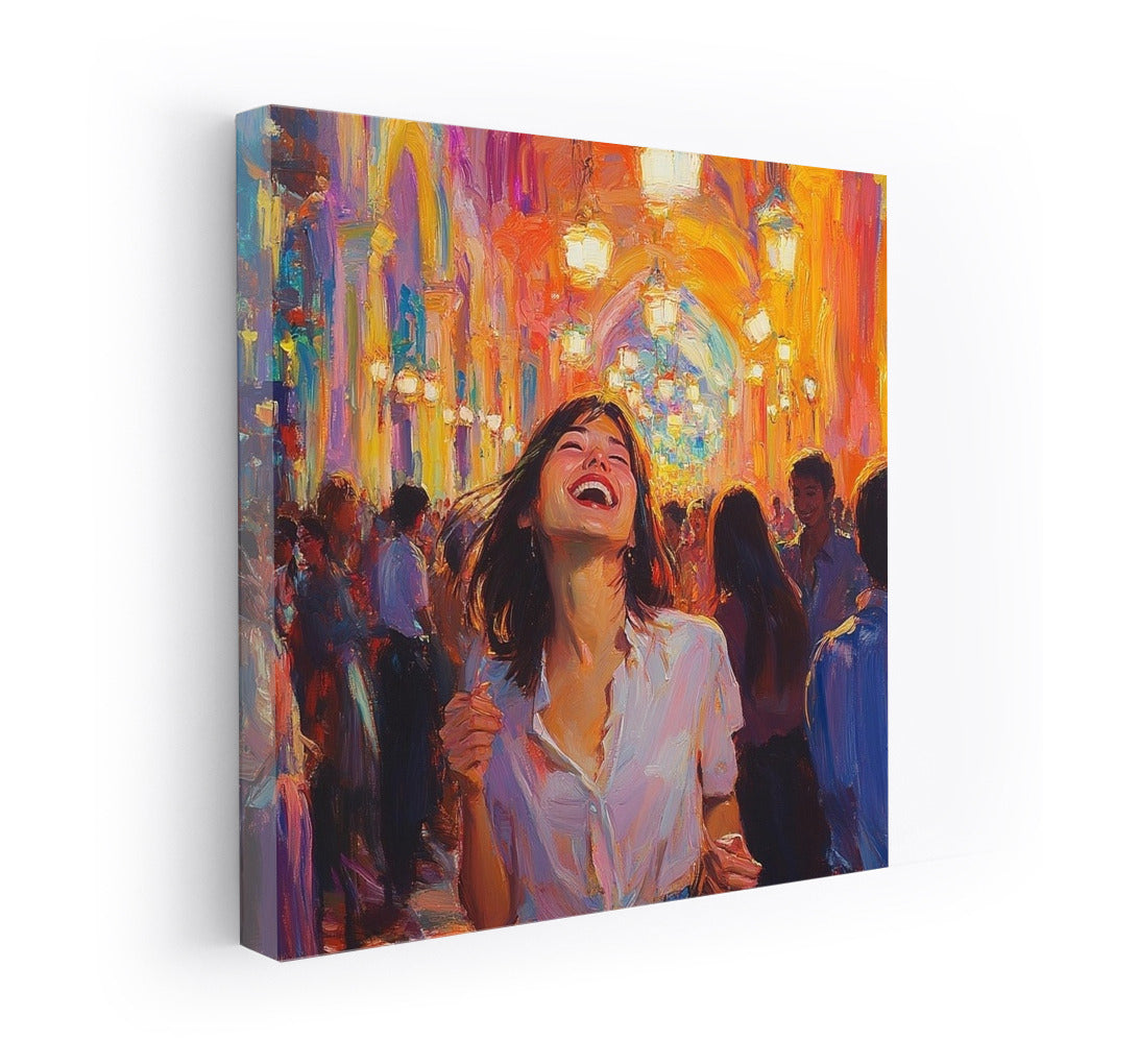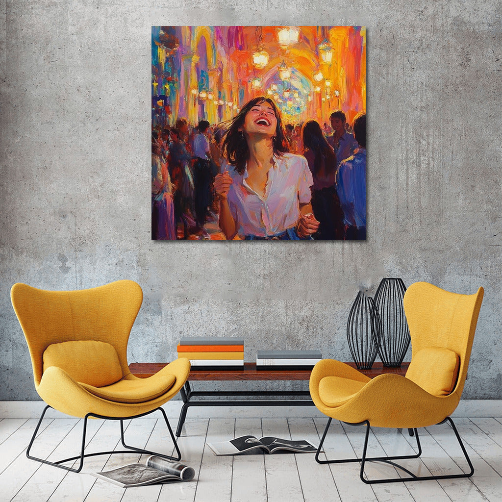 paintingsque poster: a girl in a white shirt dances among bright lights and a crowd, conveying an atmosphere of joy and freedom. See more from the collection: Wall Art with Women