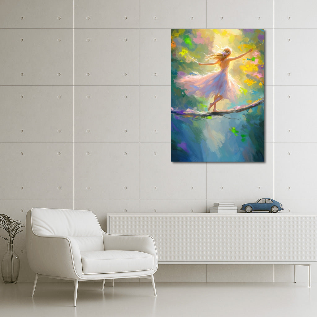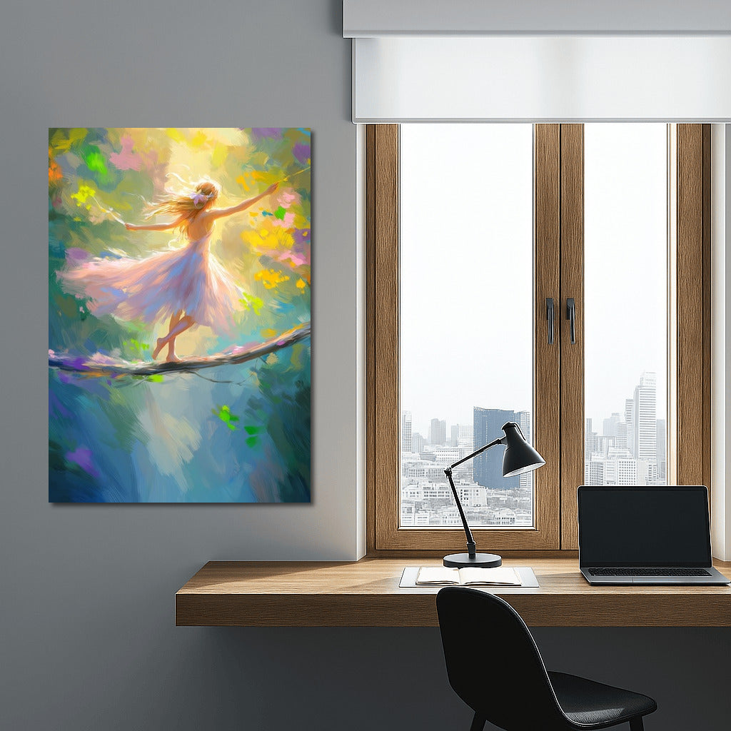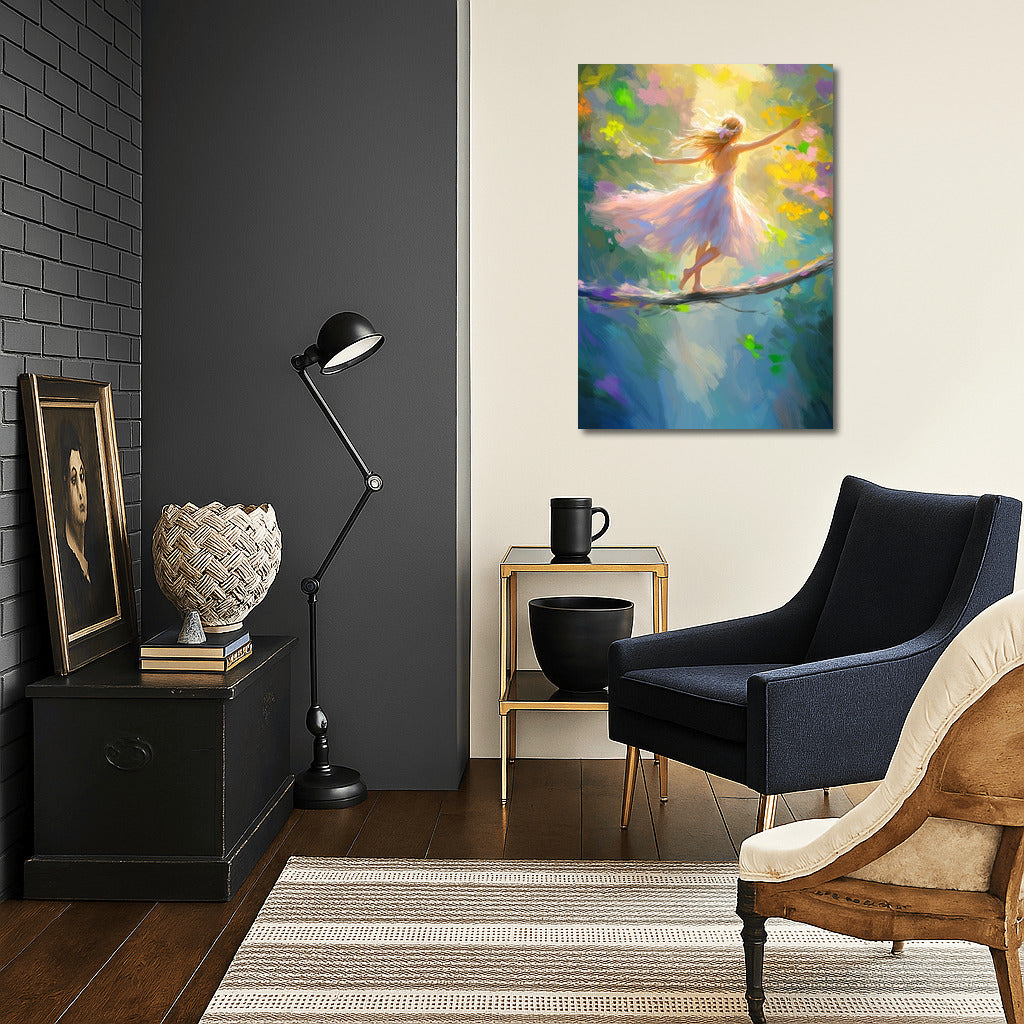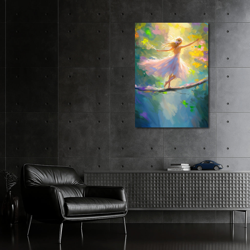 Ephemeral grace: a poster with a dancing figure against the backdrop of a magical forest fills the space with light and inspiration. See more from the collection: Mixed Wall Art