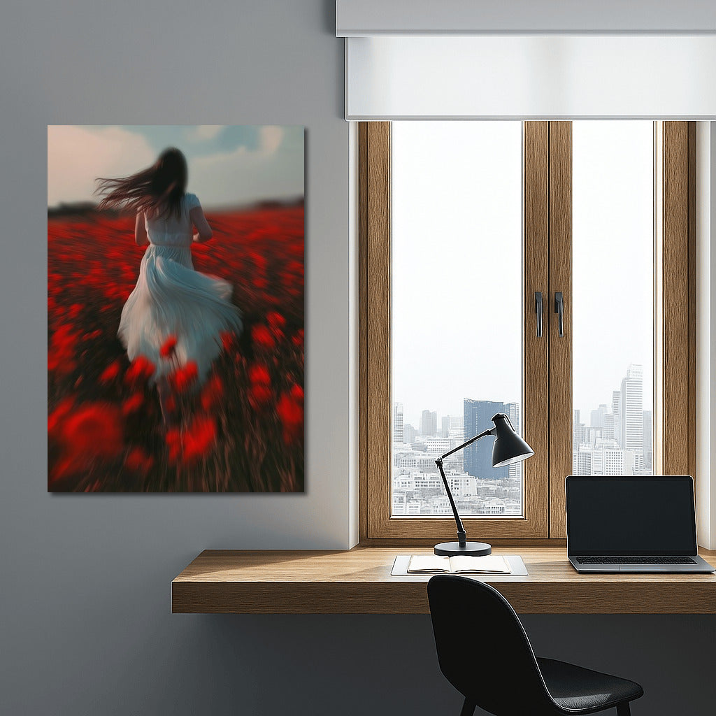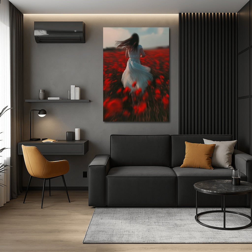A fleeting moment of freedom: a poster with images and movement in a field of scarlet flowers. Wall art in dreamy shades. See more from the collection: Flowers Art