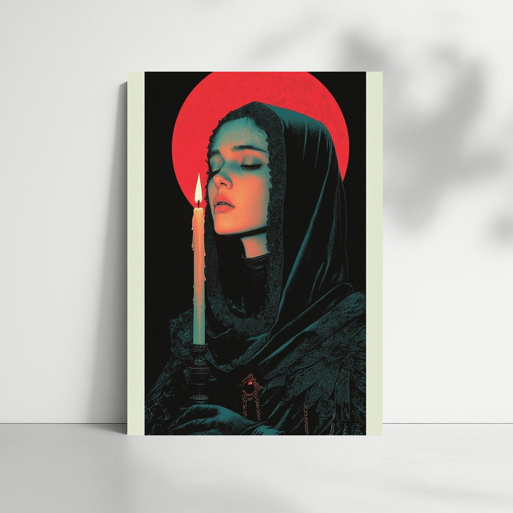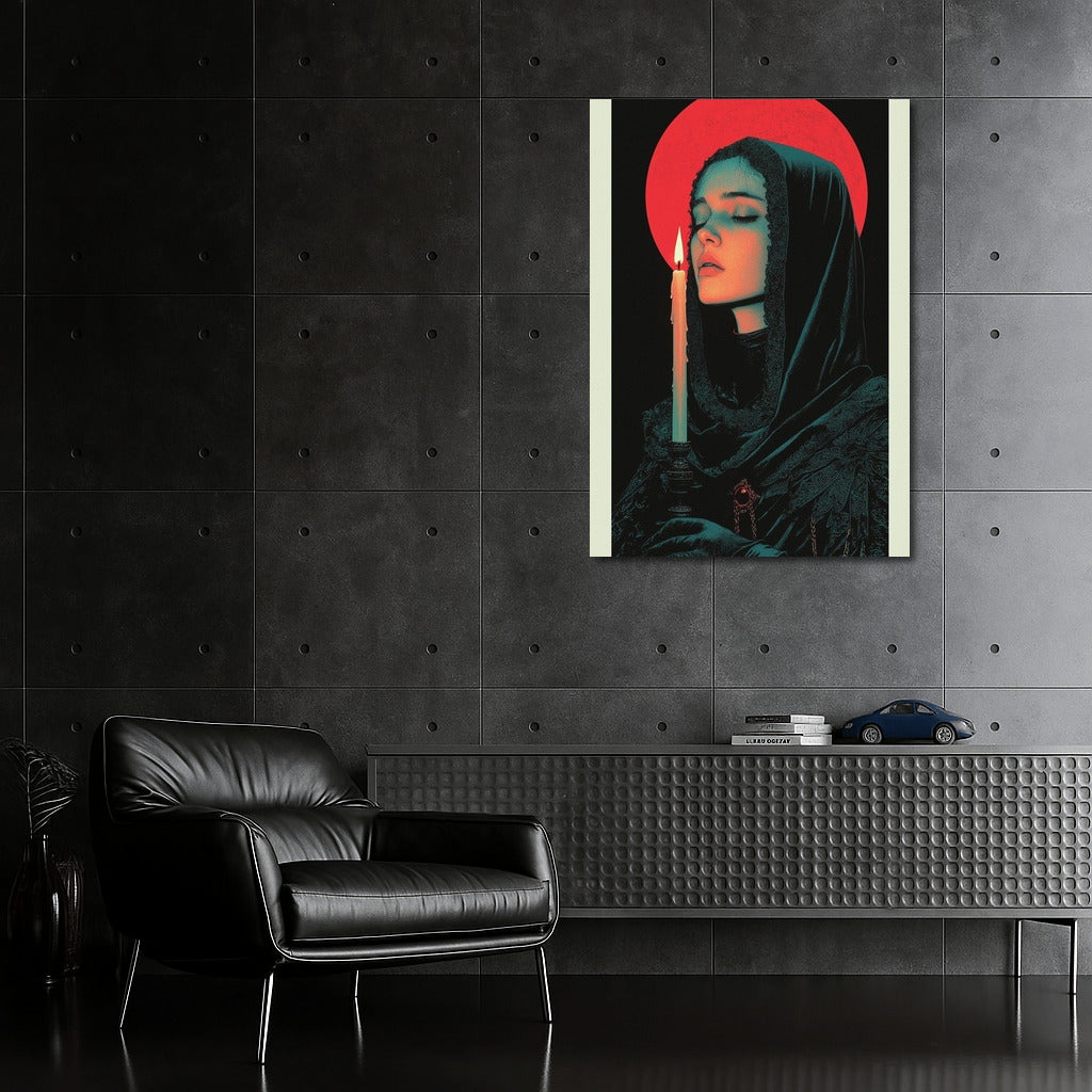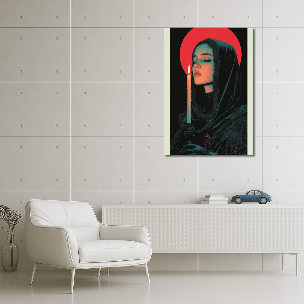 A mysterious painting with an attractive figure and a candle. A poster that reads thoughts and enlivens the walls with a mysterious light. See more from the collection: Mysticism Art