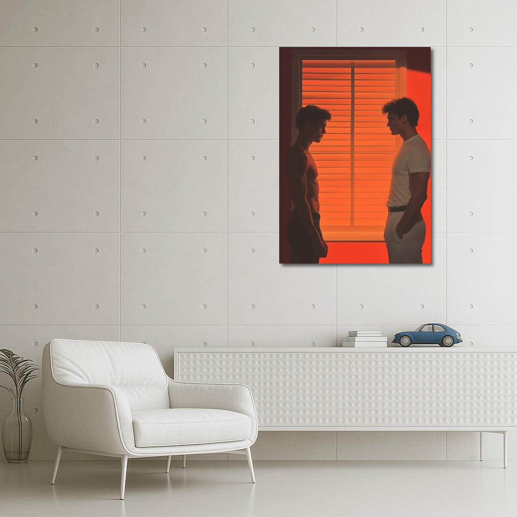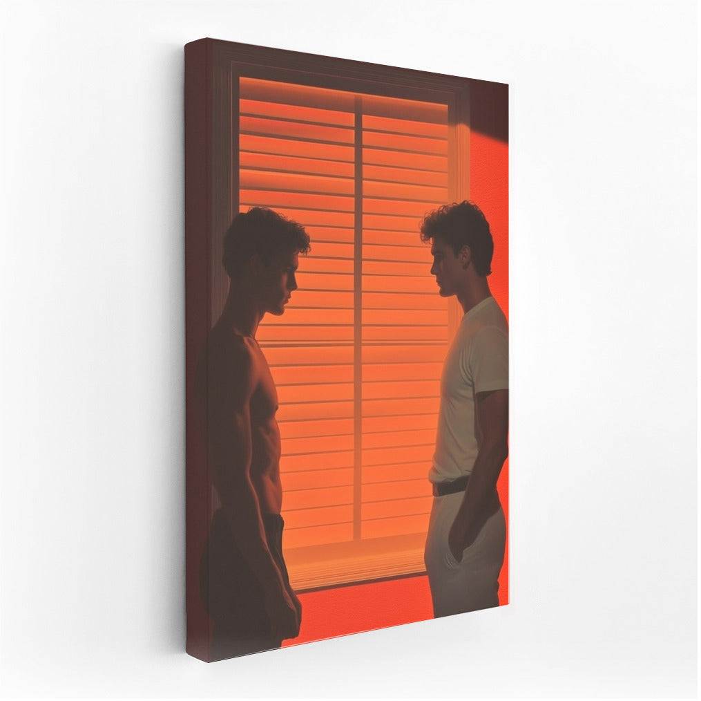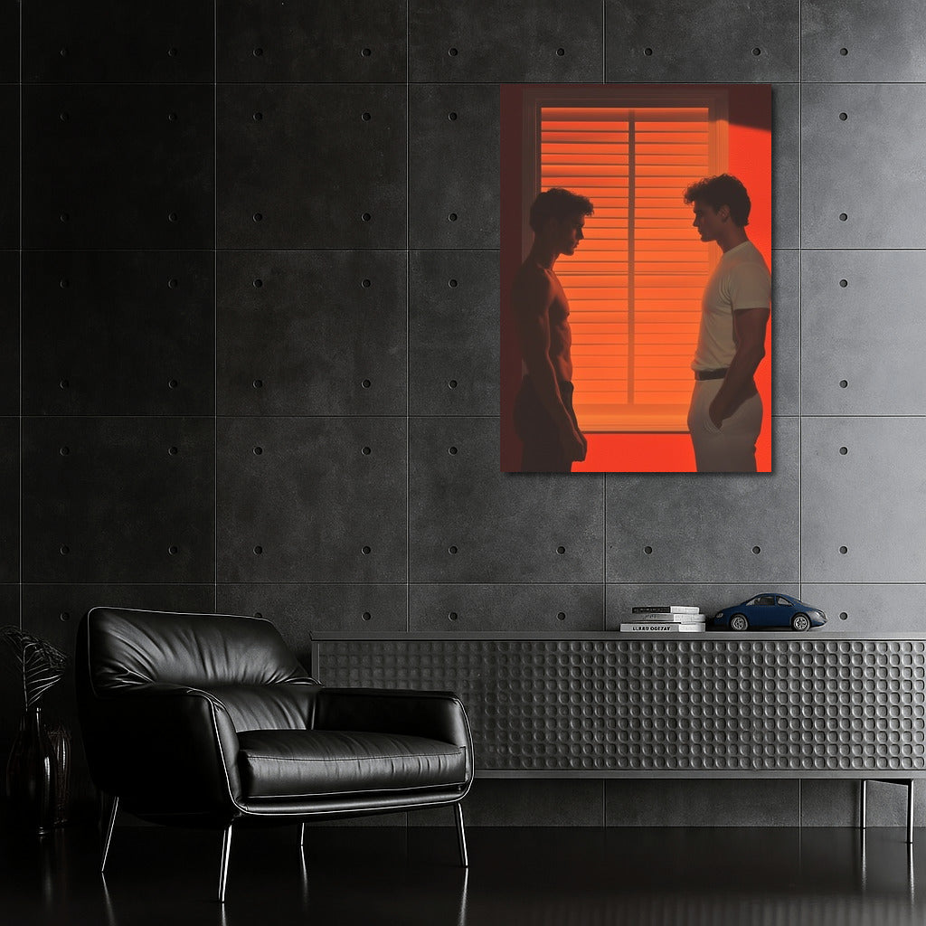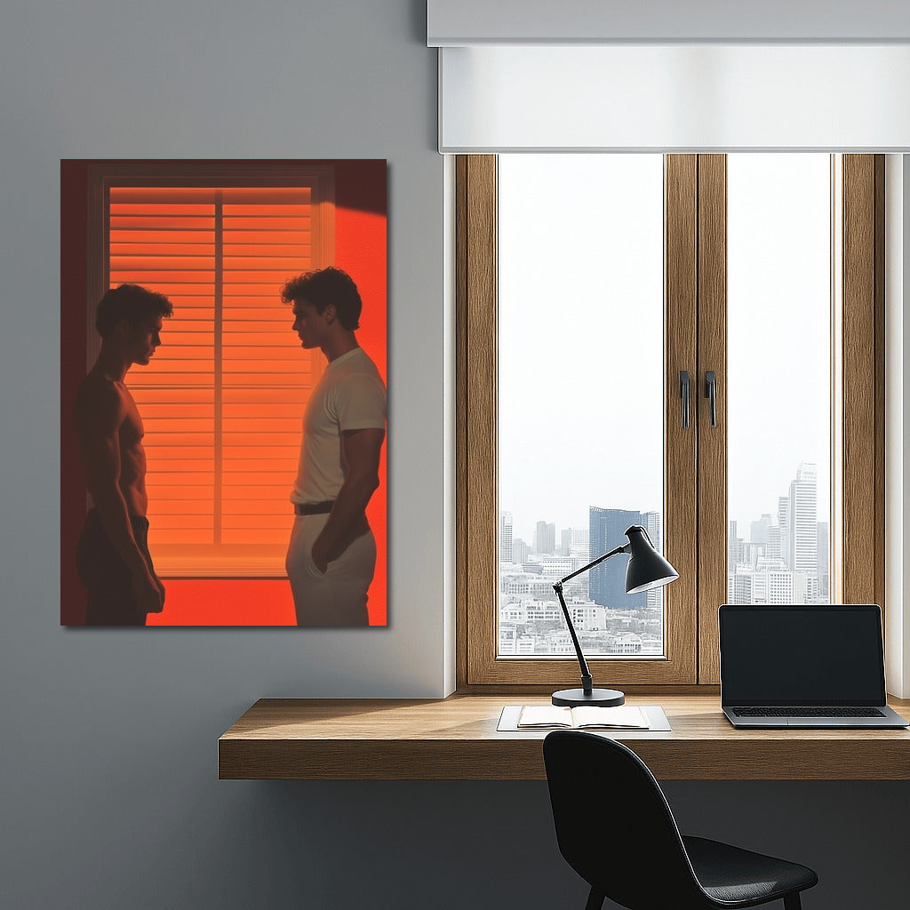 A twist of shadows and light: two figures against a warm sunset. A painting that fills the walls with mystery and intrigue. See more from the collection: Mixed Wall Art