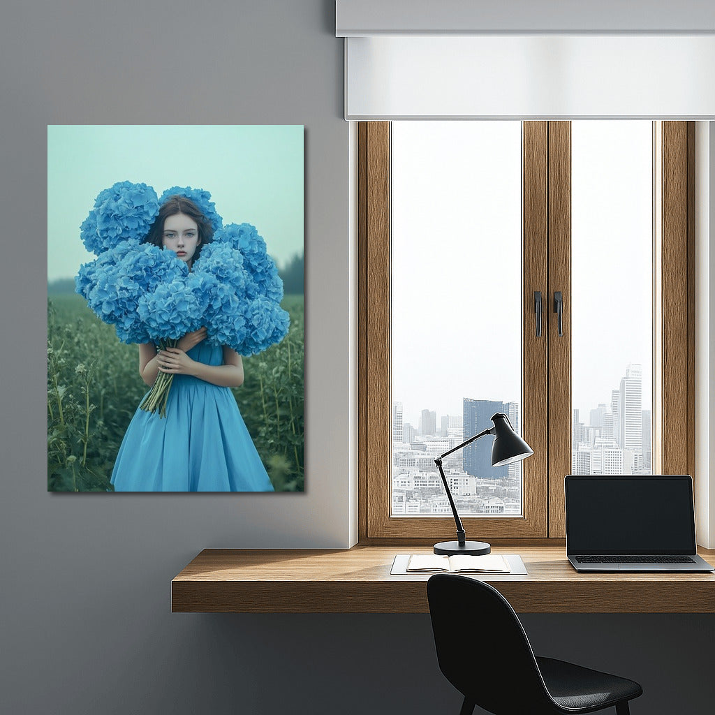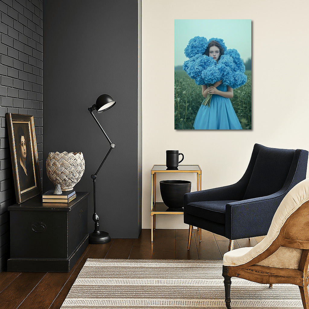 Elegant poster: a mysterious figure among blue flowers, the embodiment of dreams and magic. Add a twist to your wall art! See more from the collection: Wall Art with Women