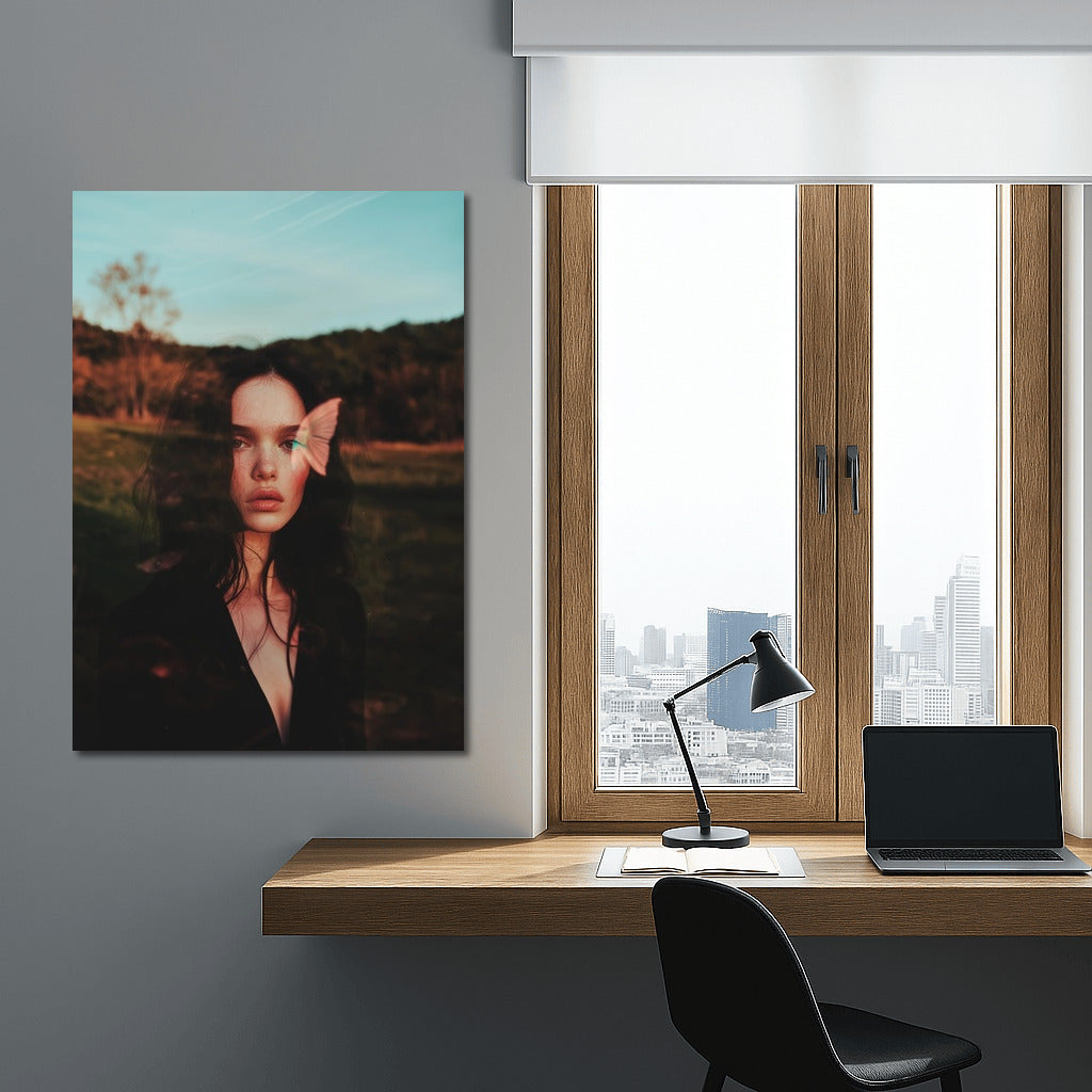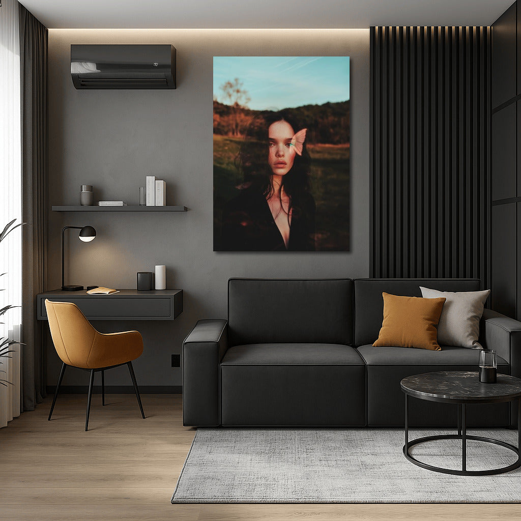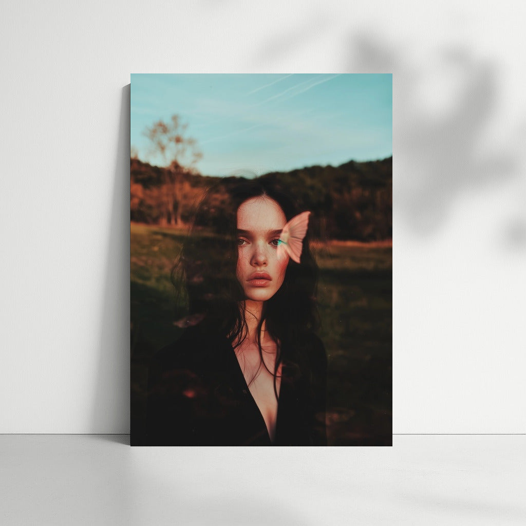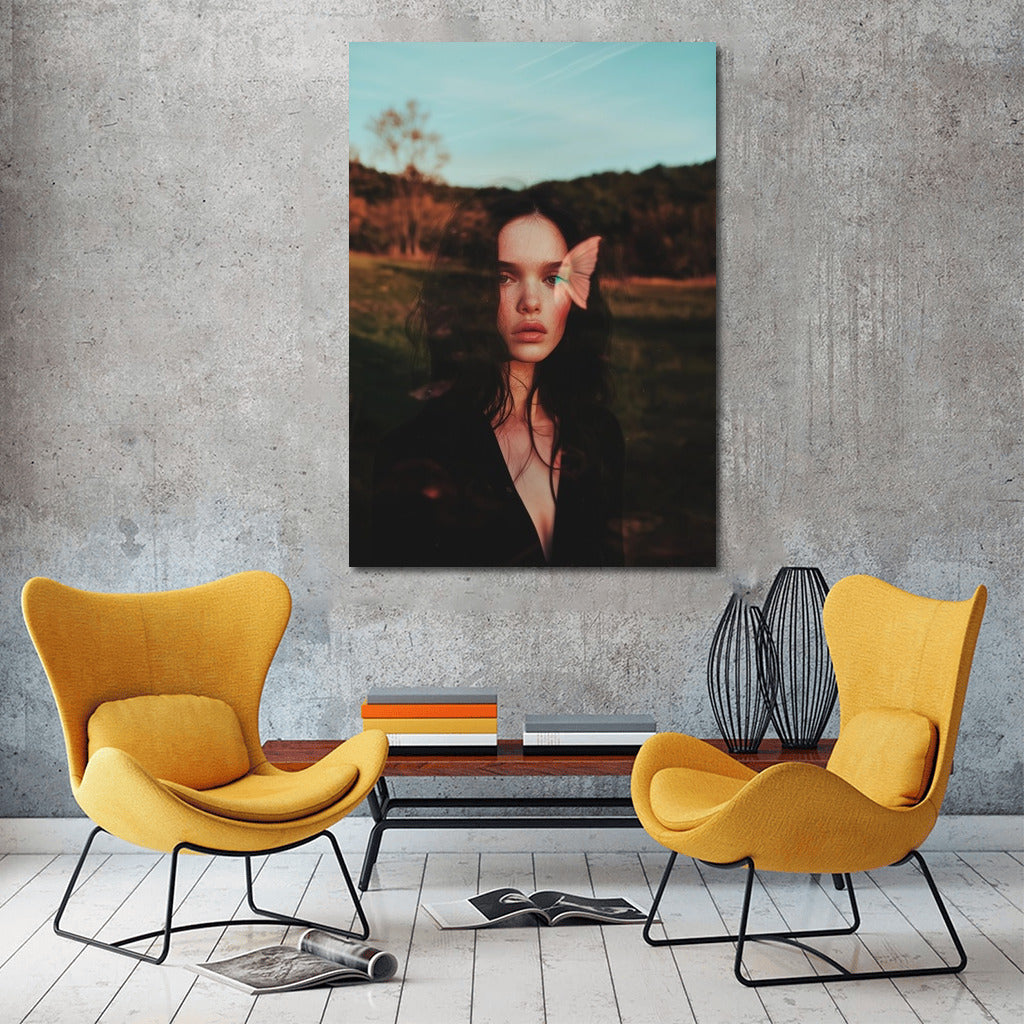 Magical world on canvas: mysterious figure and butterfly on the background of nature. Discover the facets of wall art with this poster. See more from the collection: Wall Art with Women