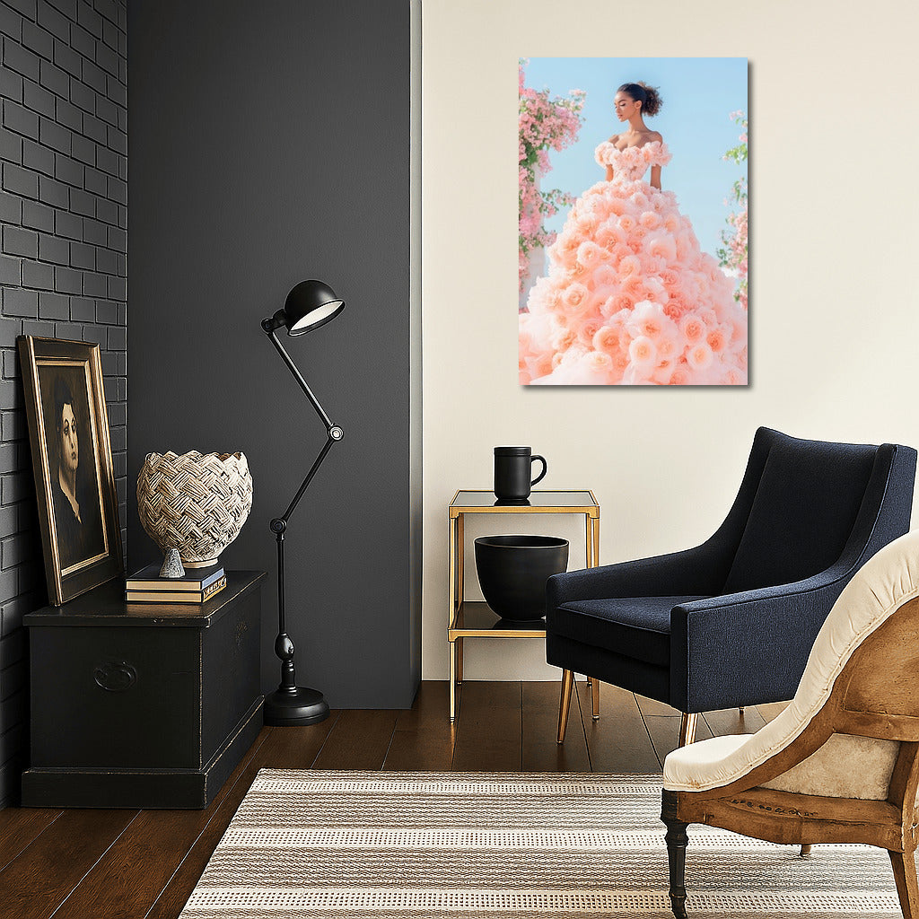 A poster with a subtle charm: a figure in a cloud of pink flowers on a delicate background. Art that will liven up any space. See more from the collection: Fashion Art