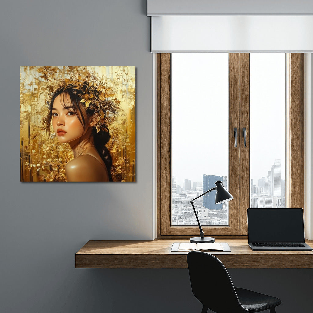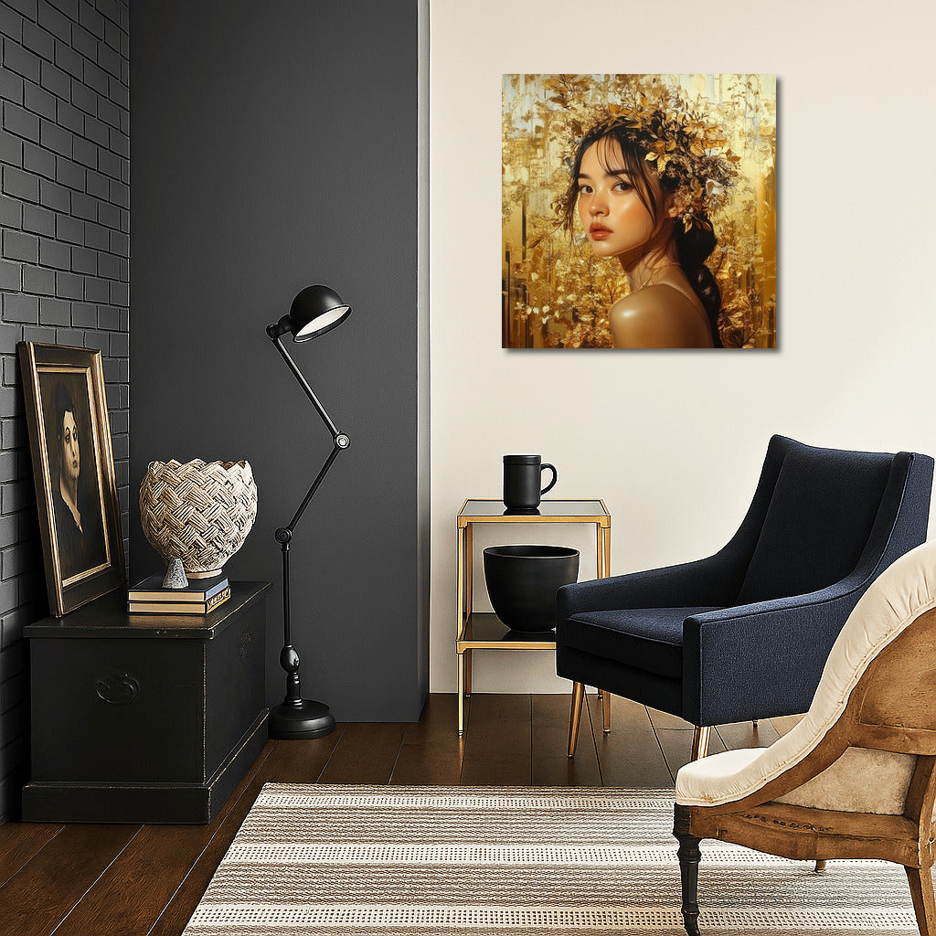An elegant painting with an emphasis on golden glow. Wall art where fantasy and nature dance in harmony. See more from the collection: Wall Art with Women