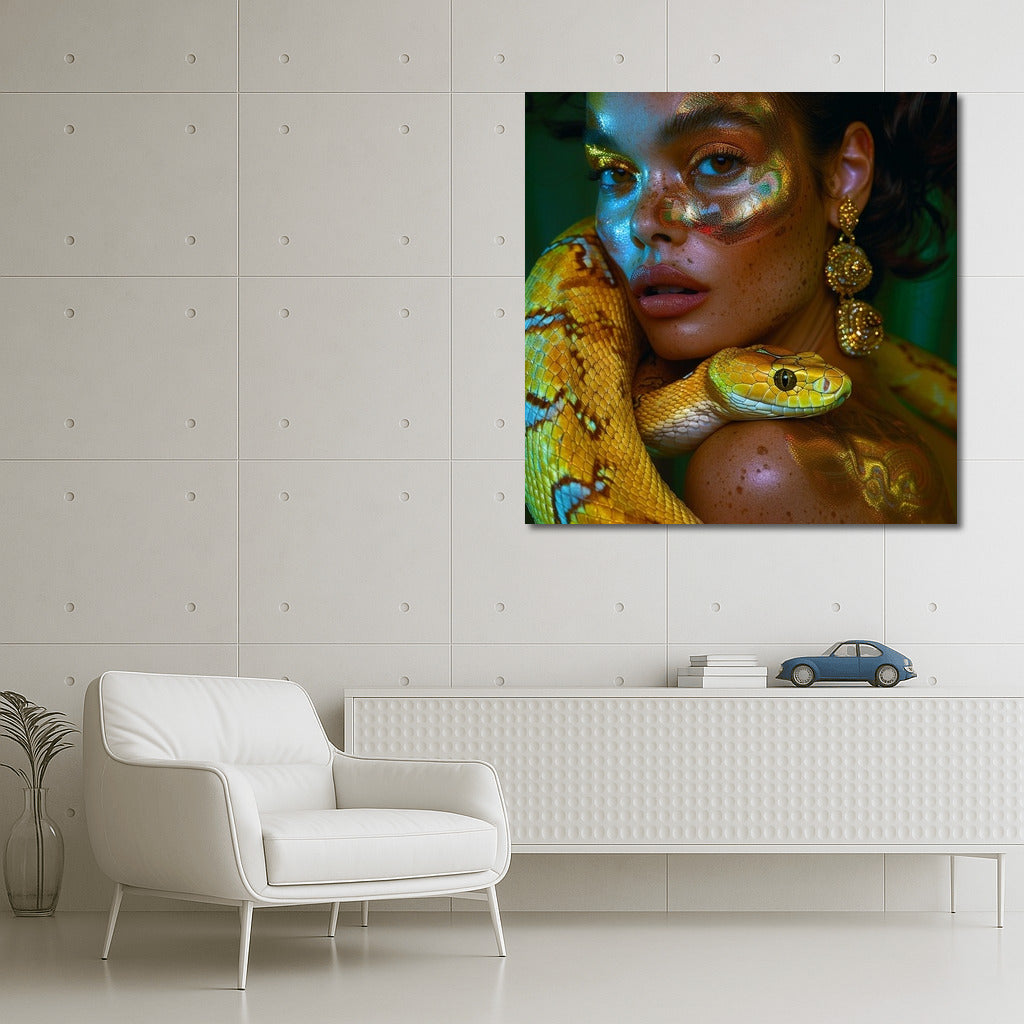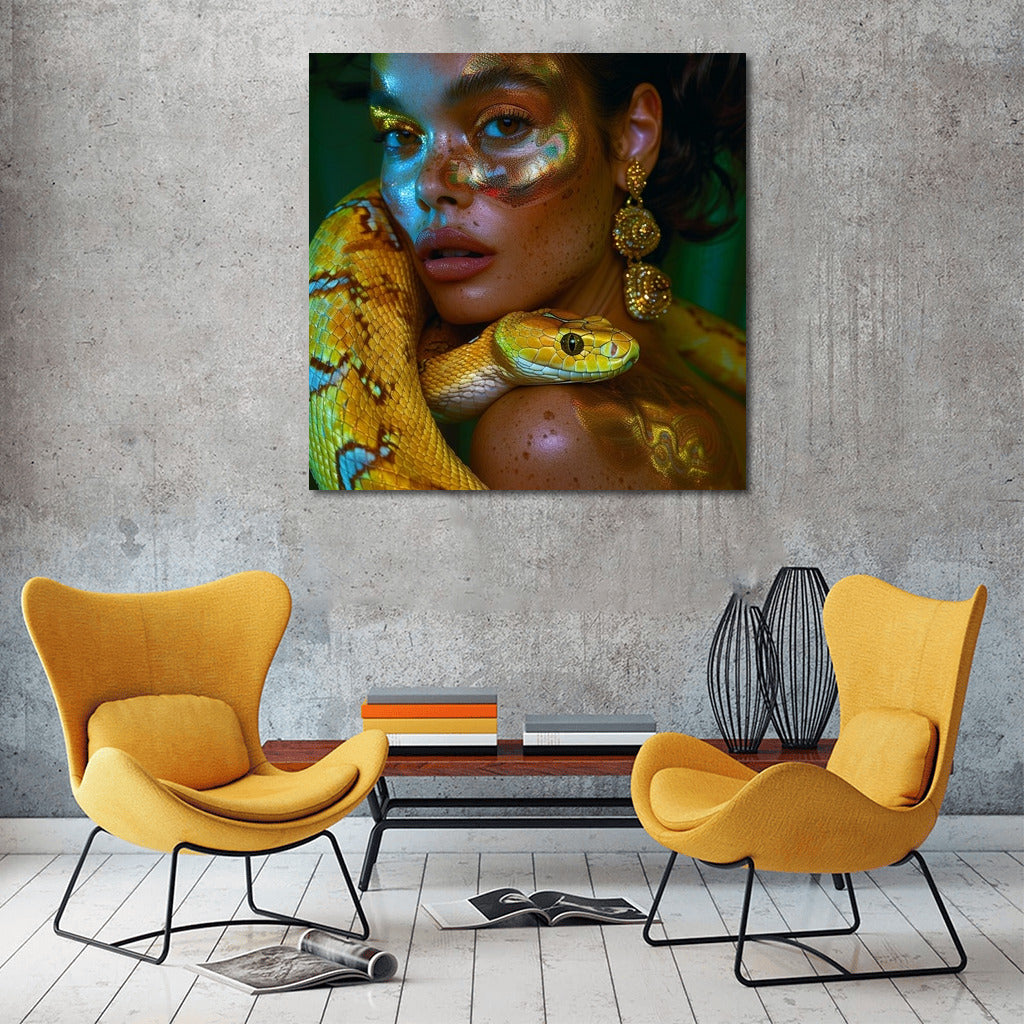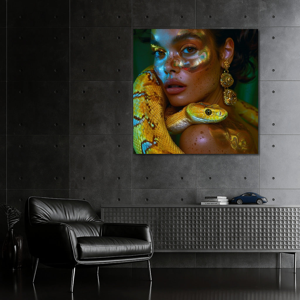 Amazing painting: girl and golden python. Wall art where nature and man merge in a radiant dance. See more from the collection: Wall Art with Women