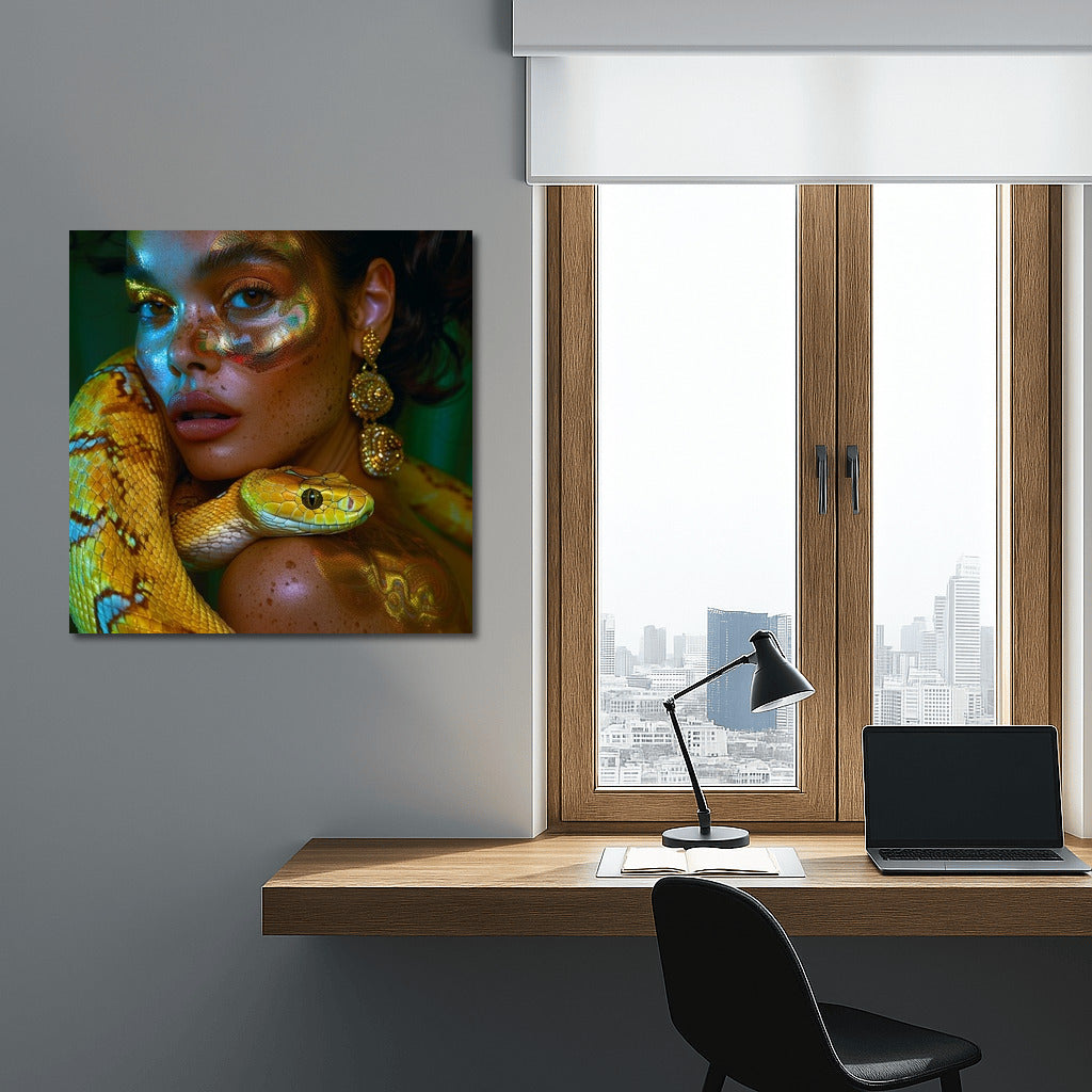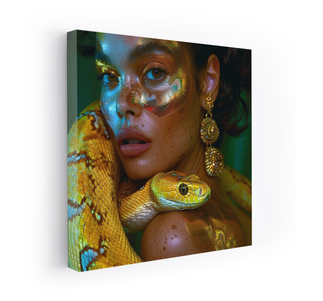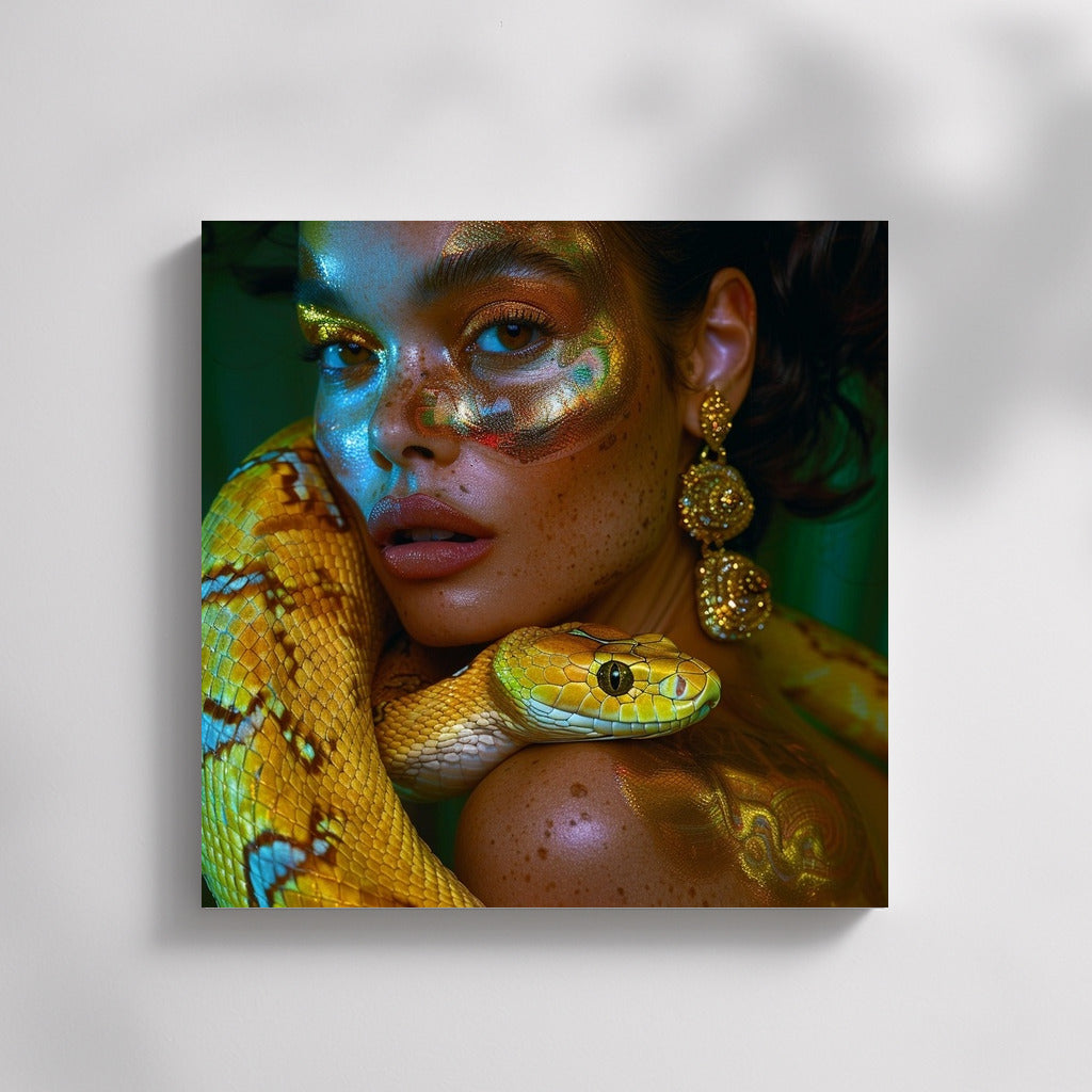 Amazing painting: girl and golden python. Wall art where nature and man merge in a radiant dance. See more from the collection: Wall Art with Women