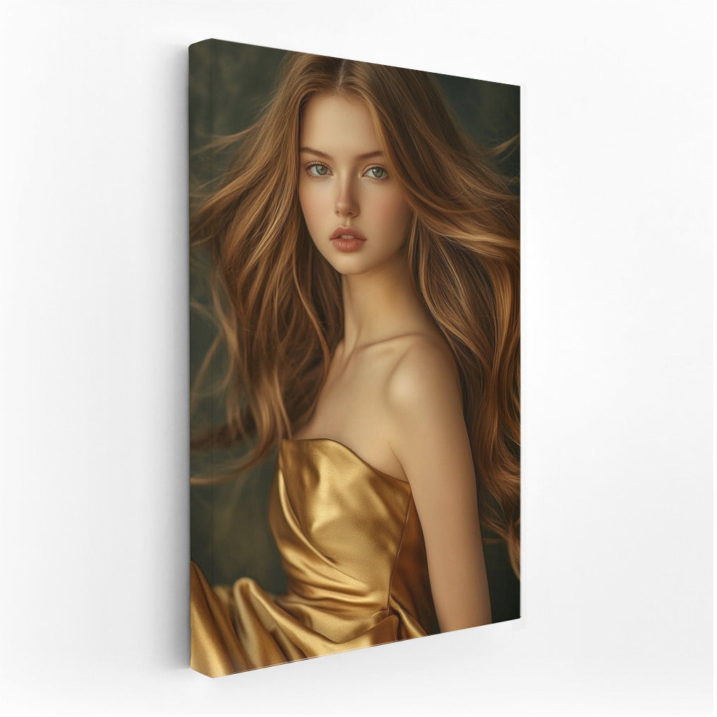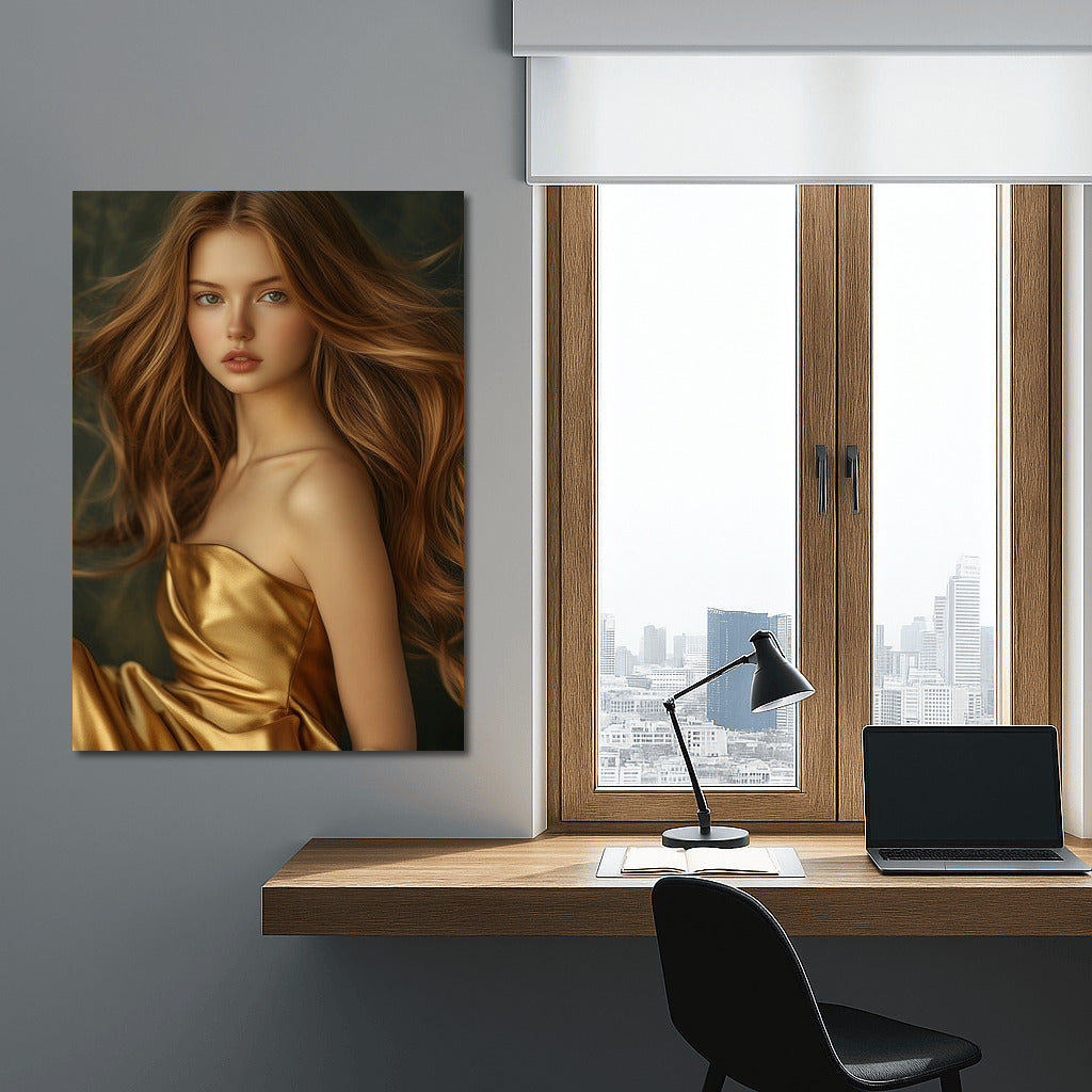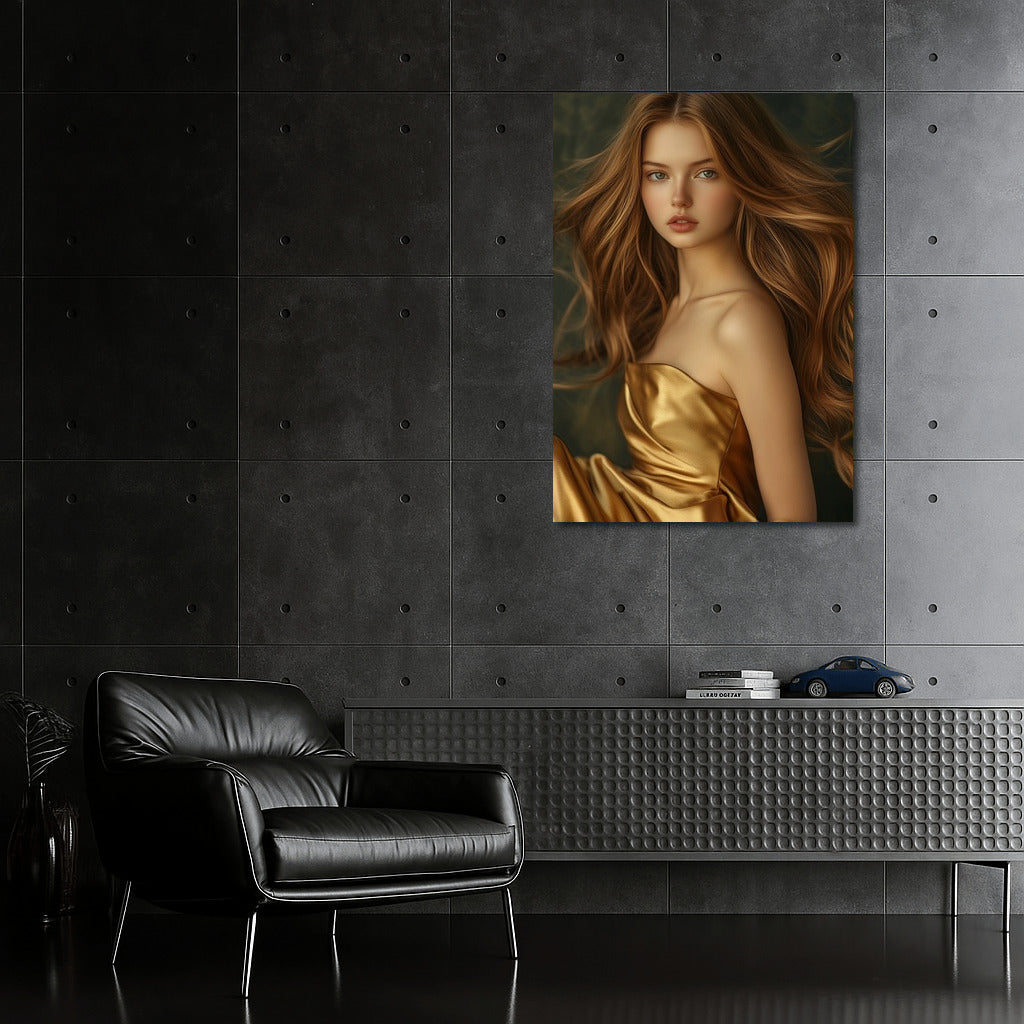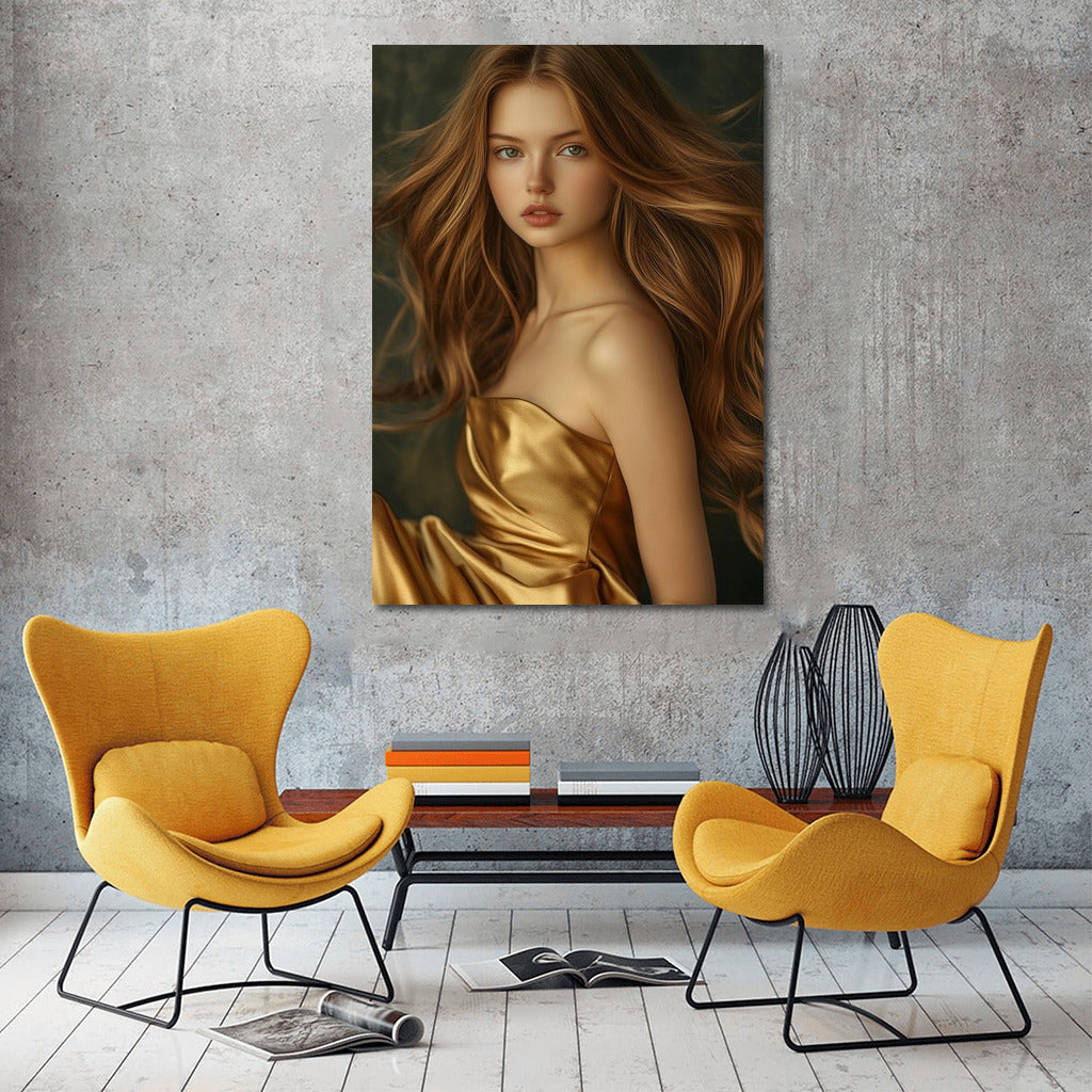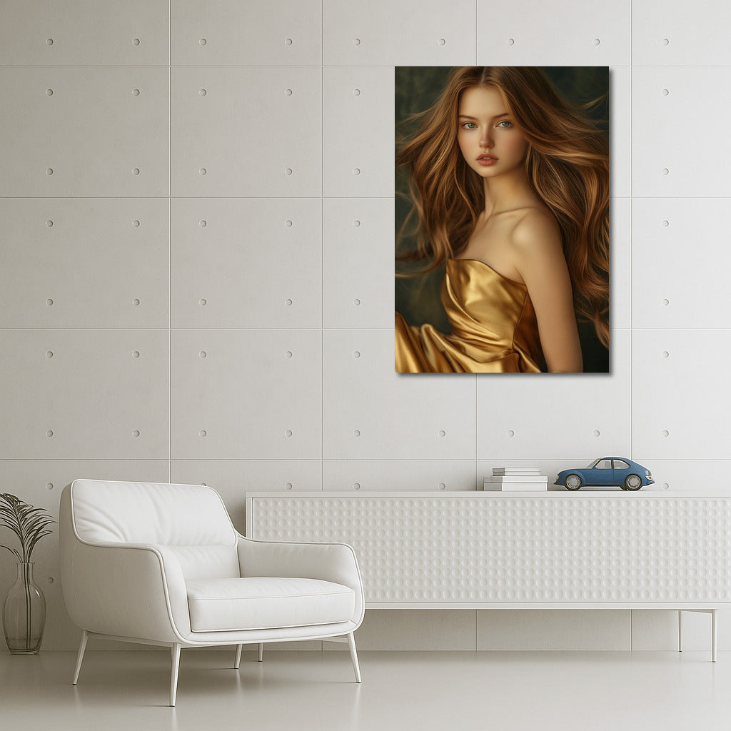 Capture the magic in motion: a poster of a girl in a golden dress will add elegance to your wall art. See more from the collection: Wall Art with Women