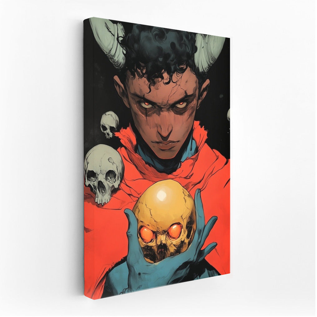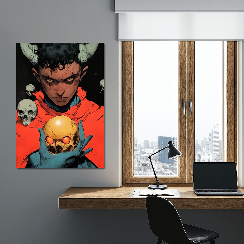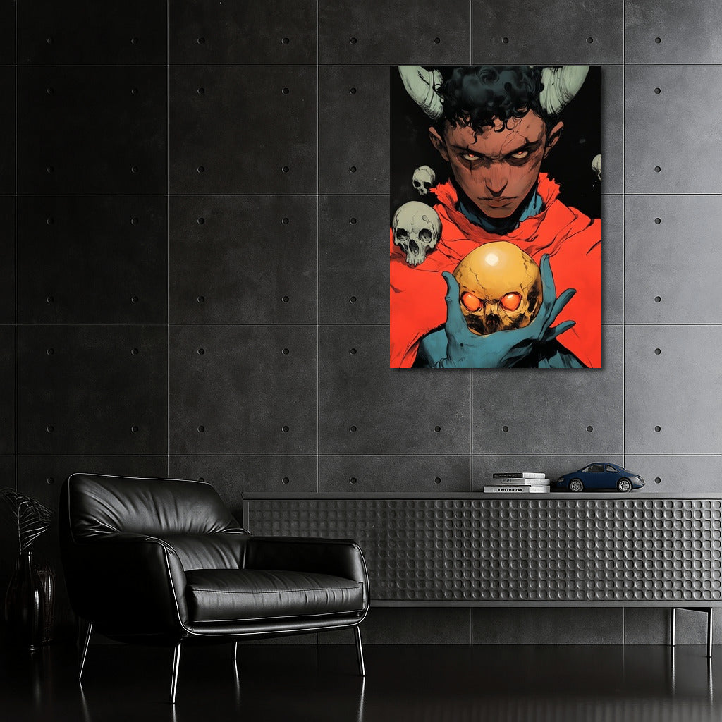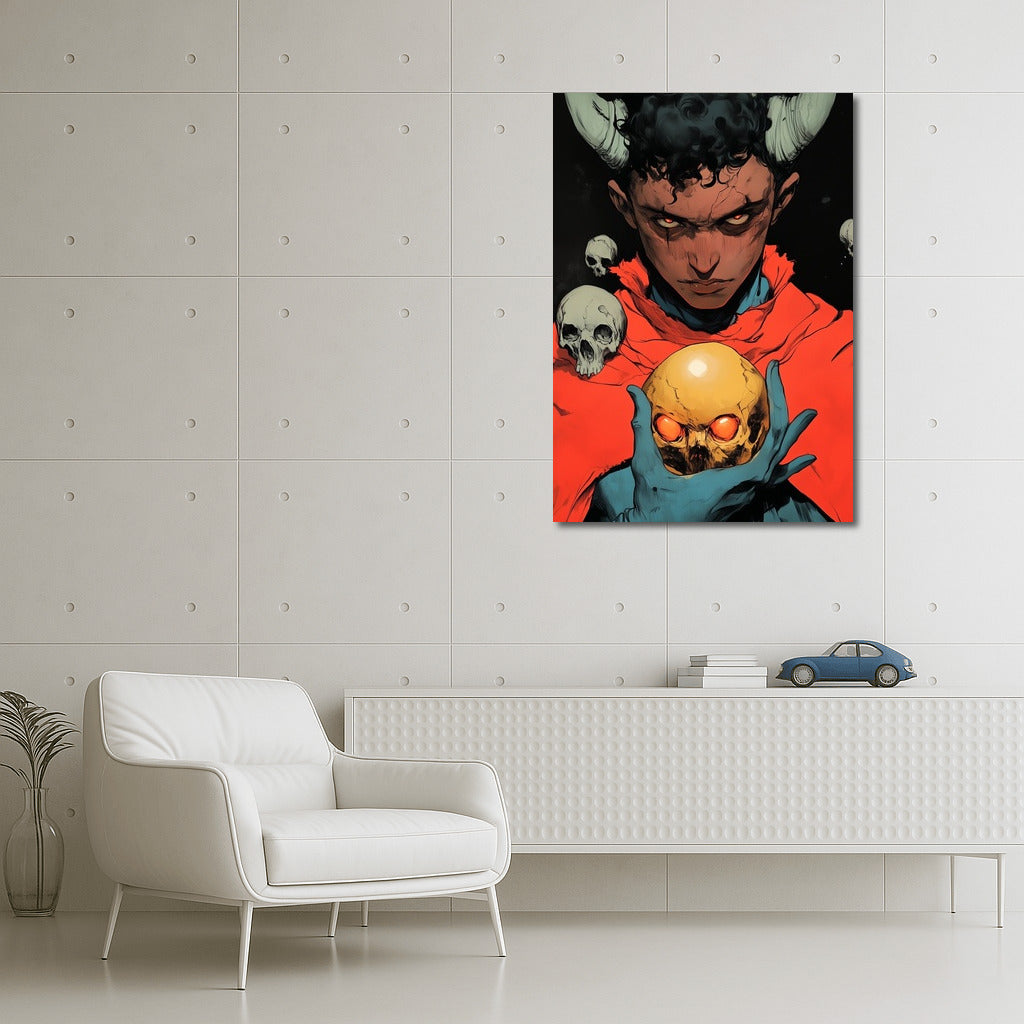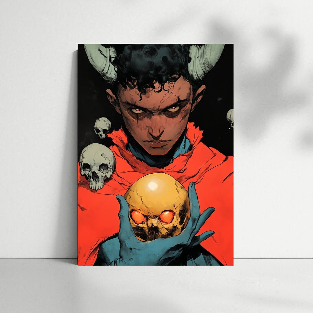 A captivating poster featuring a mysterious horned hero and glowing skulls. Wall art full of mysticism and symbolism. See more from the collection: Anime & Manga genres Art