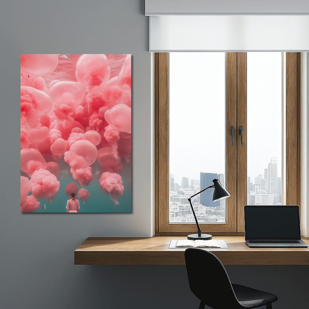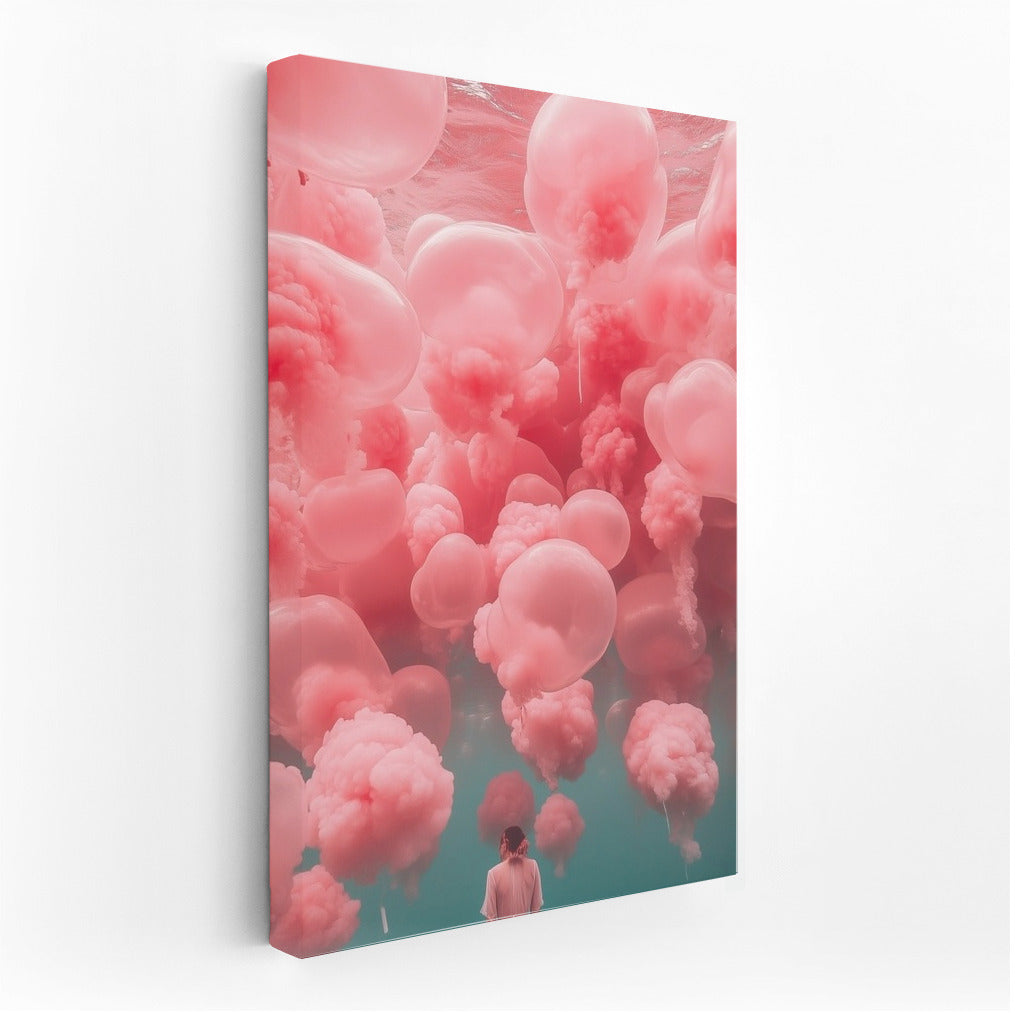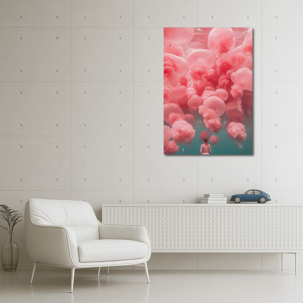 Dive into a dream world with this painting: clouds of pink jellyfish and a figure in a dress. The perfect poster for your space! See more from the collection: Mixed Wall Art