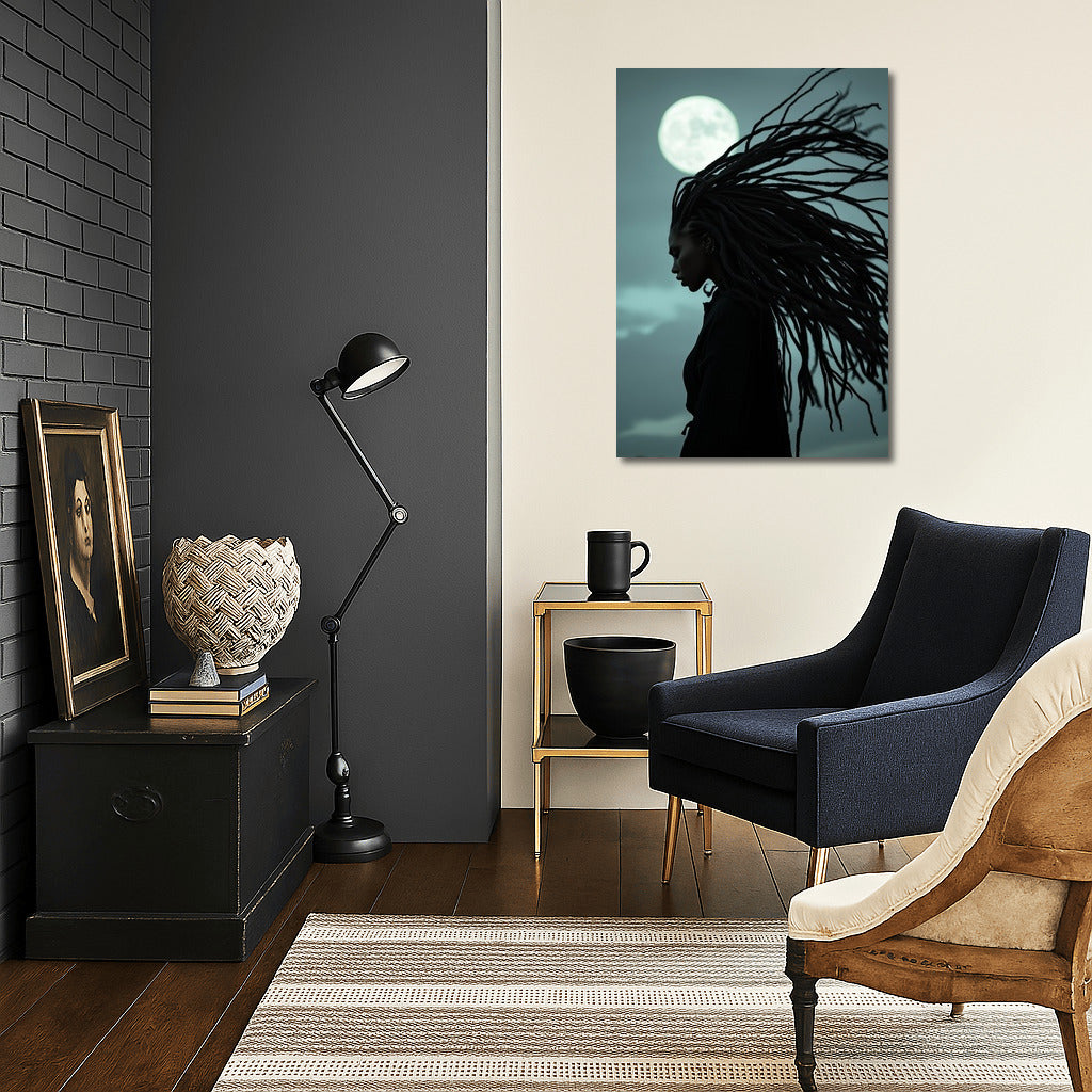 Moonlight and dynamics: a mysterious figure with flowing curls. Poster framed by the mystery of the night. Wall art of dreams. See more from the collection: Mixed Wall Art