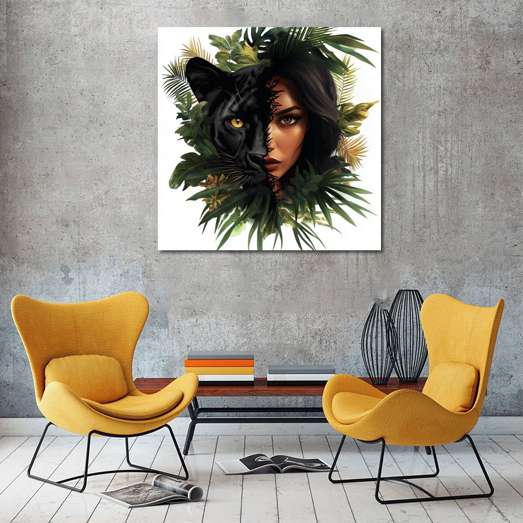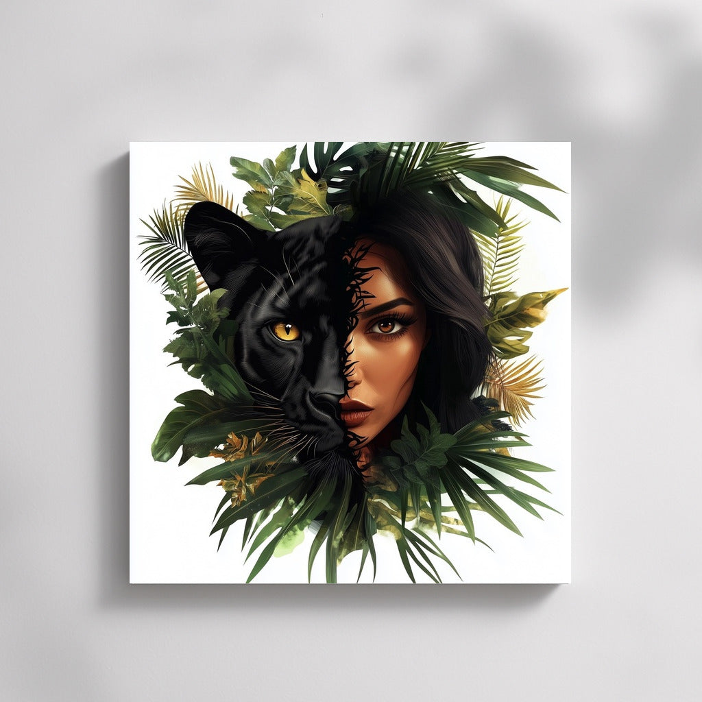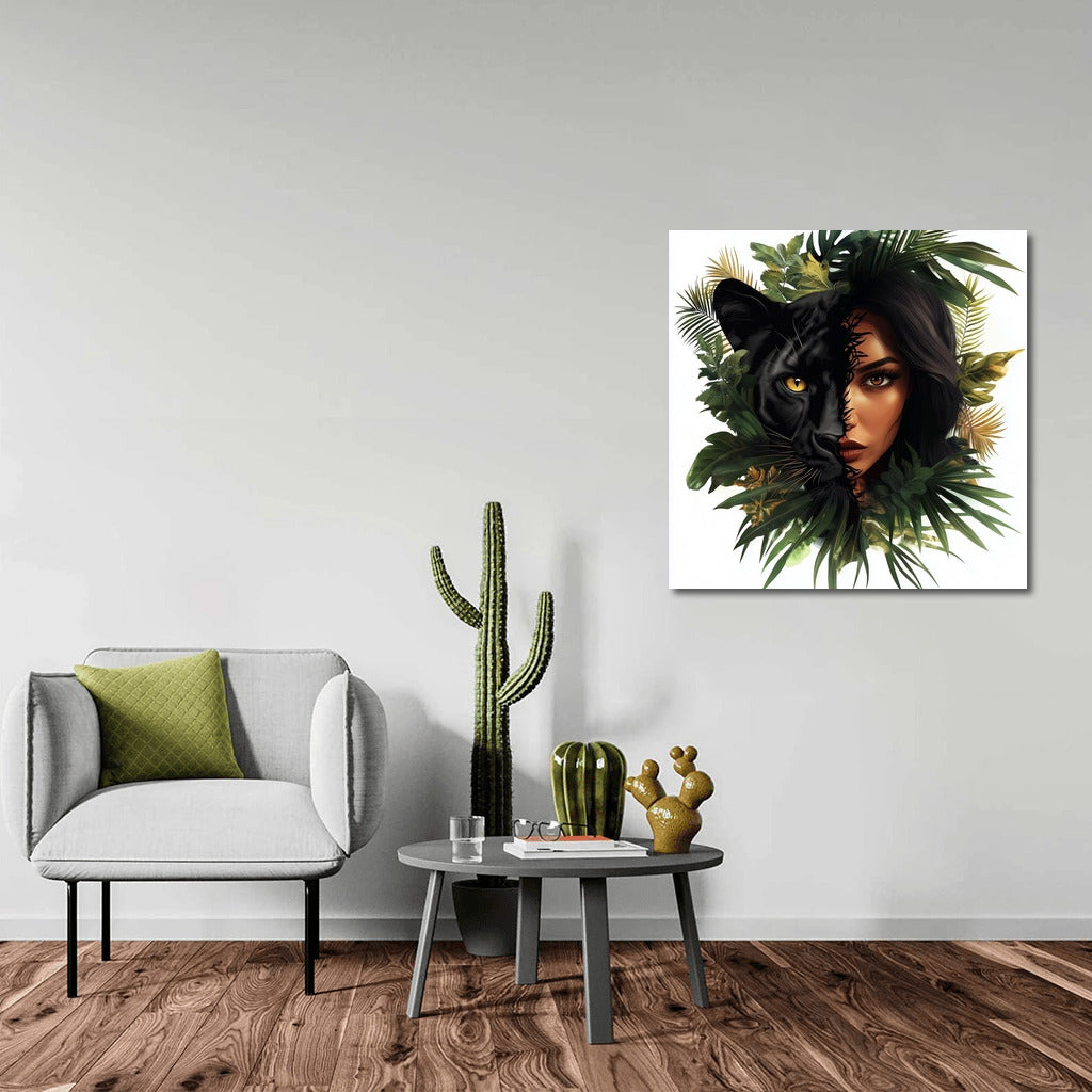 Wild Harmony poster: girl and panther in the interweaving of nature. This painting will enliven the interior with unique wall art. See more from the collection: Mixed Wall Art