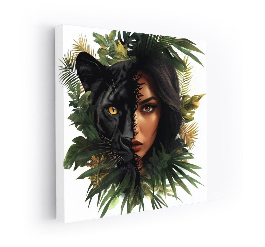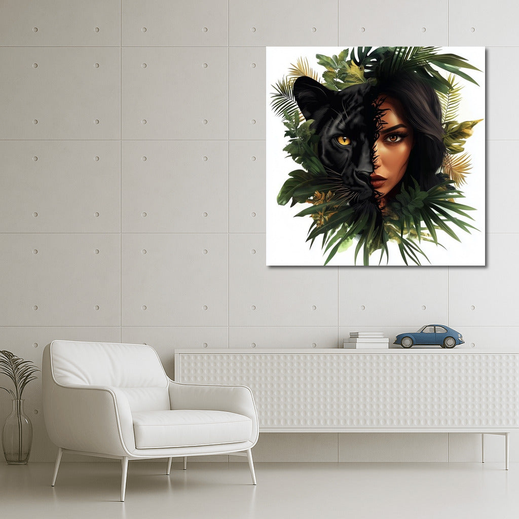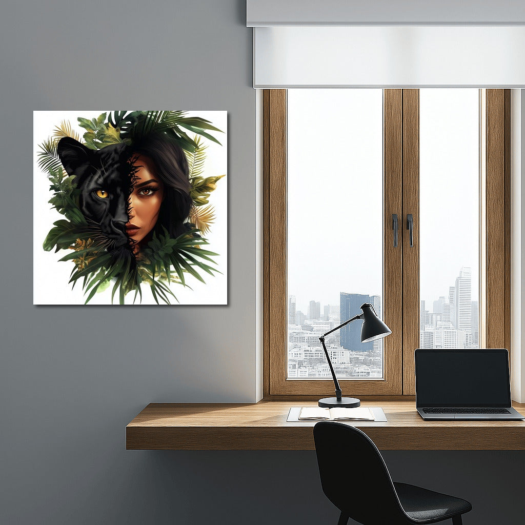 Wild Harmony poster: girl and panther in the interweaving of nature. This painting will enliven the interior with unique wall art. See more from the collection: Mixed Wall Art