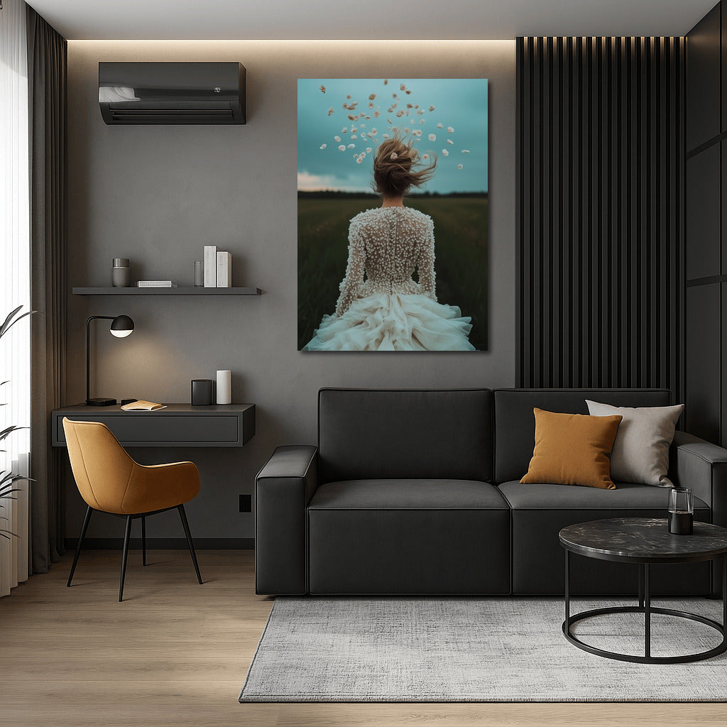 Petals in the air: a mysterious figure in a dress among the fields. A poster for inspiration and romance, enlivens the space. See more from the collection: Wall Art with Women