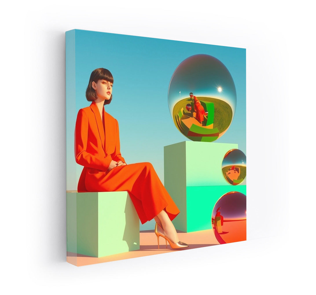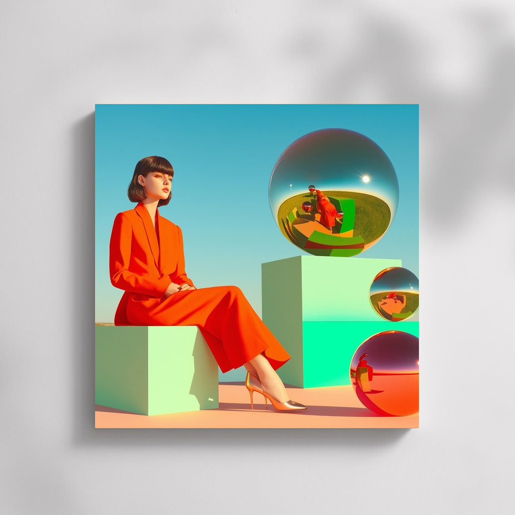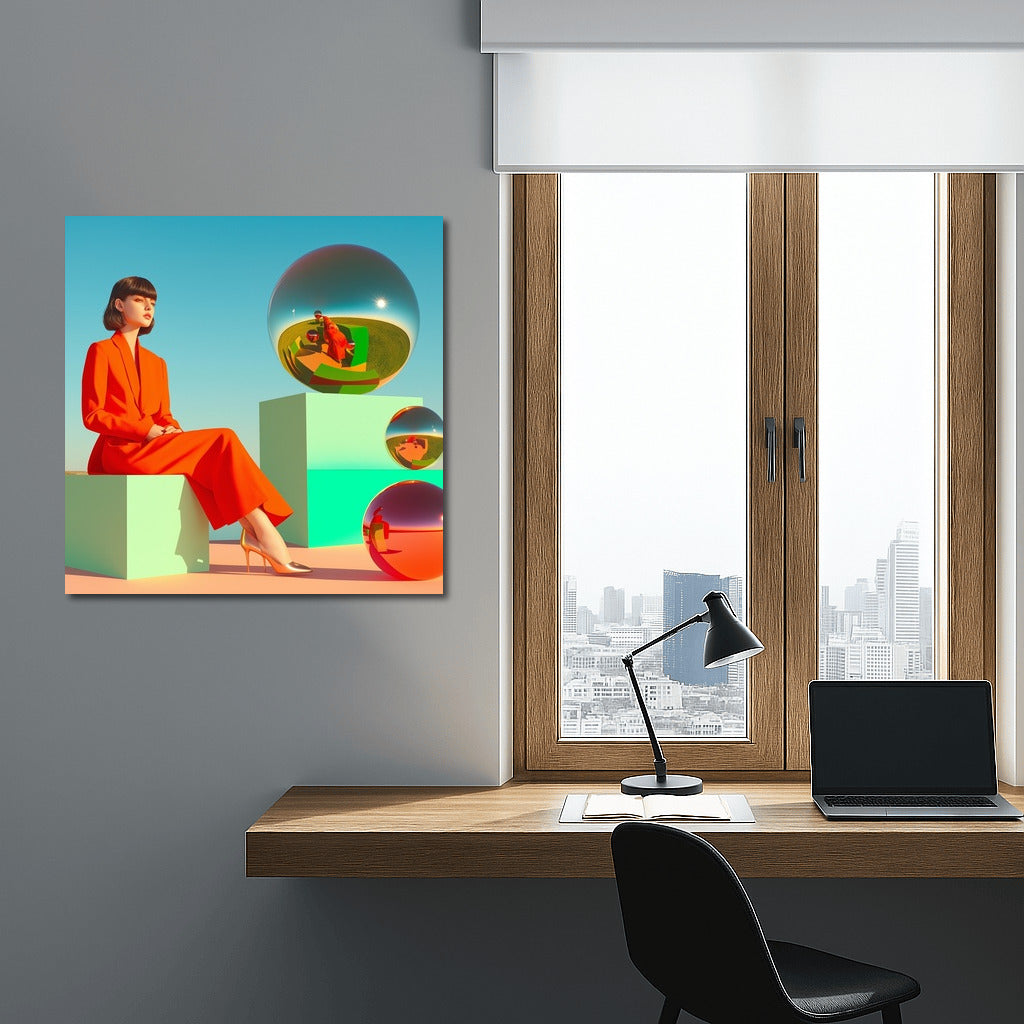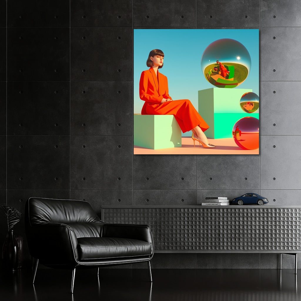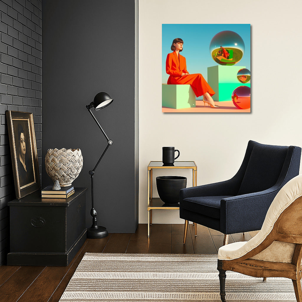 Abstract wall art with colorful spheres and a figure in a red suit. Inspiration and style for your interior! See more from the collection: Mixed Wall Art