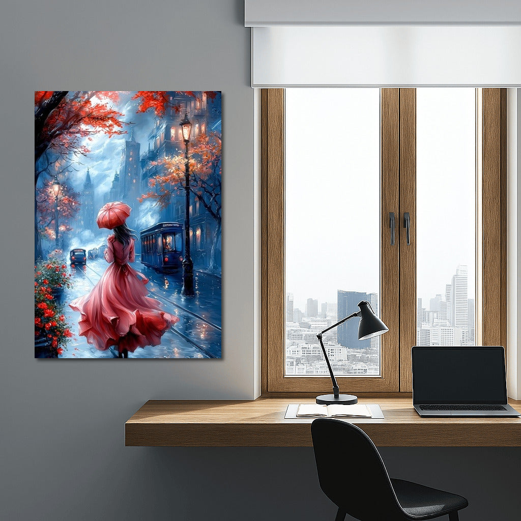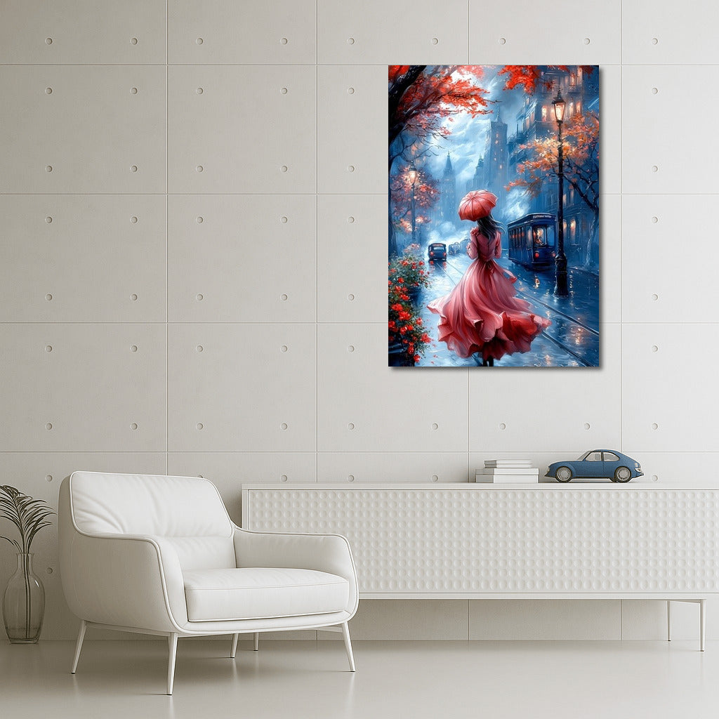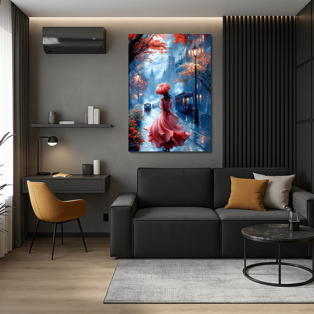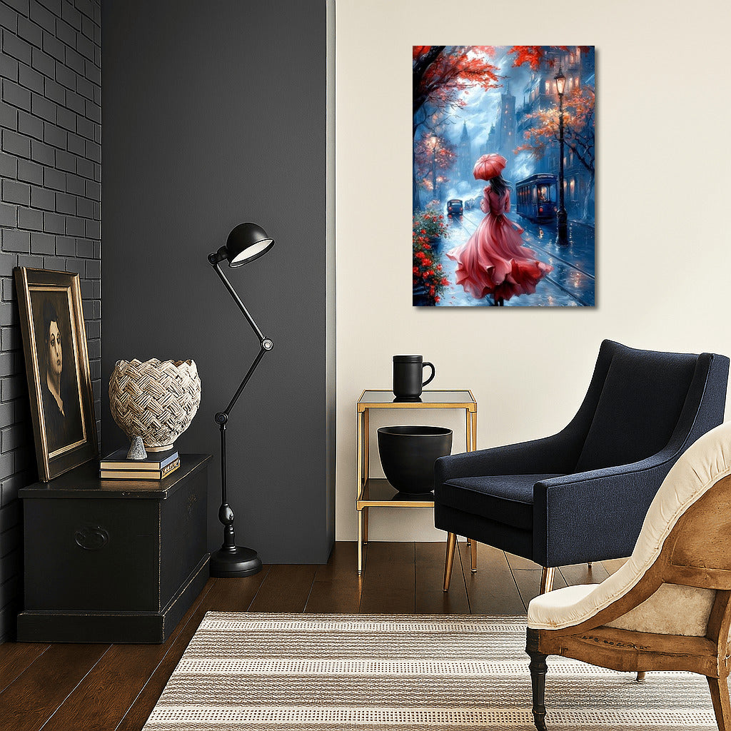 The autumn city comes alive in this painting: a mysterious figure with an umbrella, a mysterious atmosphere and bright colors. Perfect wall art! See more from the collection: Fantasy Art
