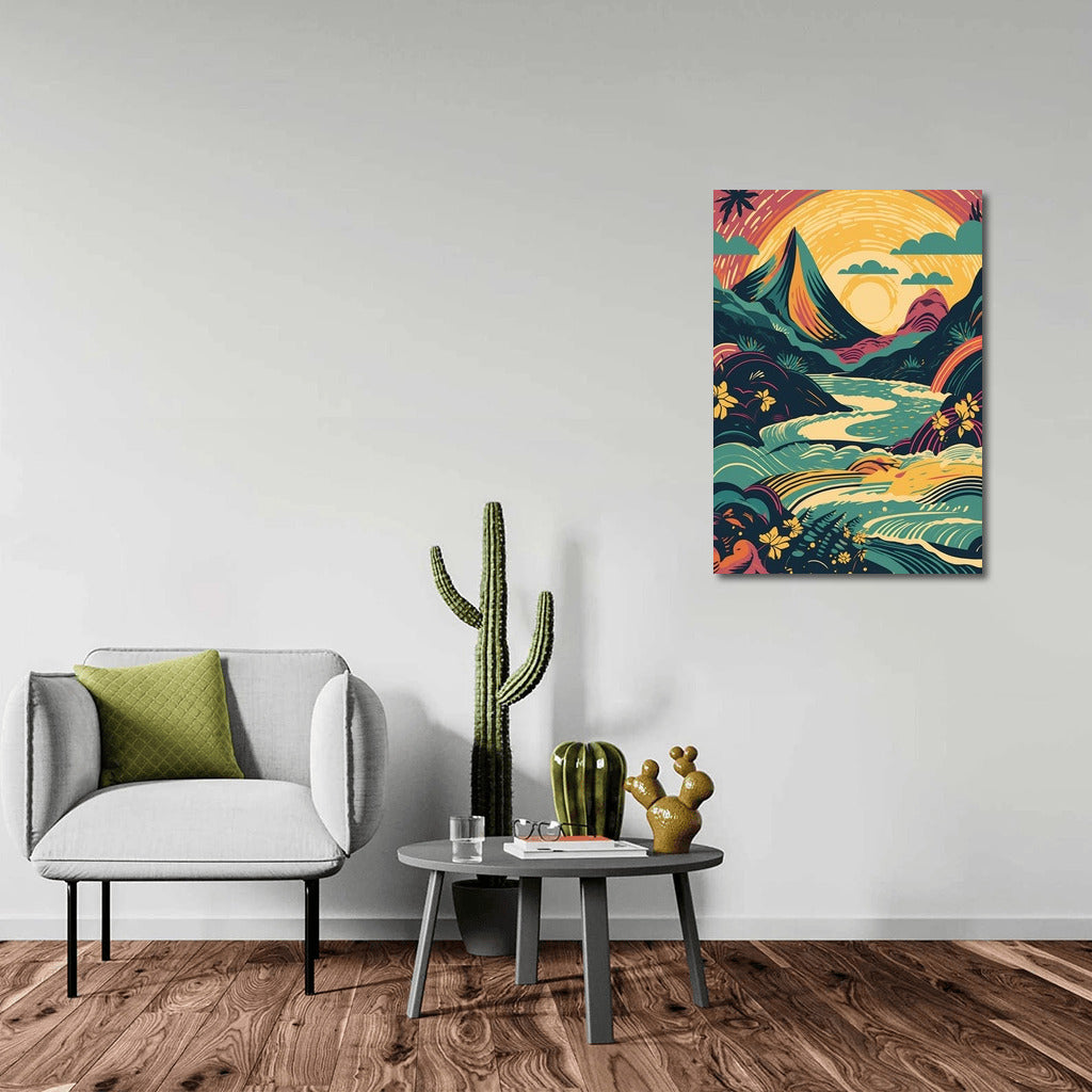 Reveal the harmony of nature in this vibrant poster. Waves and mountains dance in a sunset palette, bringing life to any space. Dream wall art! See more from the collection: Nature & Landscapes Art