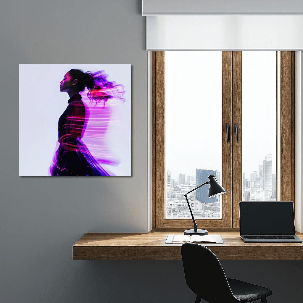 Spectacular wall art: a girl in motion, surrounded by purple swirls of light. Add dynamics to your interior! See more from the collection: Mixed Wall Art