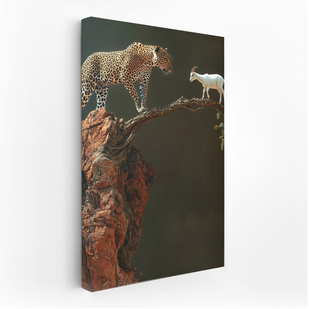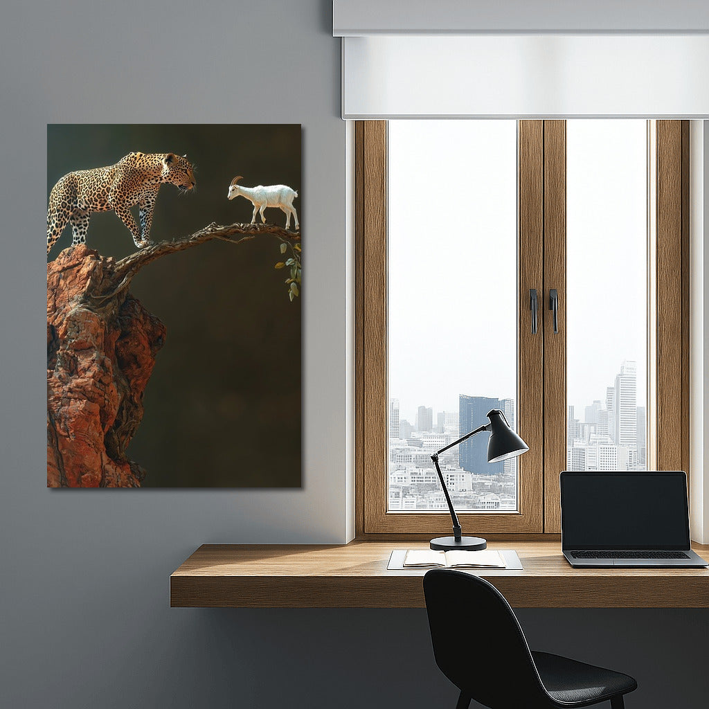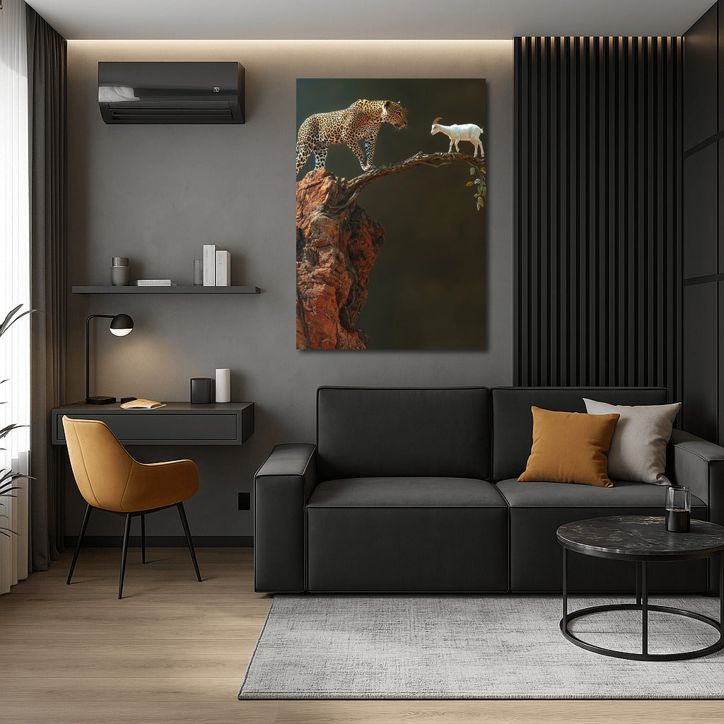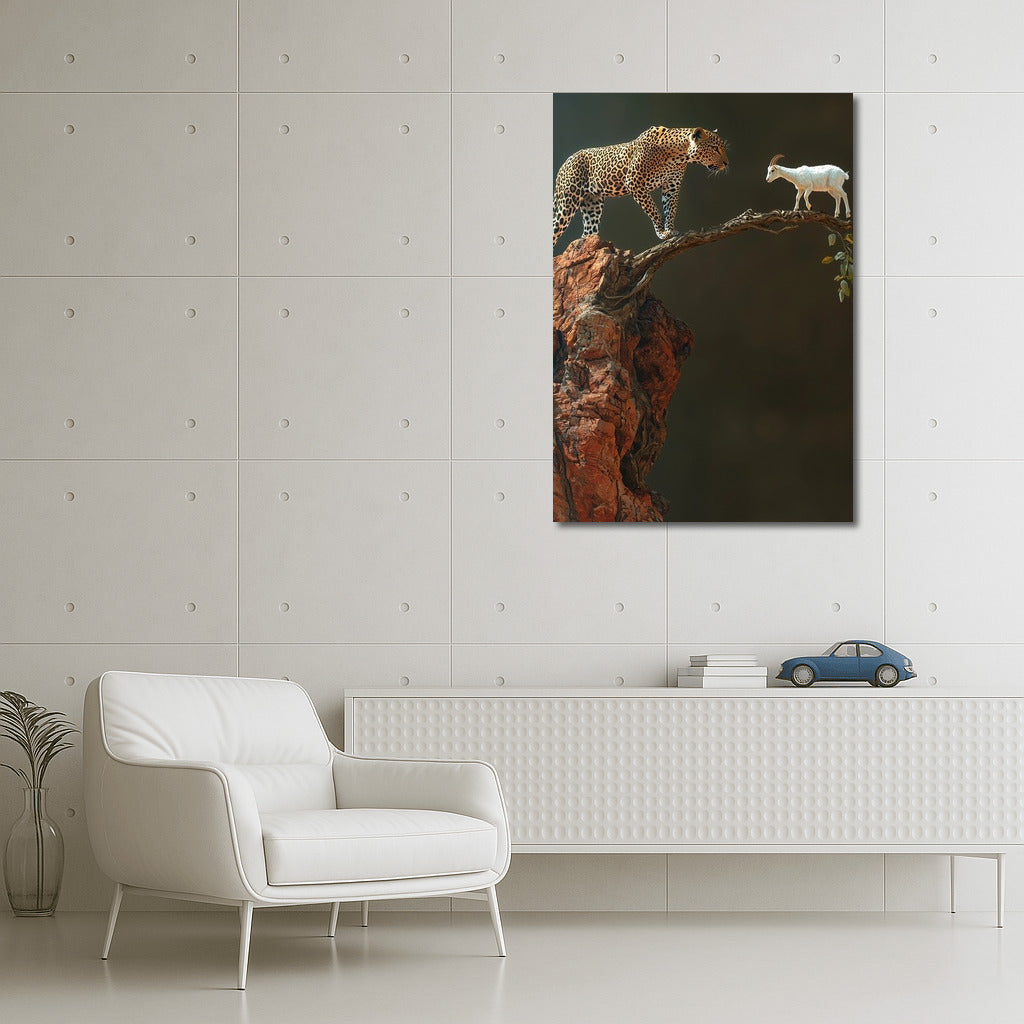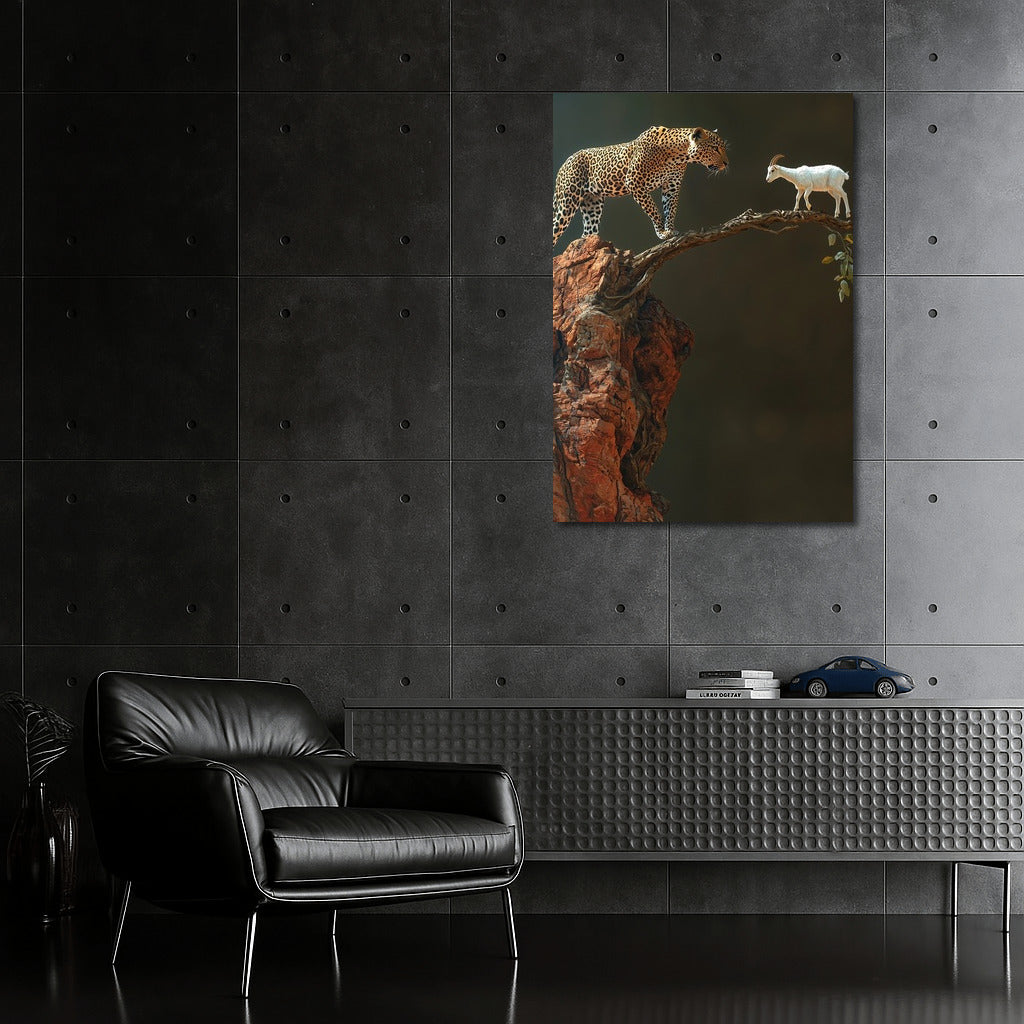 Leopard and goat on a branch: the art of nature in a dramatic encounter. Add dynamics and intrigue to your interior! See more from the collection: Animals Art