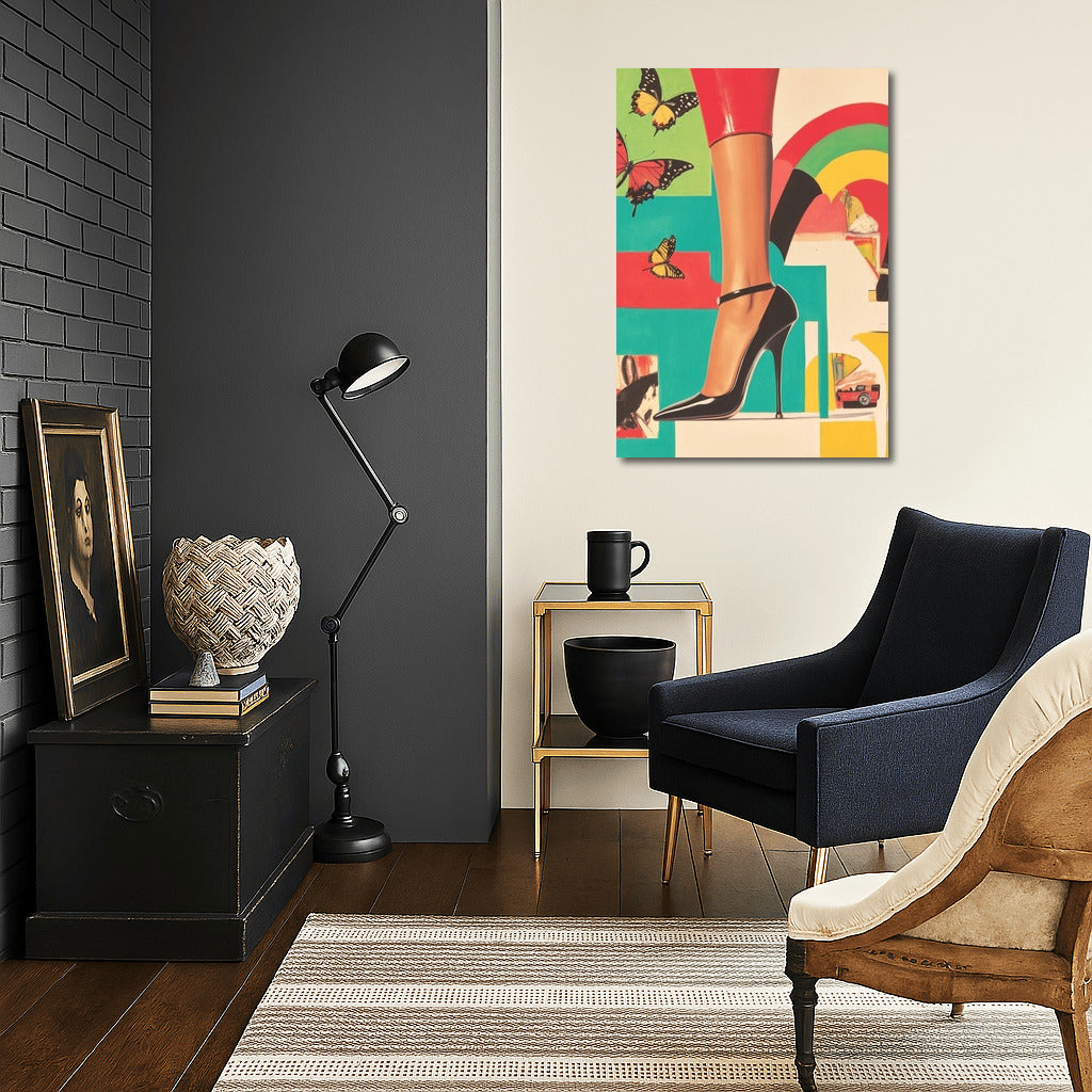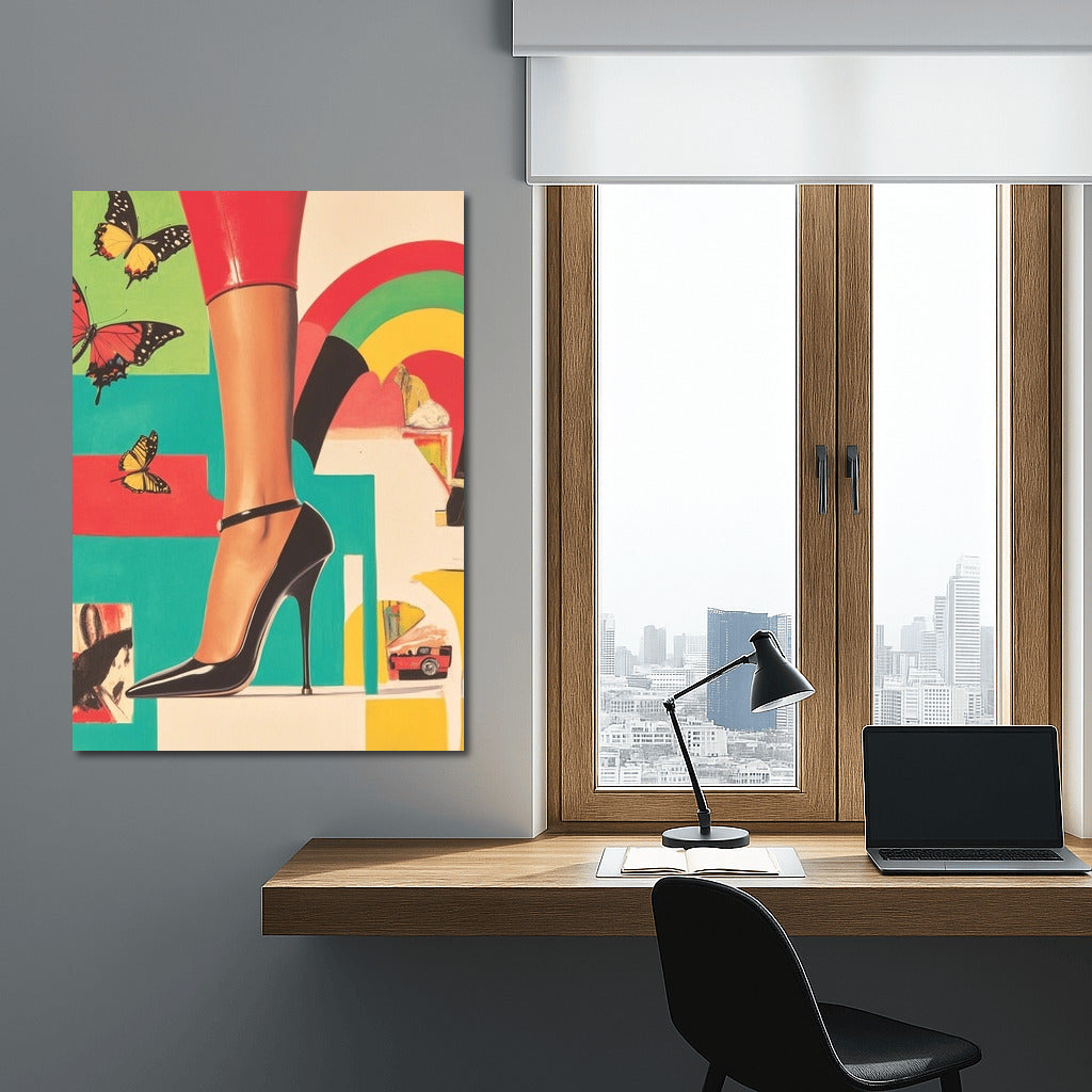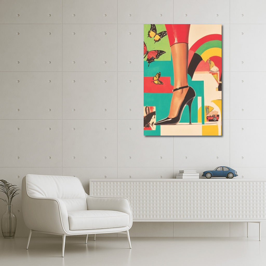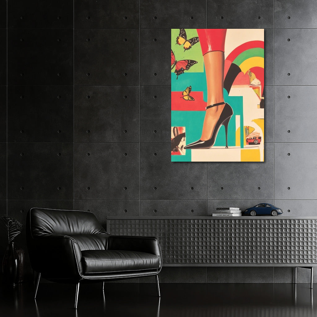 Elegant poster: a bright heel, graceful butterflies and a vintage car create stylish wall art for your interior. See more from the collection: Pop Art