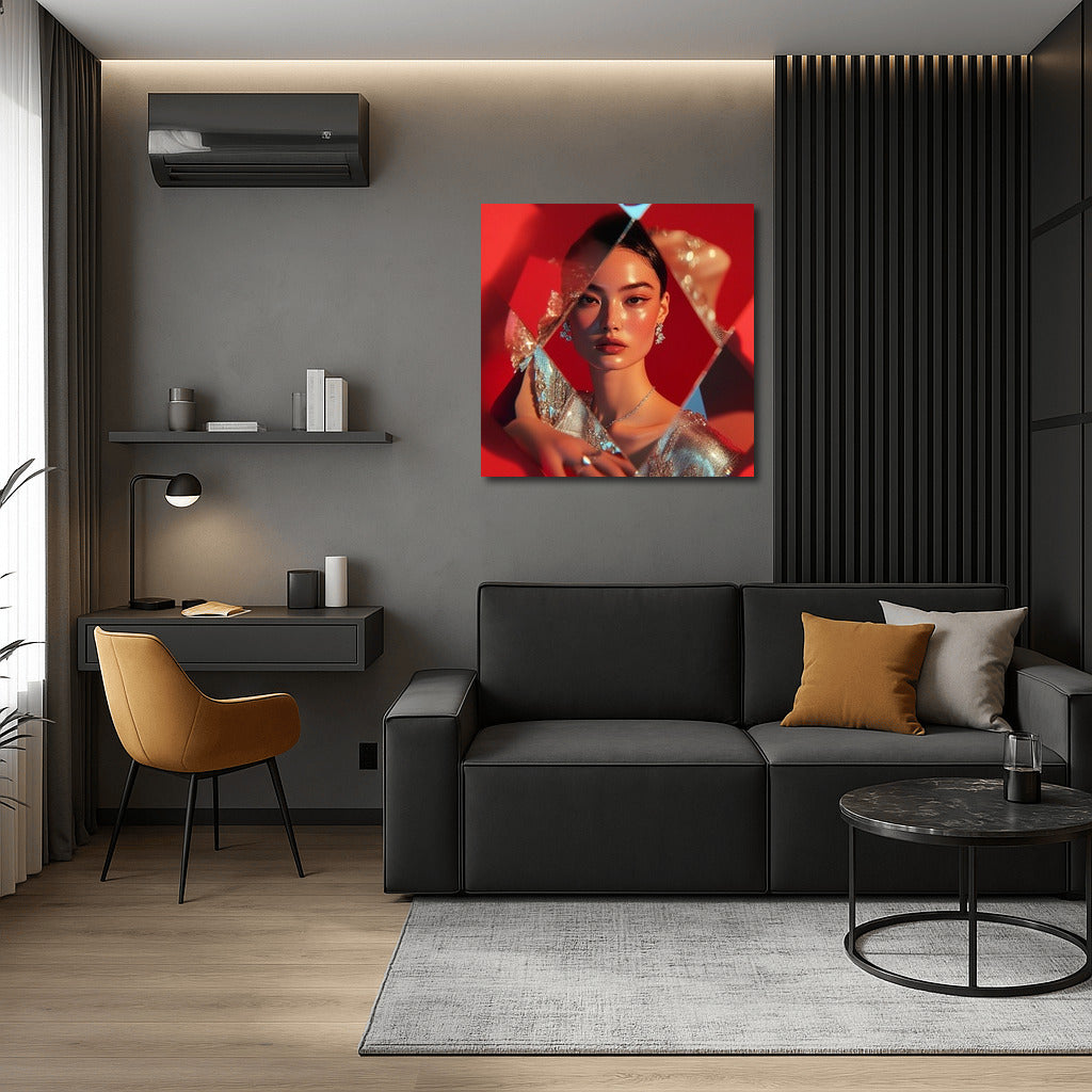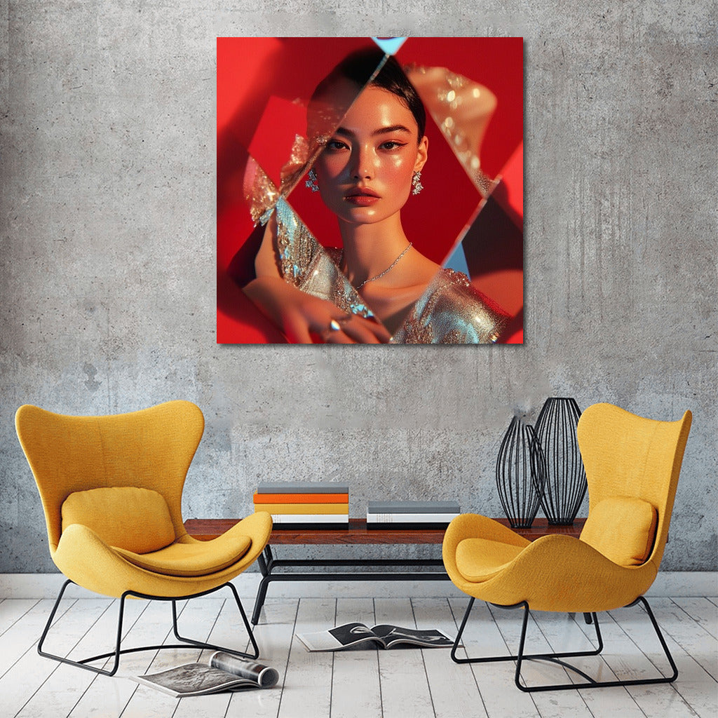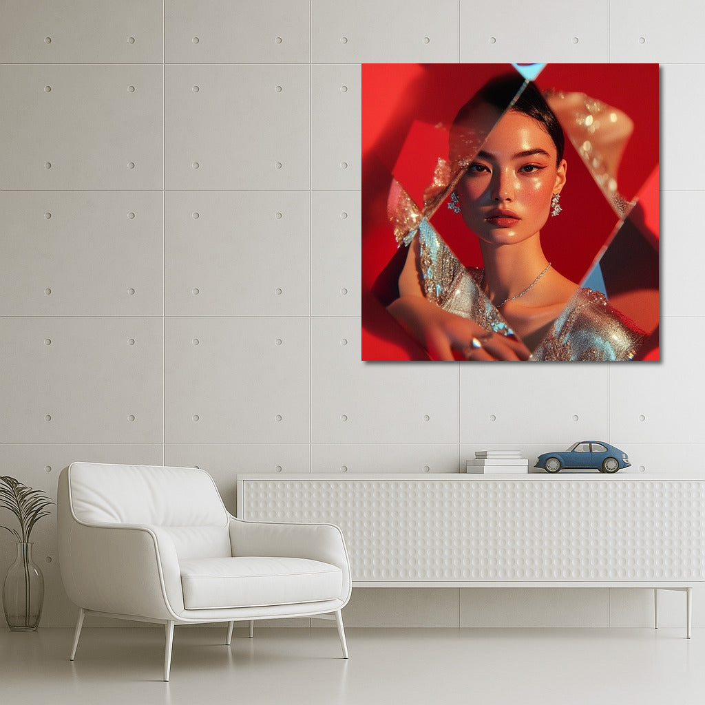 An elegant painting: broken reflections and mysterious images against the backdrop of a scarlet sunset. Modern wall art for inspiration. See more from the collection: Wall Art with Women