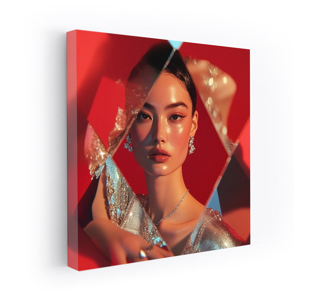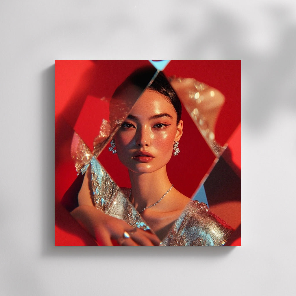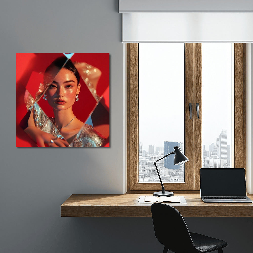 An elegant painting: broken reflections and mysterious images against the backdrop of a scarlet sunset. Modern wall art for inspiration. See more from the collection: Wall Art with Women
