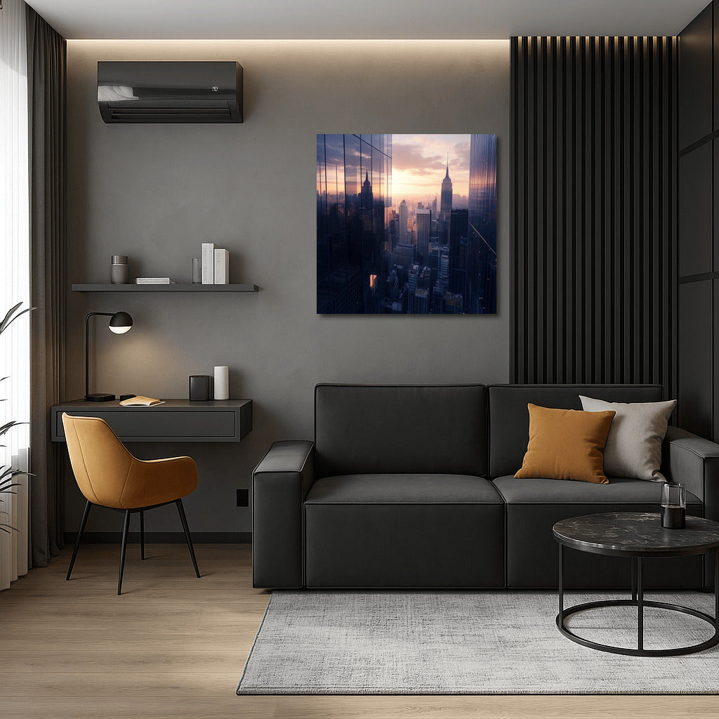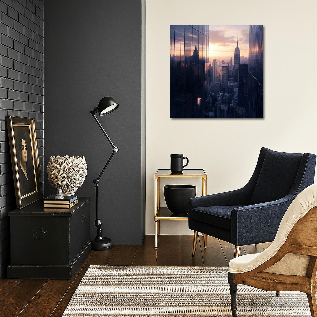 Enjoy the cityscape with this poster: incredible view of skyscrapers immersed in a soft sunrise. Dream wall art! See more from the collection: Cityscapes & Skylines Art