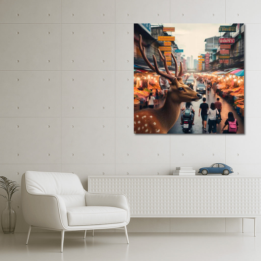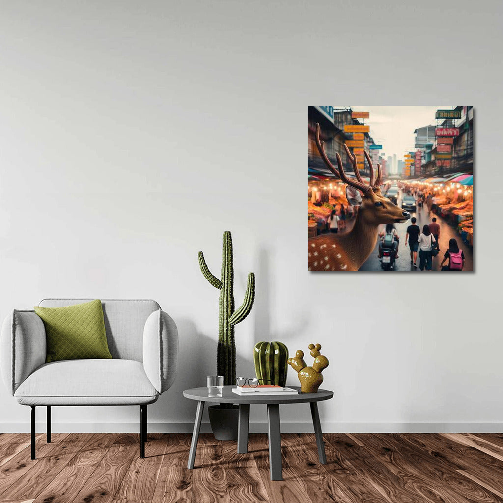 A deer in the middle of a bustling Thai market on a poster. Vibrant wall art that brings Bangkok's atmosphere to life right in your home! See more from the collection: Animals Art