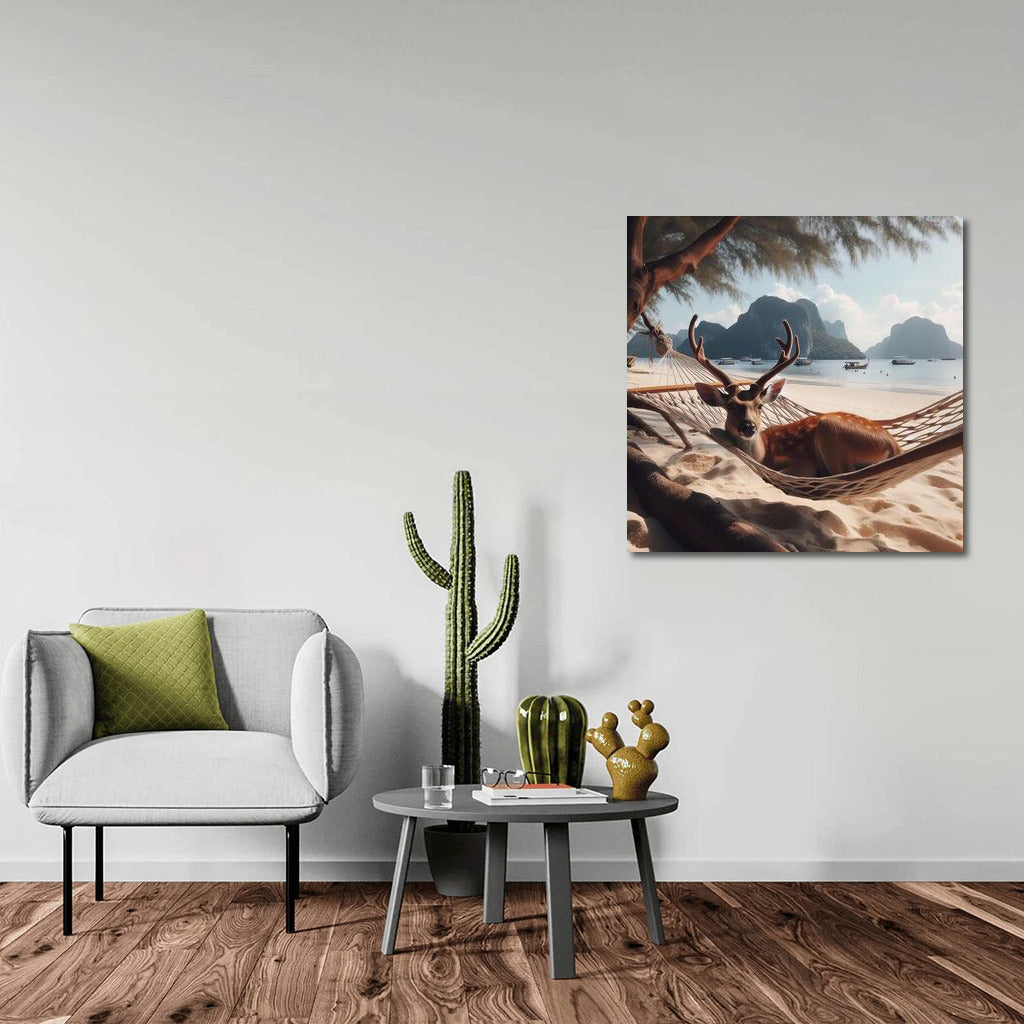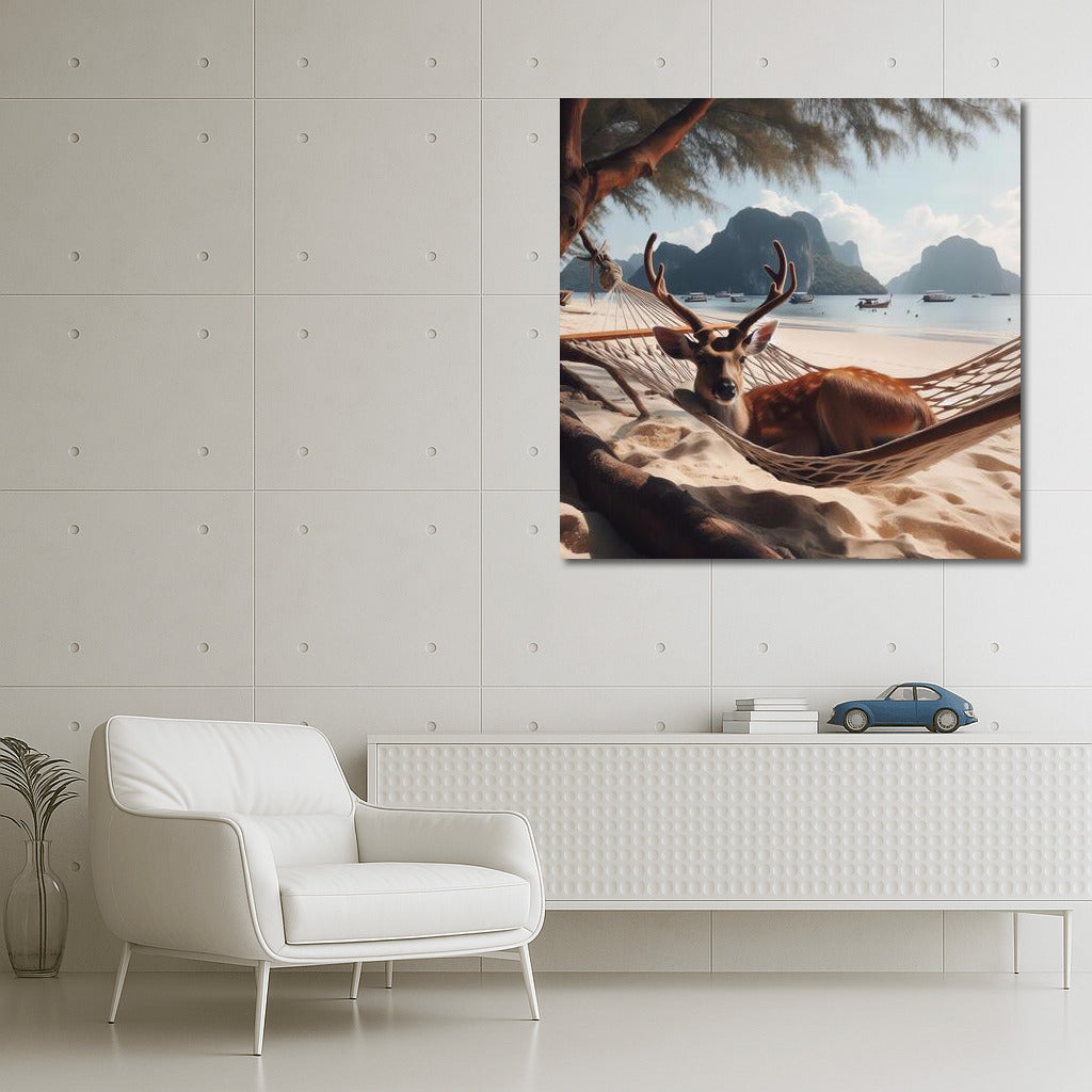 Deer in a Hammock on the Beach: Serene Relaxation Wall Art