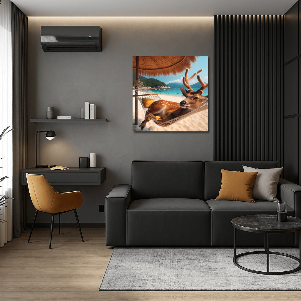 Lose yourself in dreams with wall art: a deer relaxing in a hammock on a paintingsque beach. Summer solitude in every look! See more from the collection: Animals Art