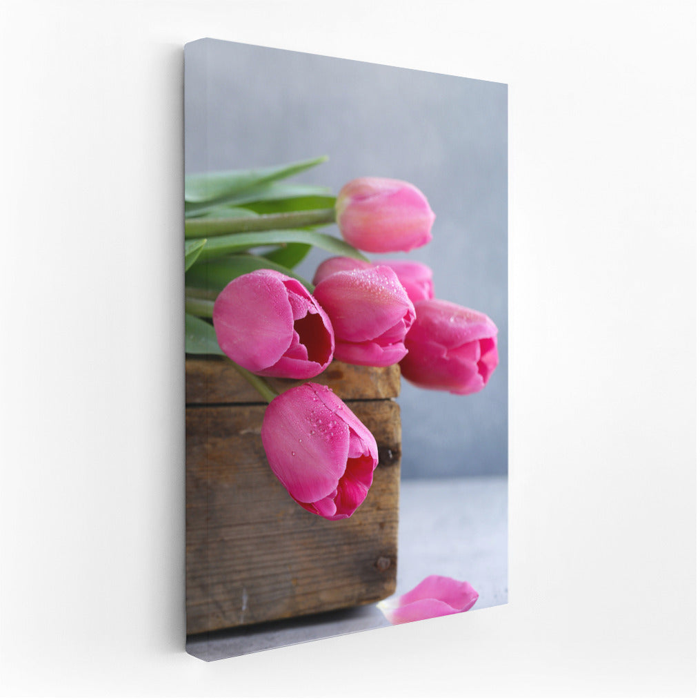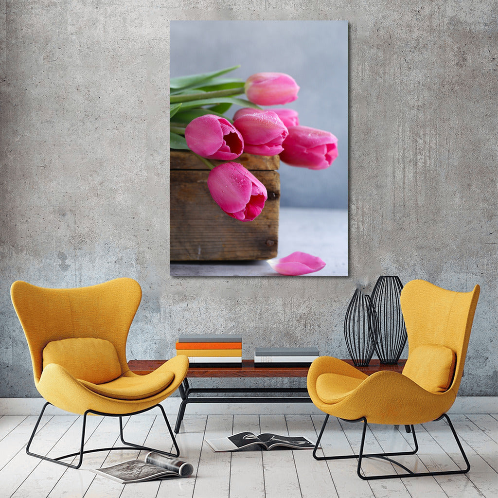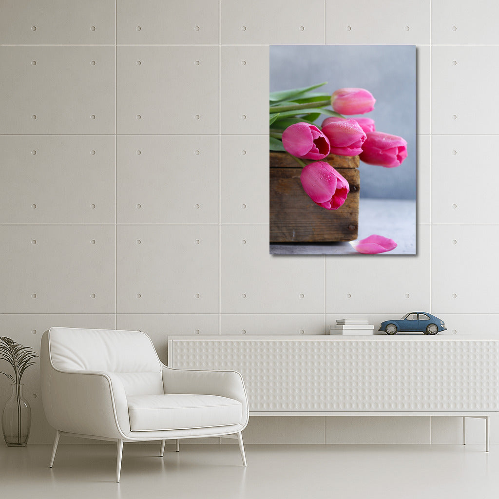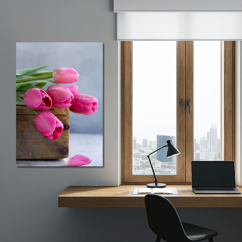 Pink tulips against a gray sky - a gentle song of nature. A poster that will enliven any interior. Wall magic! See more from the collection: Flowers Art
