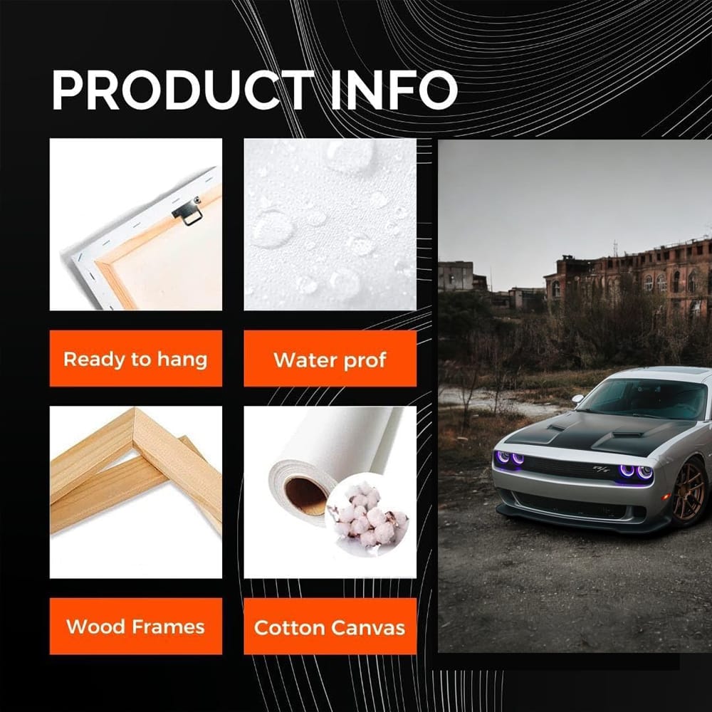 This poster is simply bomb! Dodge Challenger against the backdrop of an abandoned city is a painting that gives you goosebumps. Wall art for those who are into cars. This car, standing alone, embodies brutality and freedom. Ideal art for a garage or a man cave. See more from the collection: Dodge Art
