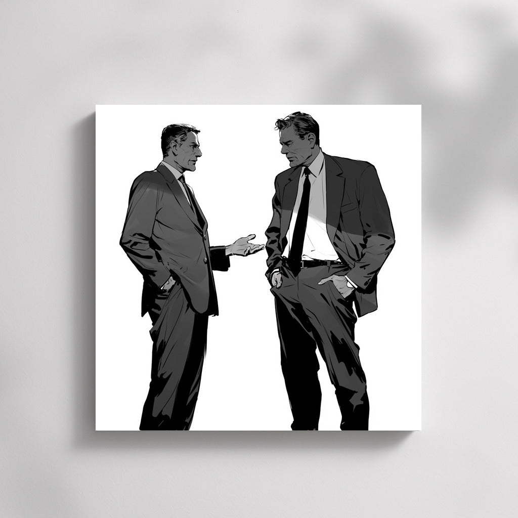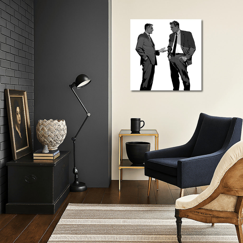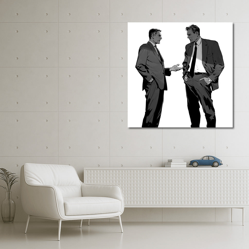 Two silhouettes in formal suits, deep in conversation. An elegant poster that will liven up any space with stylish art. See more from the collection: Black and White Art