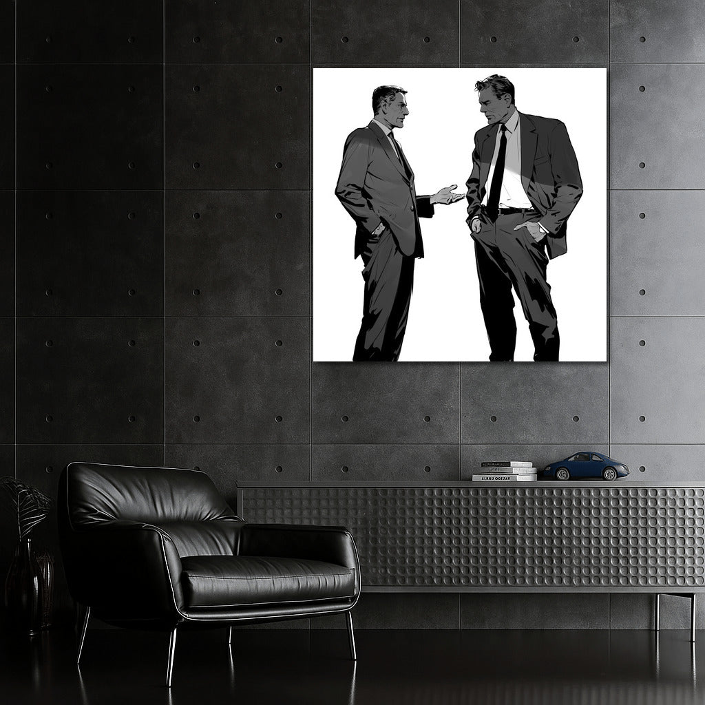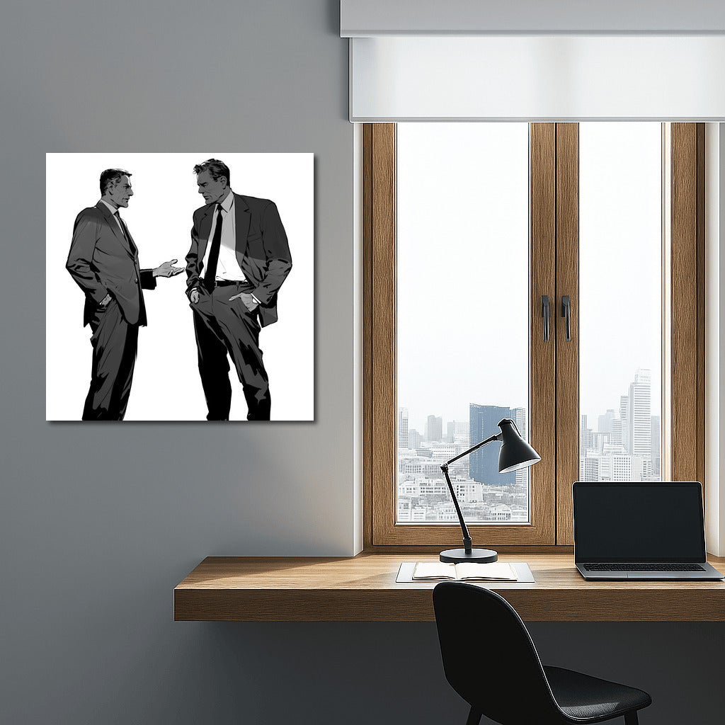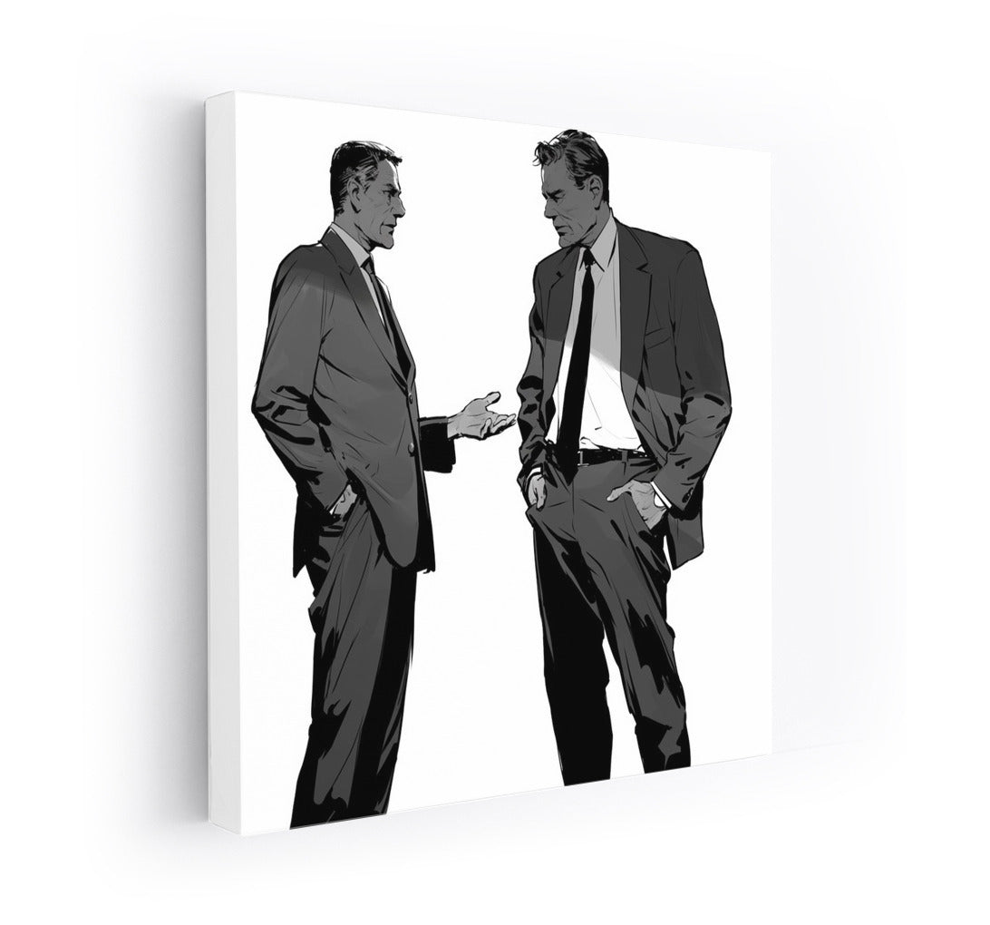 Two silhouettes in formal suits, deep in conversation. An elegant poster that will liven up any space with stylish art. See more from the collection: Black and White Art