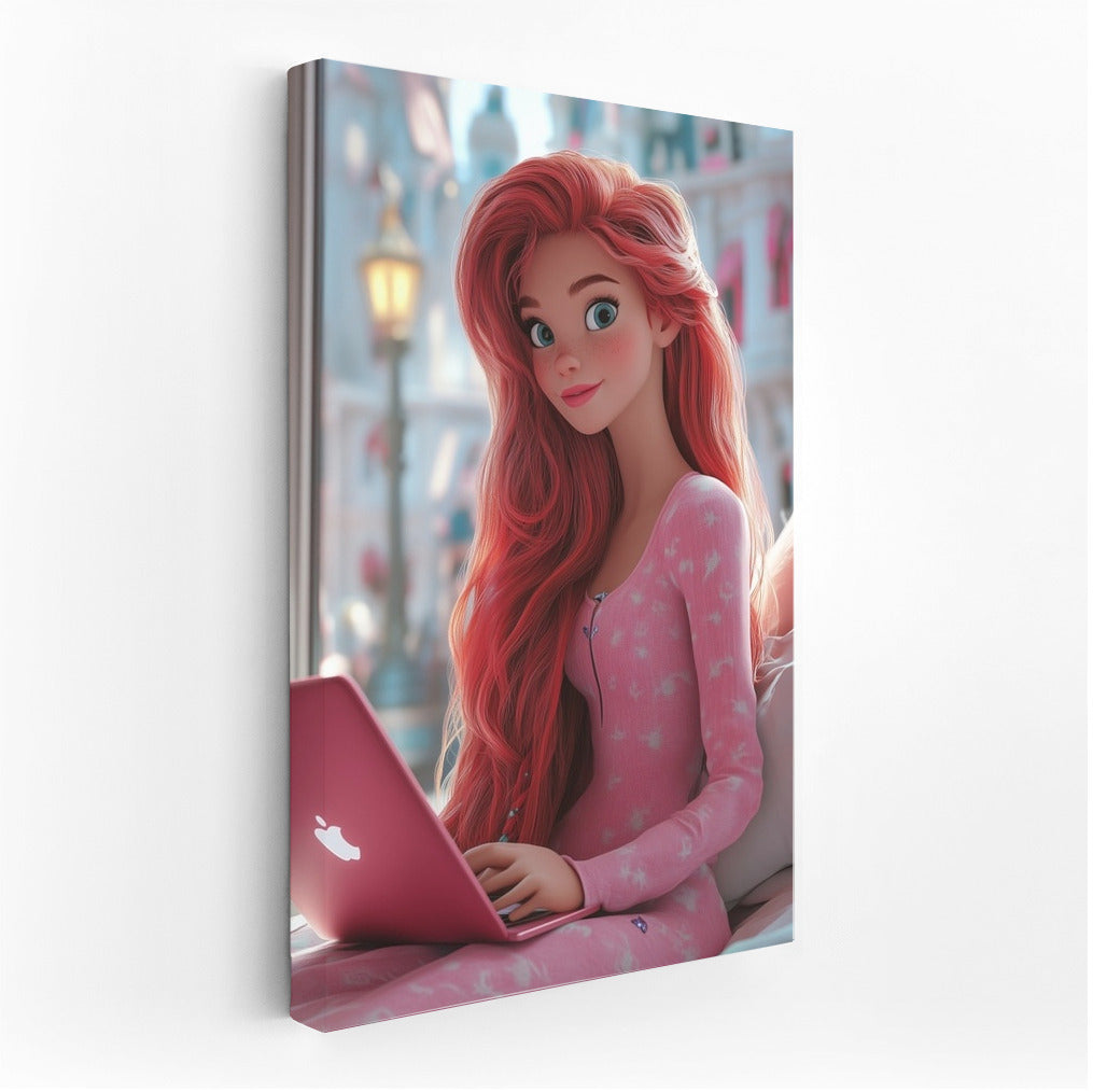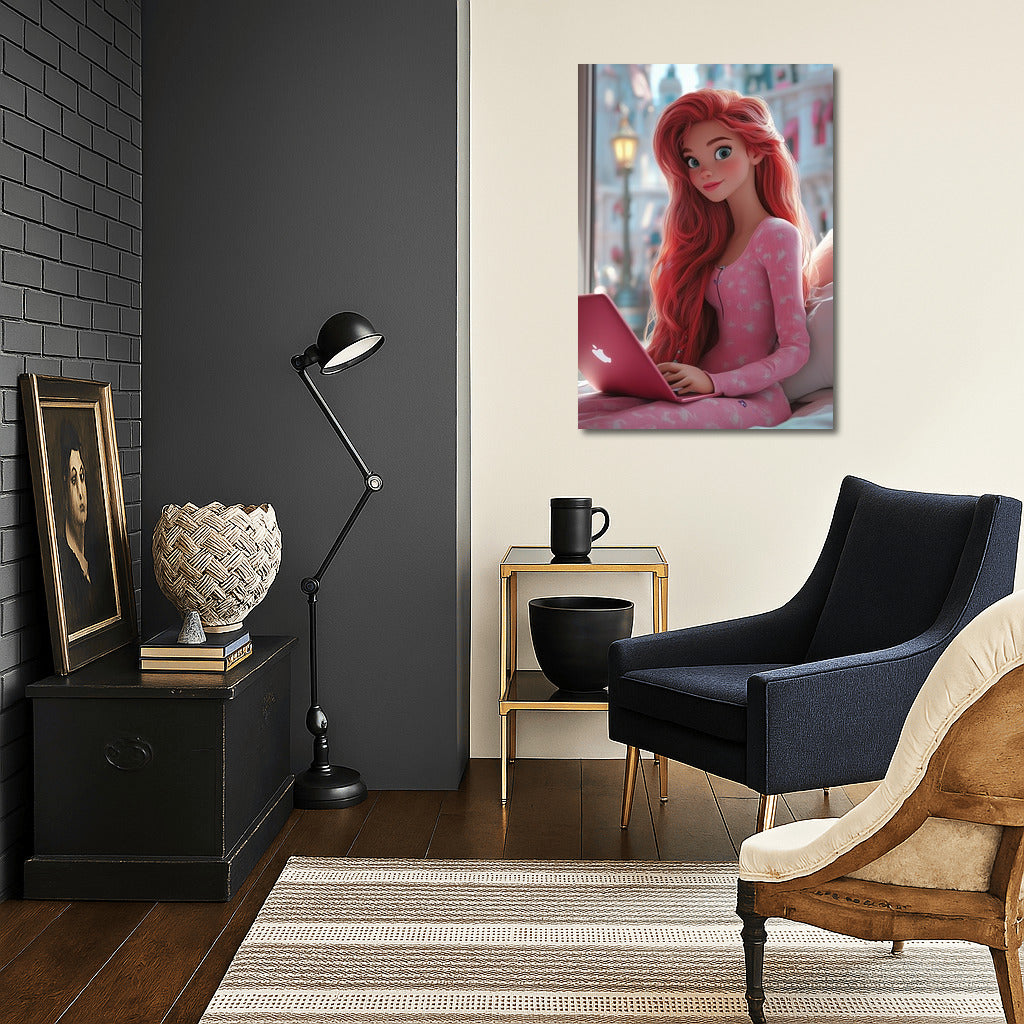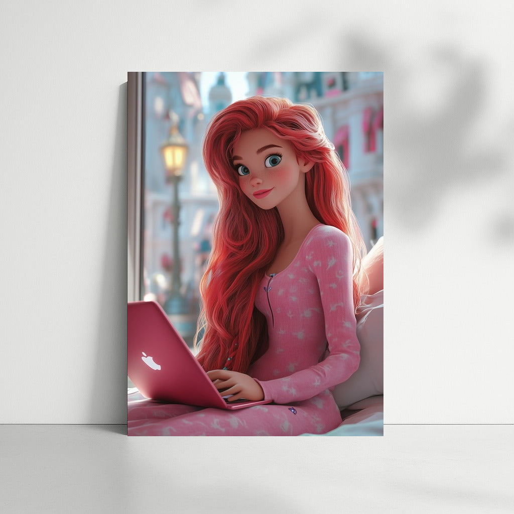 A graceful painting: a character with bright hair and a laptop, immersed in a dream world. A perfect poster for mood and coziness. See more from the collection: Cartoon Art