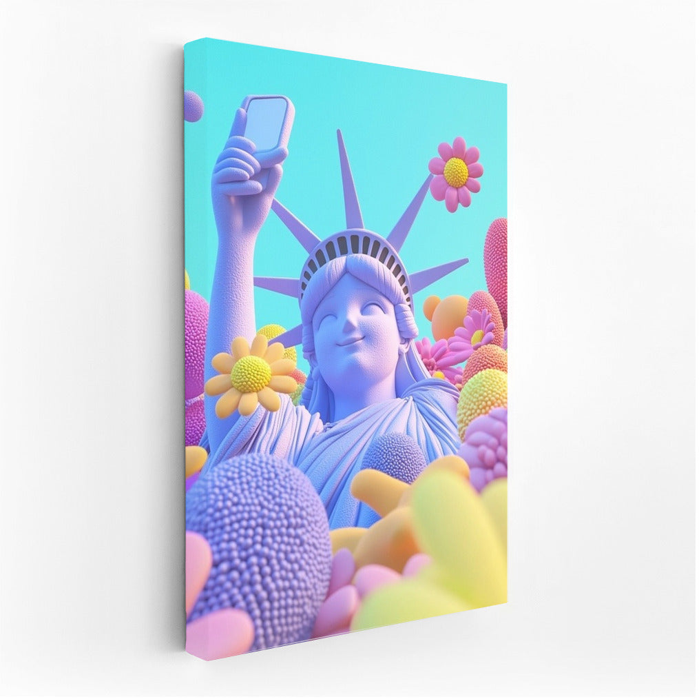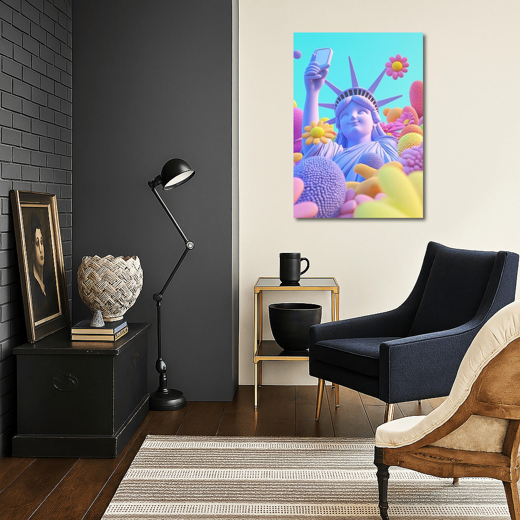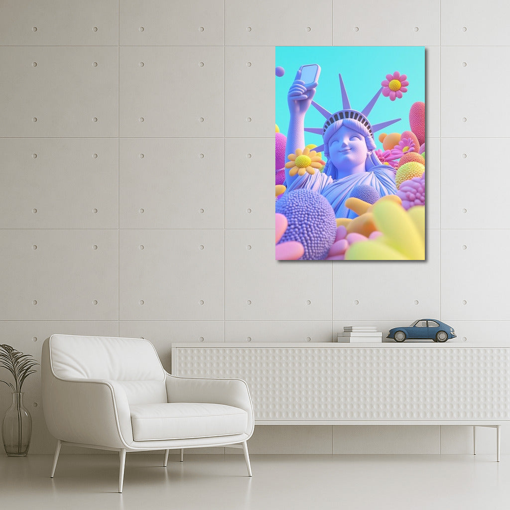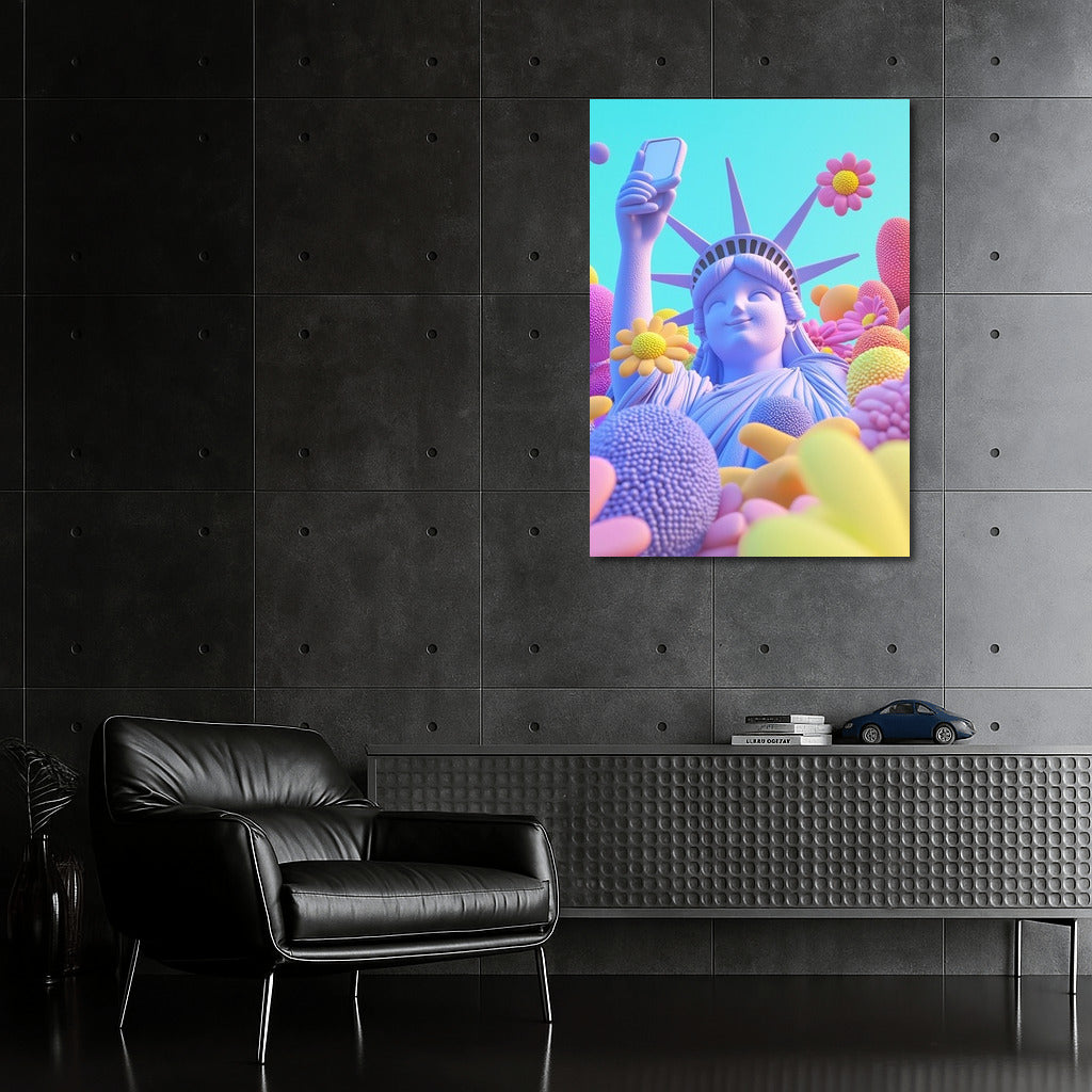 Vibrant poster: statue and smartphone among flowers! Wall art where reality meets dreams. See more from the collection: Mixed Wall Art