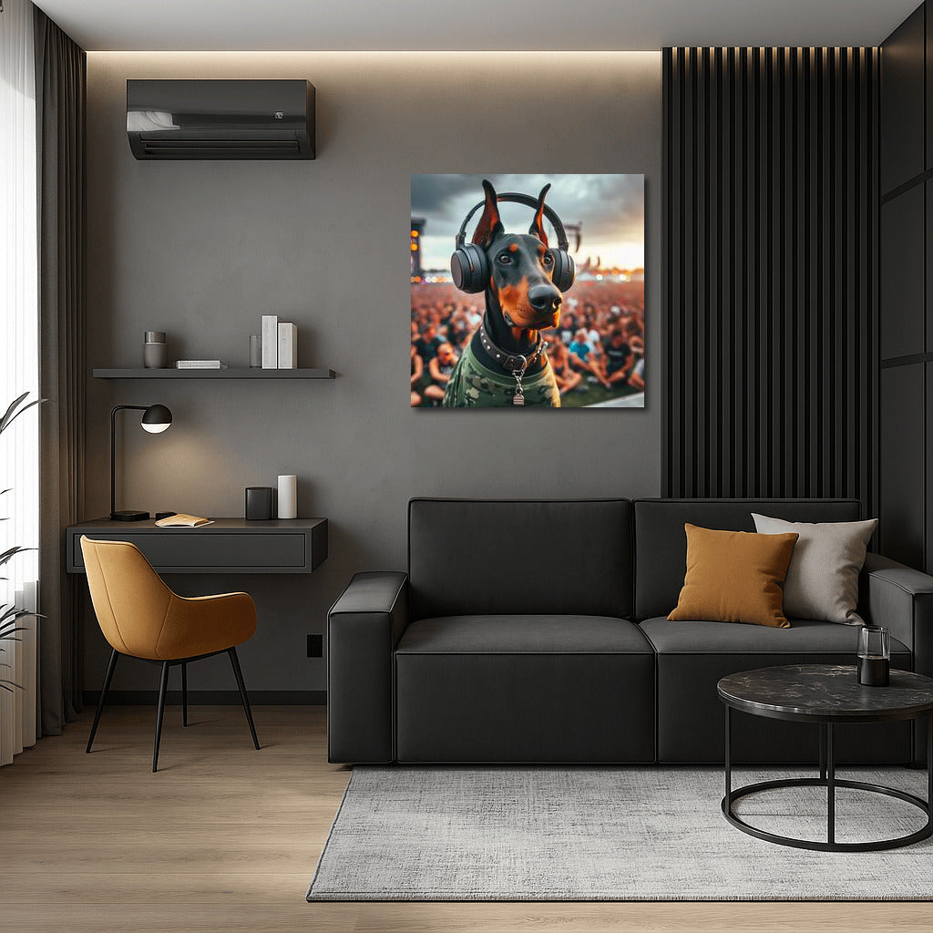 Doberman at the Festival: Music and Style in Headphones Wall Art