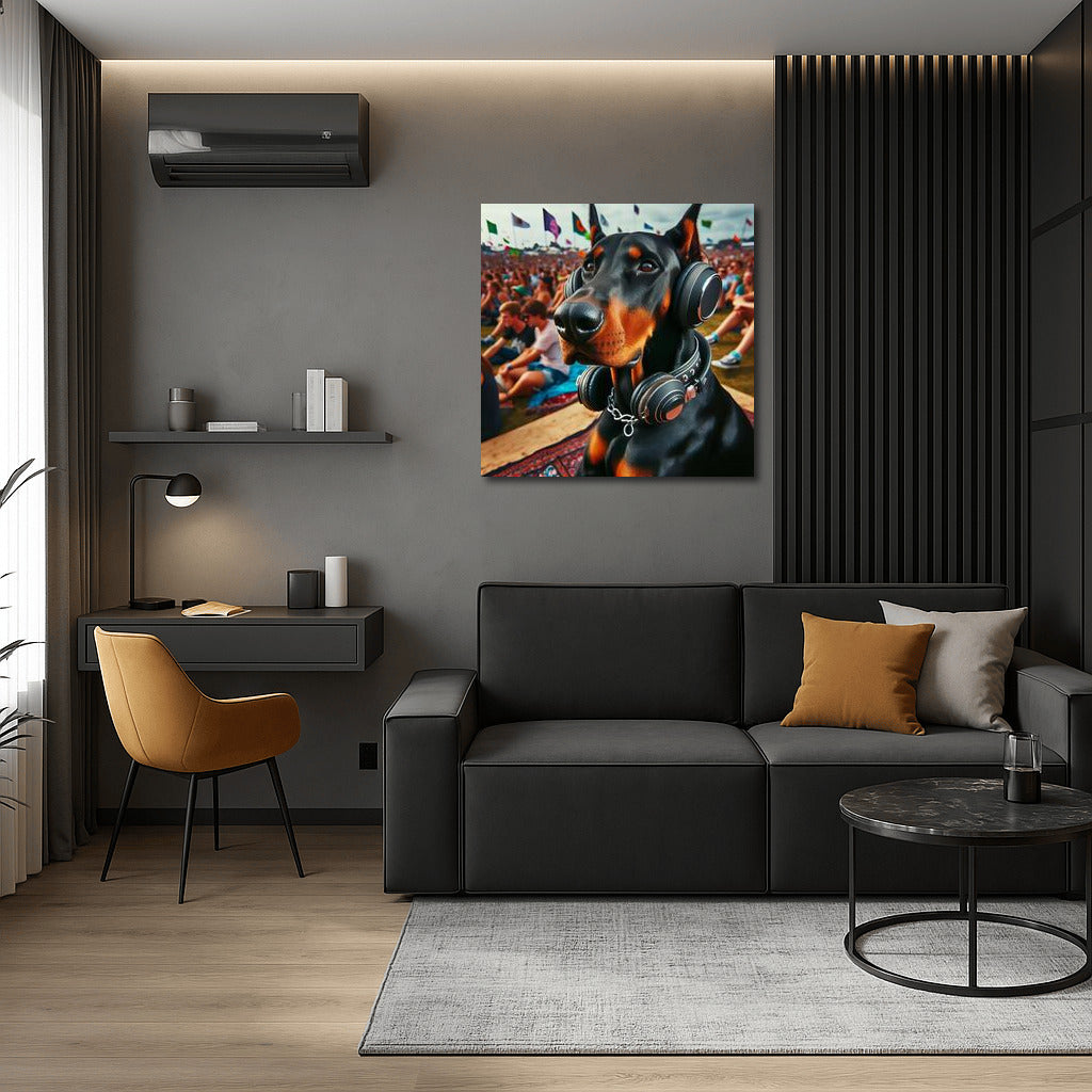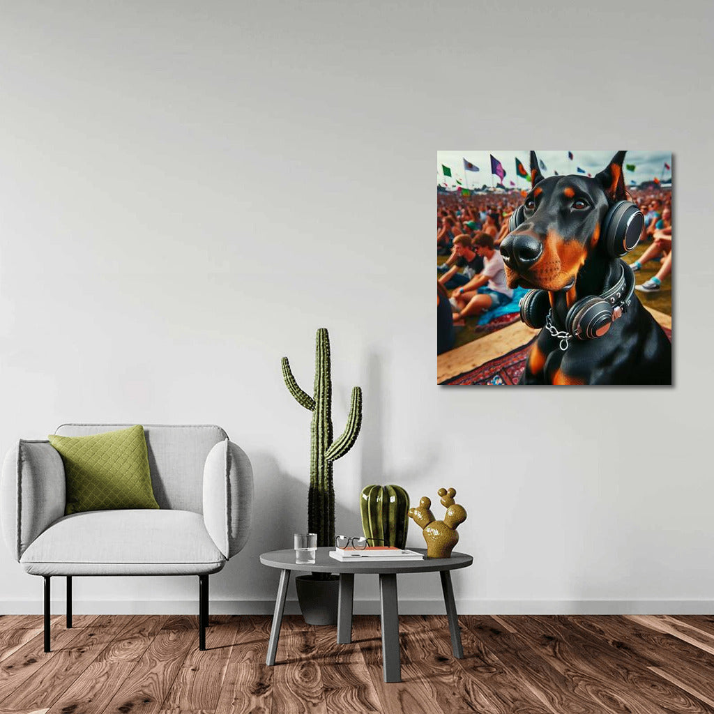 Doberman at the Festival: Stylish Headphones and Music Wall Art