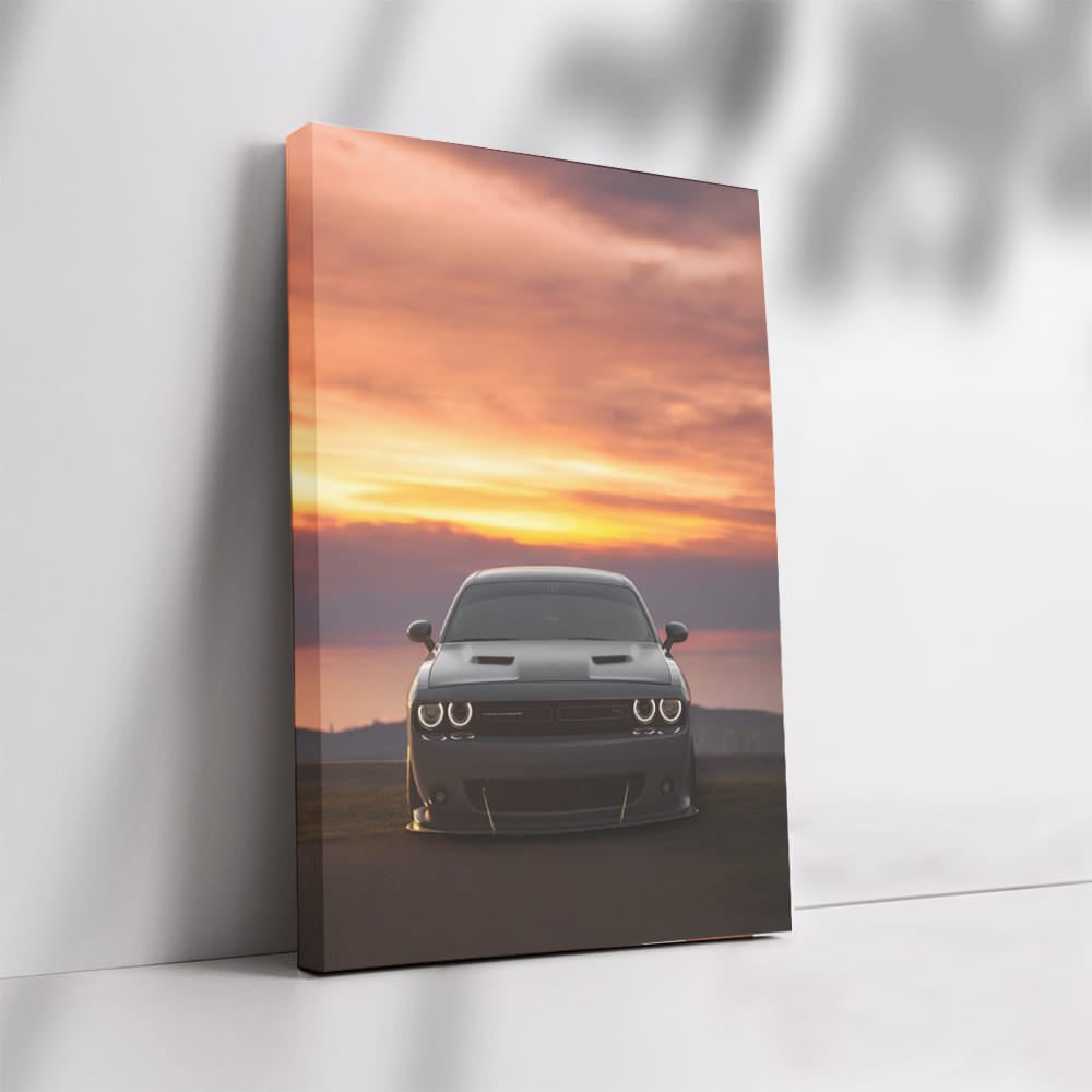 Hey bro, check out this poster! Dodge Challenger at sunset is like every car fan's dream. Wall art that pumps adrenaline straight into your room! This painting is pure power and style on the wall. Want your wall to roar? Here's your choice! See more from the collection: Dodge Art