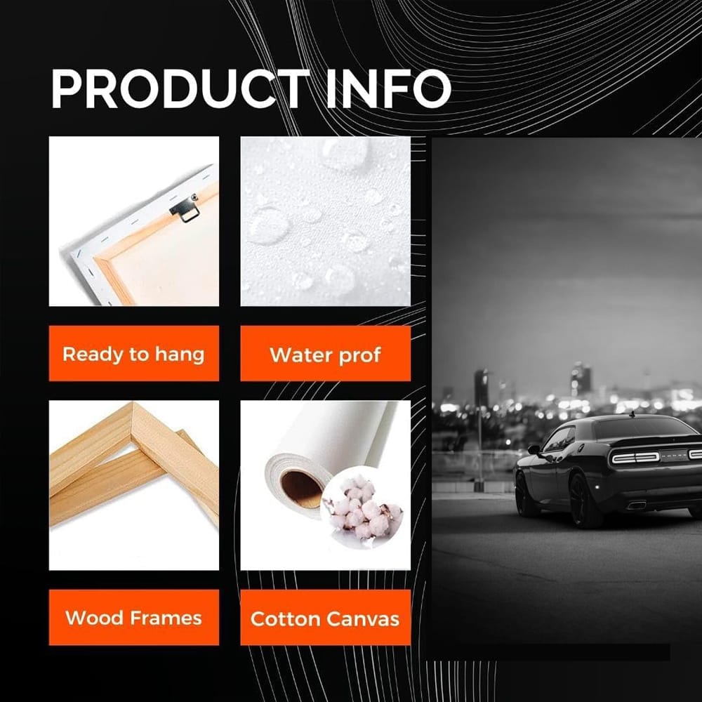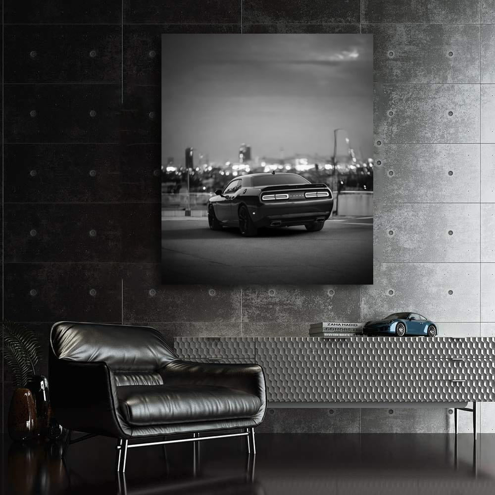 Guys, this painting is just fire! A poster with a Dodge Challenger in black and white style is pure adrenaline on the wall. Wall art for those who are in the know. Such art will show everyone that you really know about cars and respect the classics. See more from the collection: Dodge Art