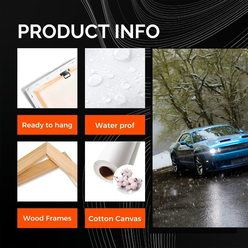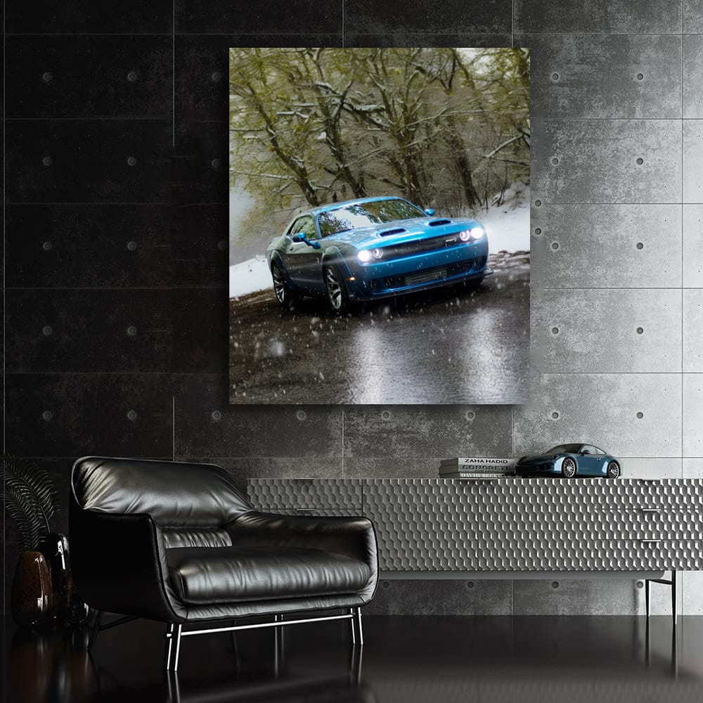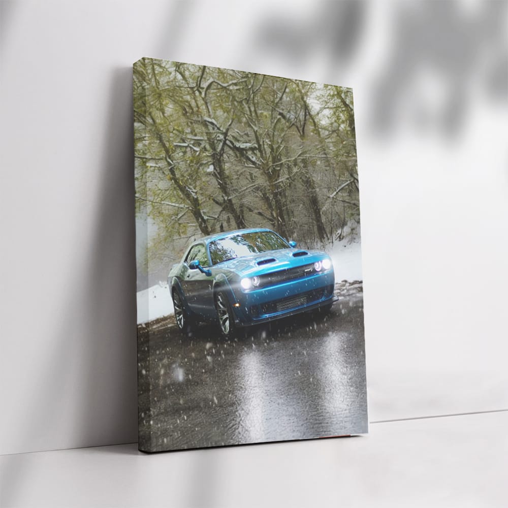 This poster is a blast for car fans! Dodge Challenger in the snow, like a beast on the hunt. The painting screams with power and style, will worthily decorate the wall of any garage. Wall art for those who live at speed and are not afraid of bold decisions. See more from the collection: Dodge Art