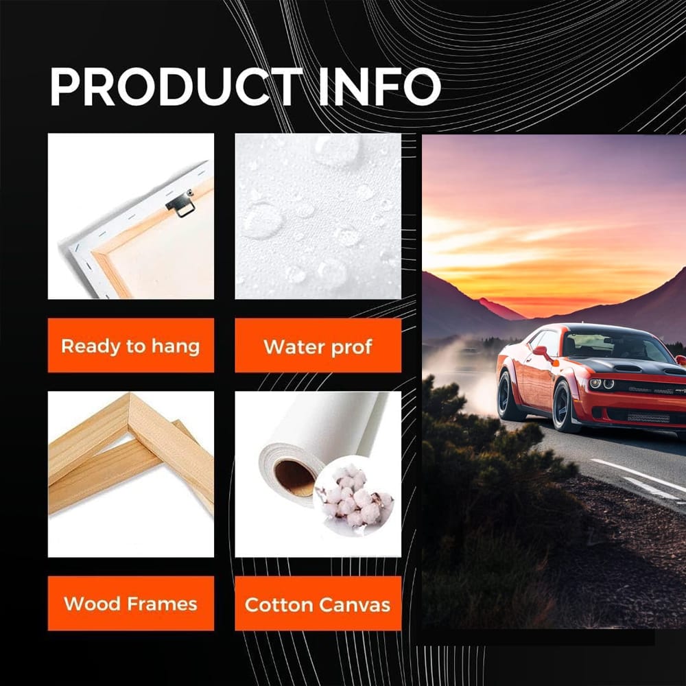 This poster is a real bomb! The painting with Dodge Challenger on the road is pure adrenaline. Wall art that will give you goosebumps. An explosive mix of speed and power. Simply a must-have for everyone who lives on the edge. See more from the collection: Dodge Art