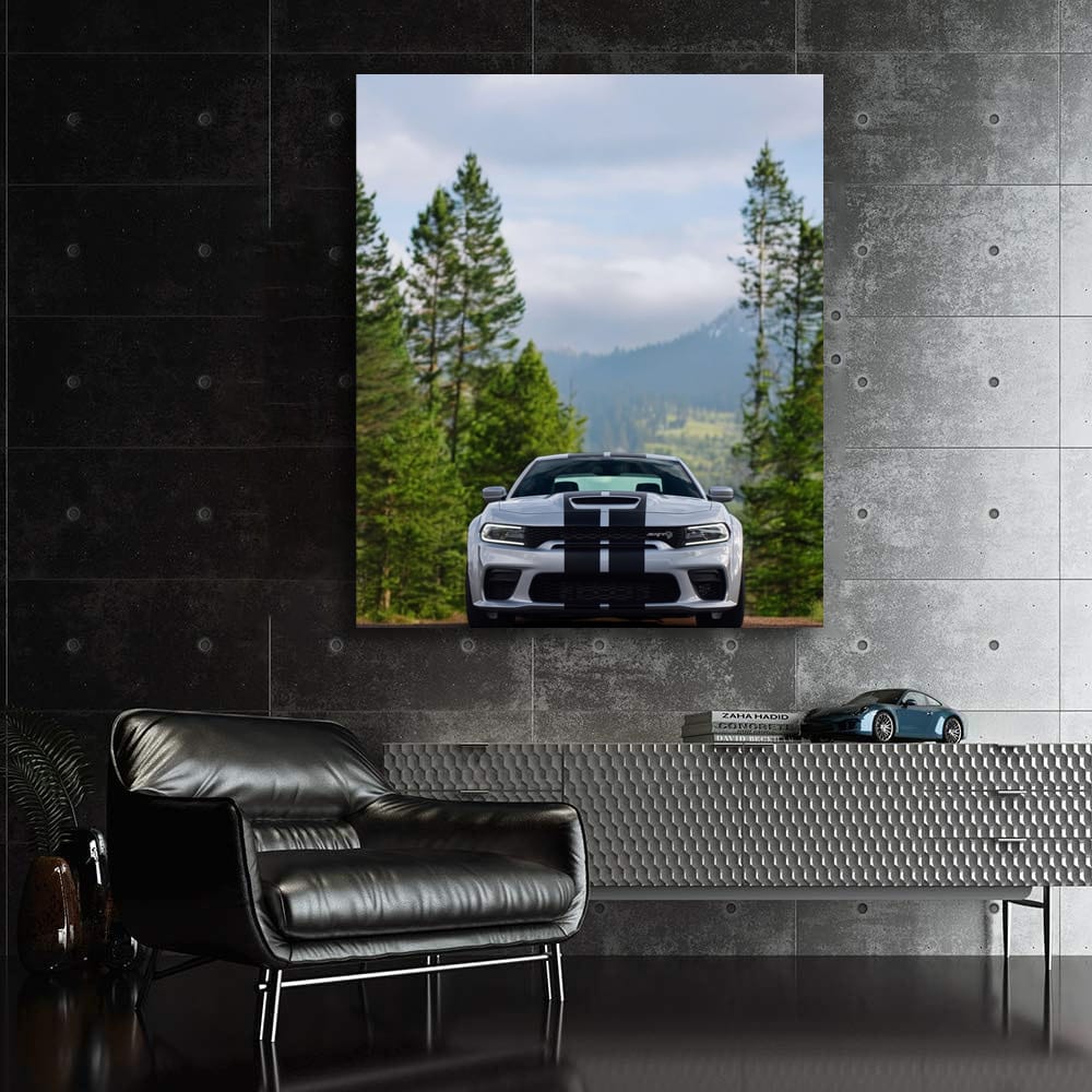 Just look at this painting! This poster with a Dodge Charger in the forest is just fire! A brutal beast against the backdrop of wild nature. Wall art for true connoisseurs of speed and power. Hang this on your wall and you'll immediately be in a cool mood! See more from the collection: Dodge Art