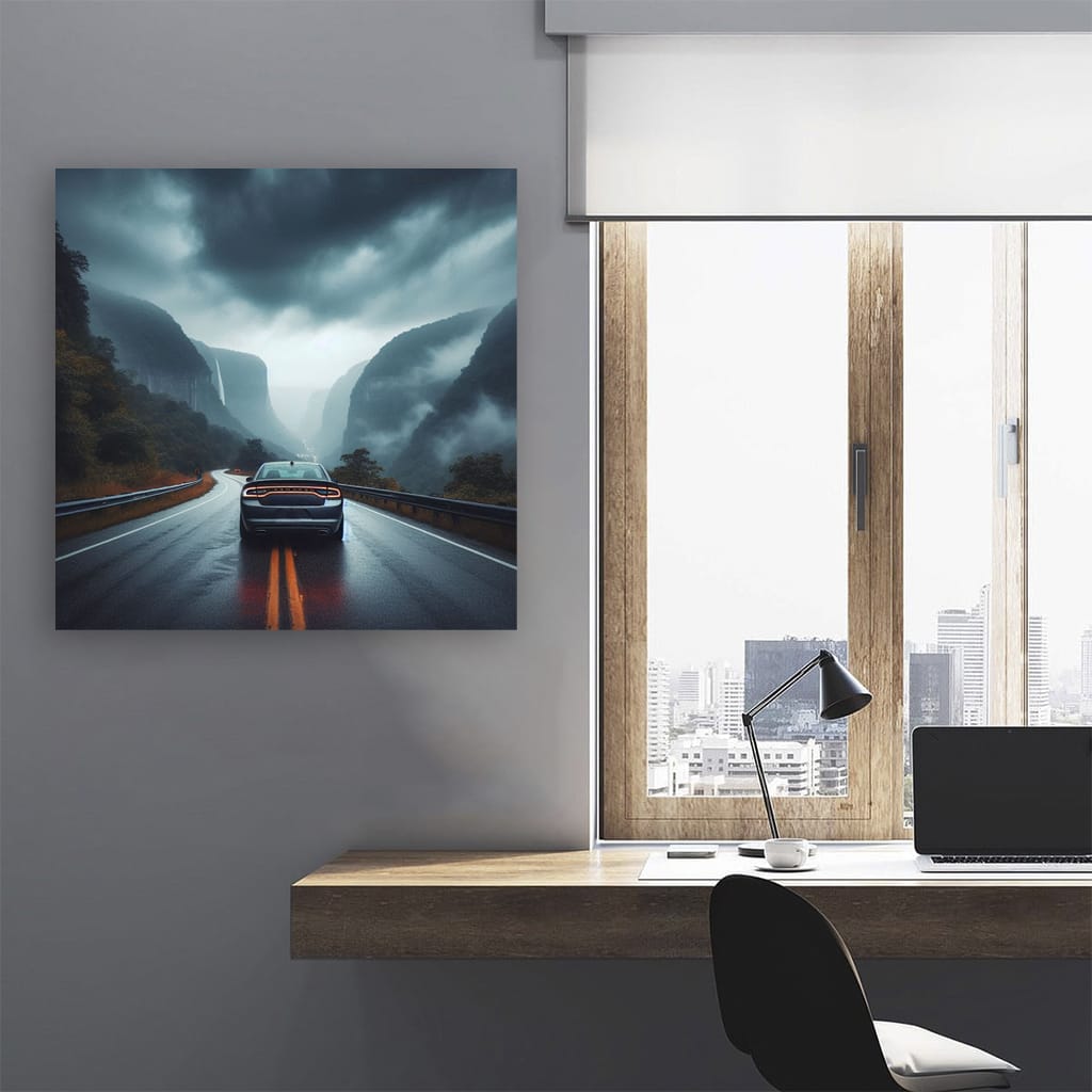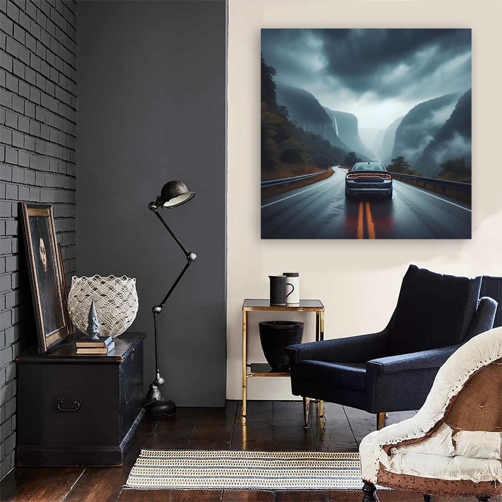This painting is a real beast in the world of wall art. The Dodge in the poster roars under the gloomy clouds, as if it just escaped from hell. This is art for those who like power and speed, and not delicate watercolors. True manly style! See more from the collection: Dodge Art
