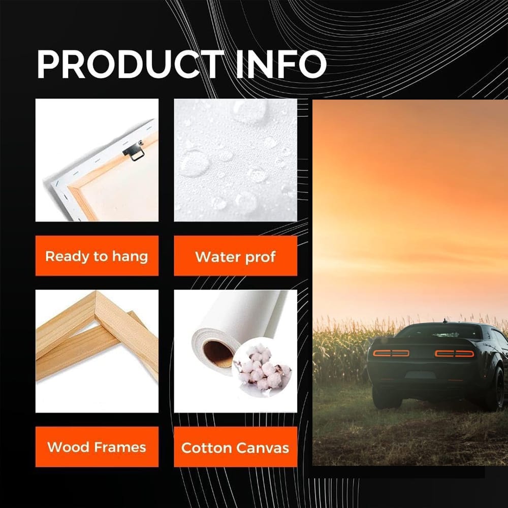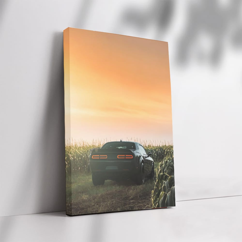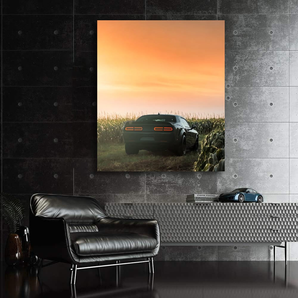 This painting is like adrenaline in the veins. With the good old Dodge in the foreground, it conveys all the power and spirit of real cars. Wall art for true fans who know what speed and freedom are. This poster is your personal garage on the wall. See more from the collection: Dodge Art